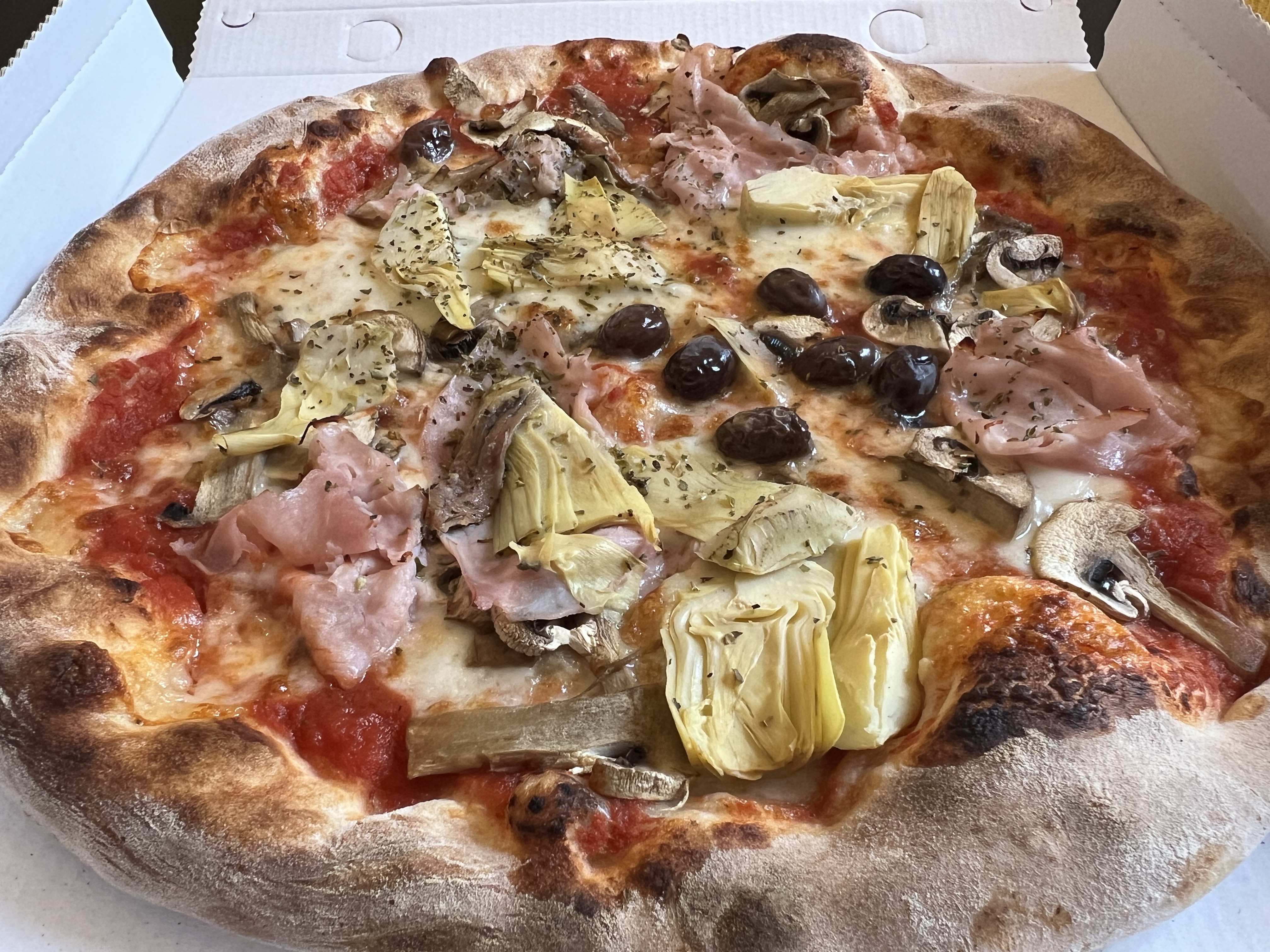 回到公寓第一件事就是打開冷氣,然後把飲料和提拉米蘇冰進冰箱,沒想到這麼簡單的兩個操作就跳電了!還好總開關很好操作,關掉一分鐘再重開,趕緊把冷氣關掉,沒想到我走到浴室開了燈又跳電了!看來是冰箱正在努力運作的時候不能增加其他負載,這負載量也太低!而且連續跳電導致網路路由器居然當掉了!還關機了一段時間讓他冷靜一下,十多分鐘後總算是把一切安頓好,可以開吃了!披薩上面有火腿黑橄欖和朝鮮薊,朝鮮薊吃起來有夠像筍乾!基底除了番茄和起司外還加了鯷魚,和筍乾搭起來很好吃!