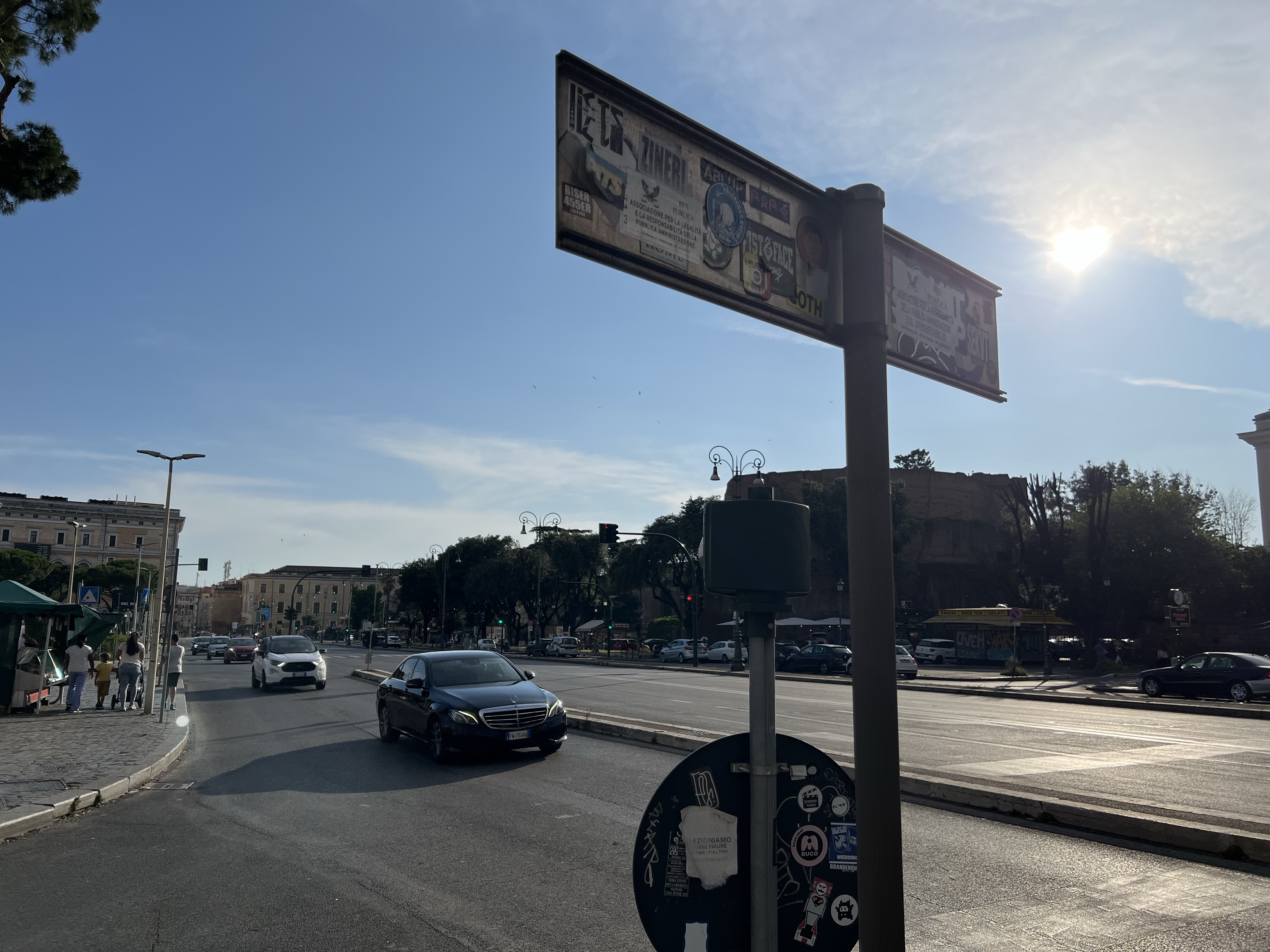 羅馬街上除了鴿子外,還有非常多的海鷗。海鷗就像會飛的野狗一樣,嘎嘎叫搶東西吃,站在街邊的車頂上,鴿子根本打不贏。路邊的車子時不時會停到人行道上來,還有計程車會直接停在轉角處,是台灣人熟悉的風景。