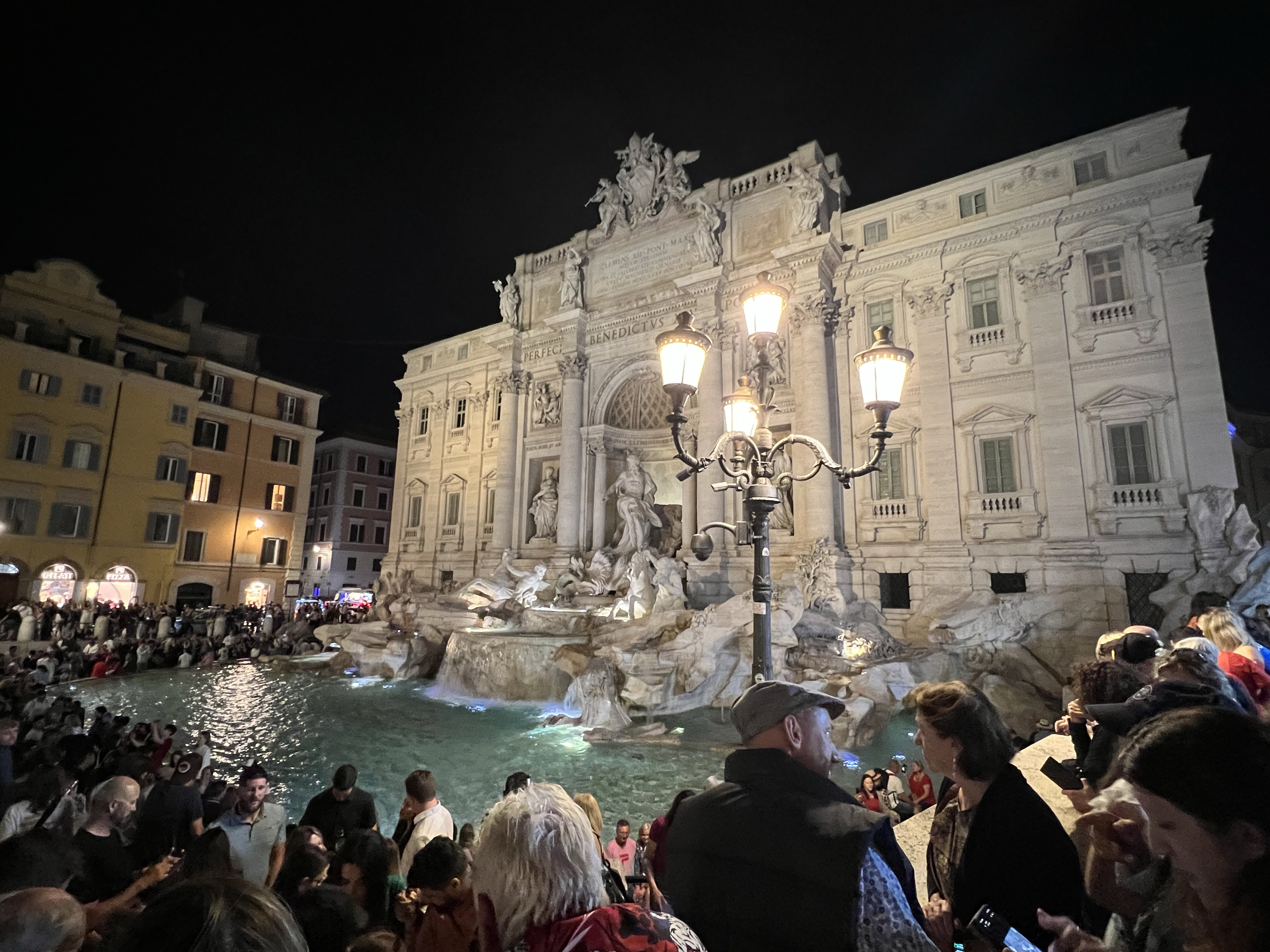 走到附近的特雷維噴泉,人潮更是誇張,遠看根本不見噴泉本人,旁邊的一群台灣人也說白天晚上根本就沒差,永遠都是人山人海。我找了個空隙站上台階自拍了幾張,噴泉裡現在好像不能丟硬幣了,老實說我也不太確定實際上是要看些什麼,人實在太多就趕緊閃人了。