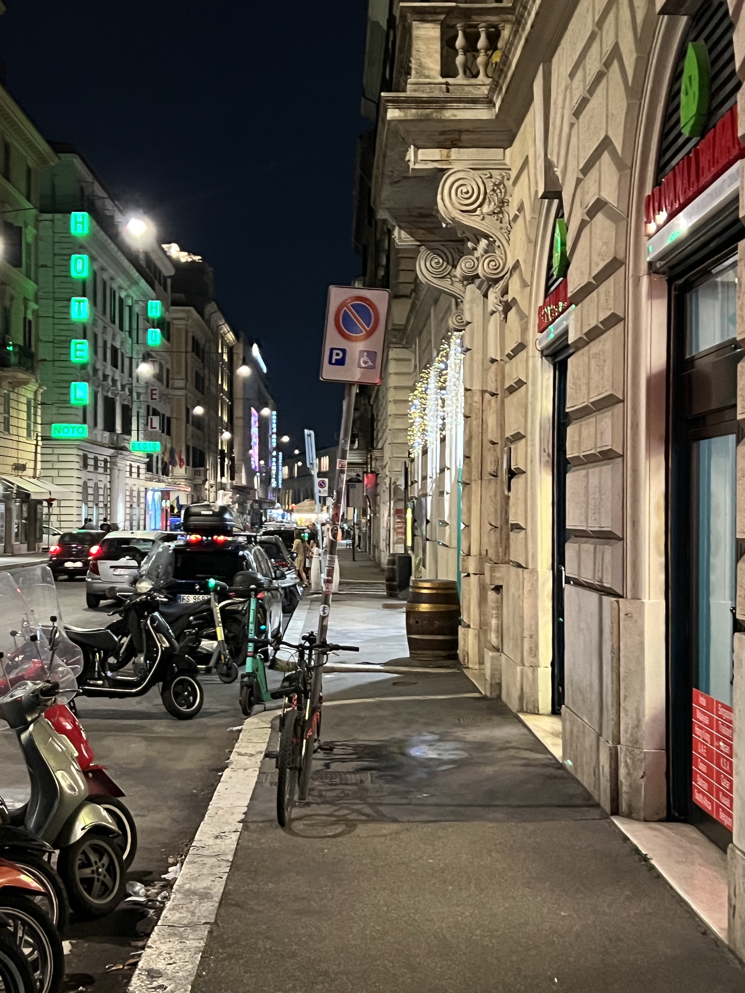 走回公寓的路上先經過位在一個小台地上的義大利總統府,可以看到遠處打燈了的梵蒂岡聖保祿教堂。之後經過一個位於轉角的小池子,牆面上有生動的浮雕,轉頭看發現這個十字路口的四個角都各有一個不同浮雕的小池子,對面是一座教堂,查地圖才知道是個有名的教堂「四泉聖嘉祿堂」。繼續走經過了幾間大使館和義大利國防部之類的行政機關,路上也漸漸沒了遊客,沒多久就回到公寓了。