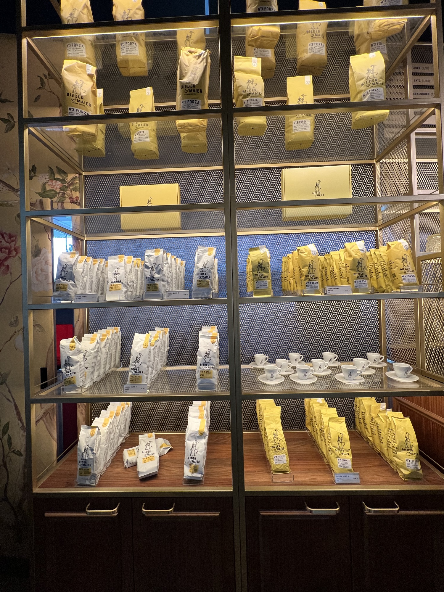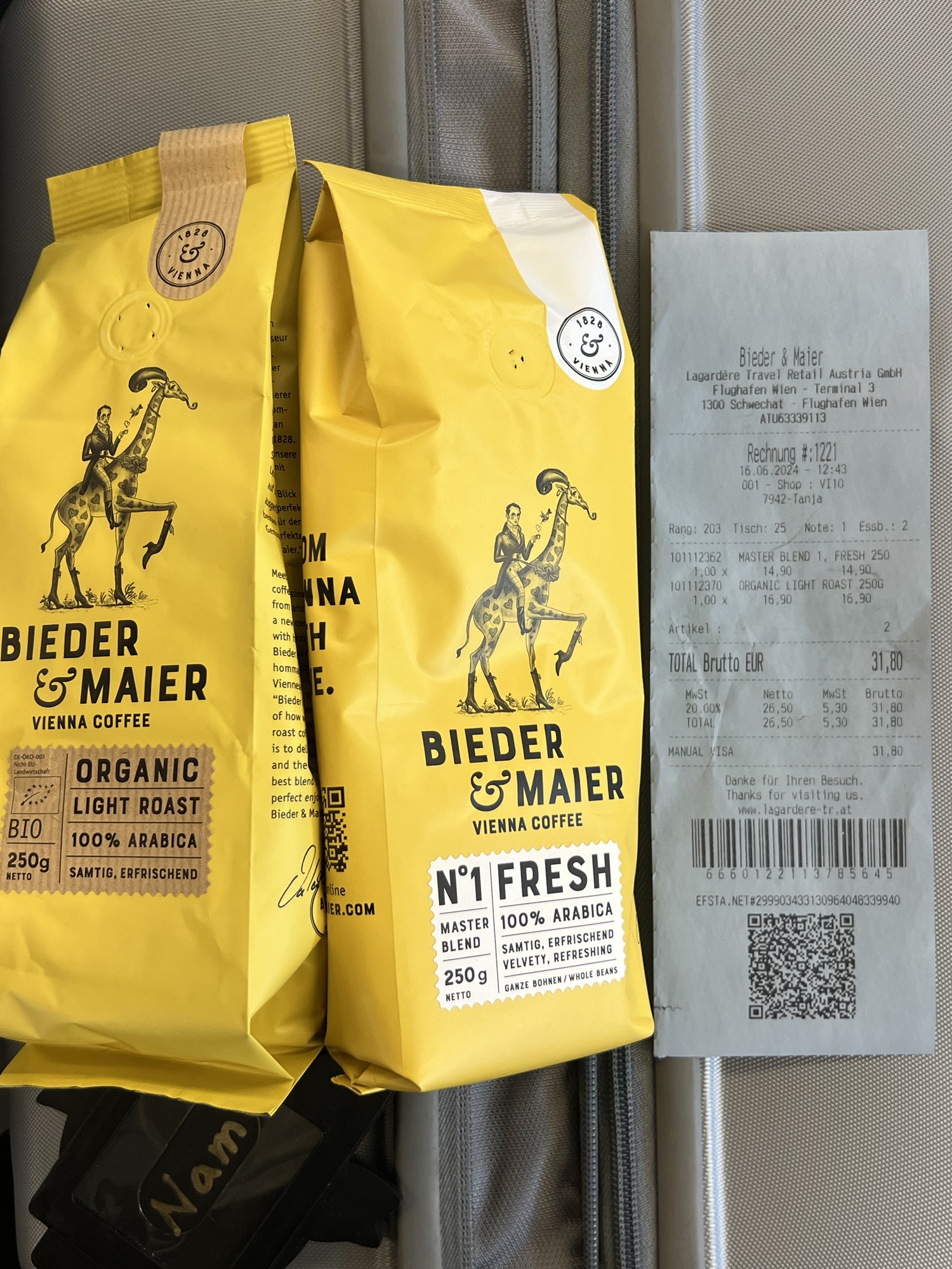 就這樣過了中午,長榮的報到櫃檯依然還沒開,看到二樓有間維也納咖啡廳就進去看看,裡面有賣各種風味的豆子,半磅大概15歐,不太便宜,但因為太閒又不舒服所以就亂花錢買了兩包。