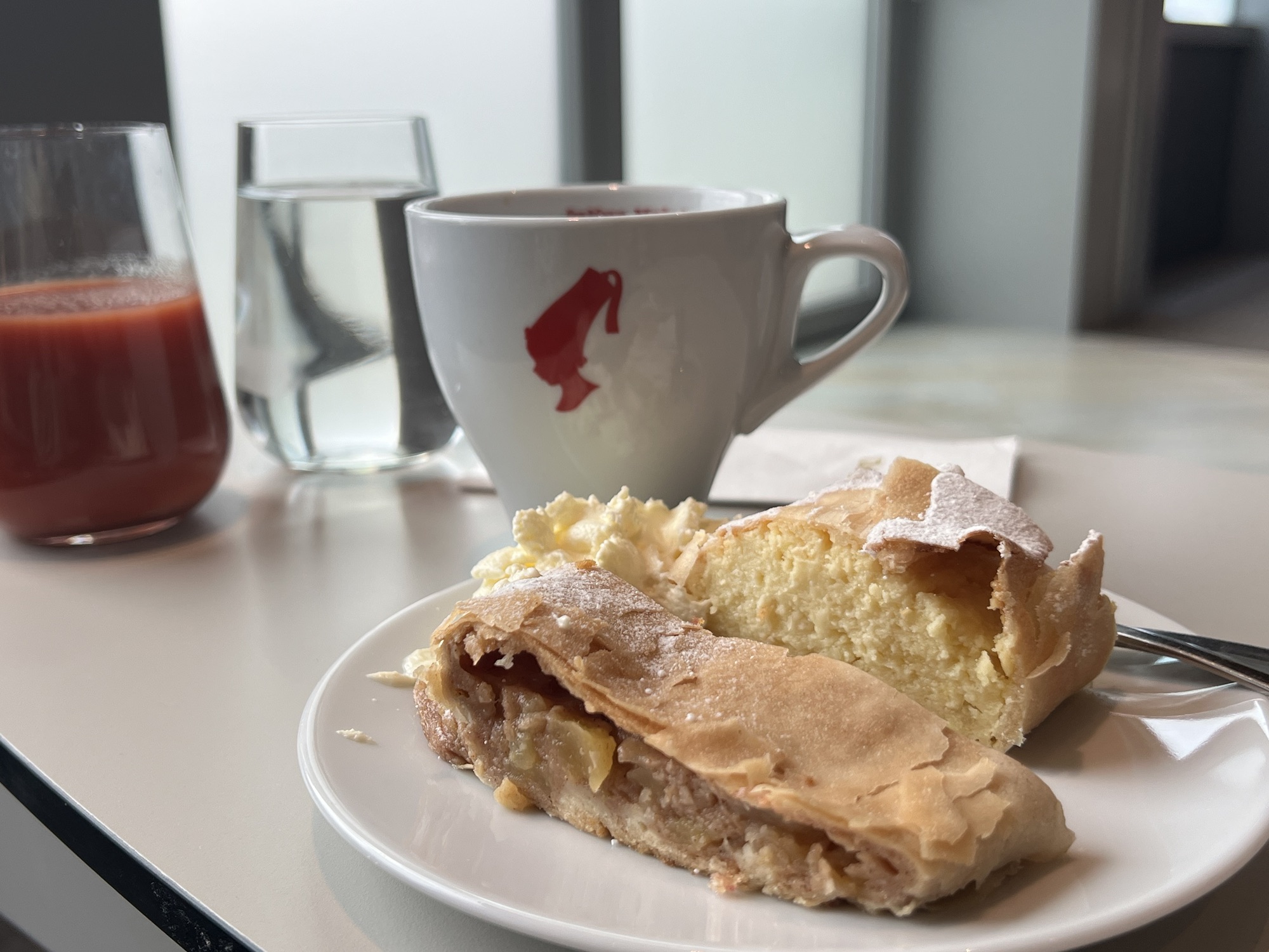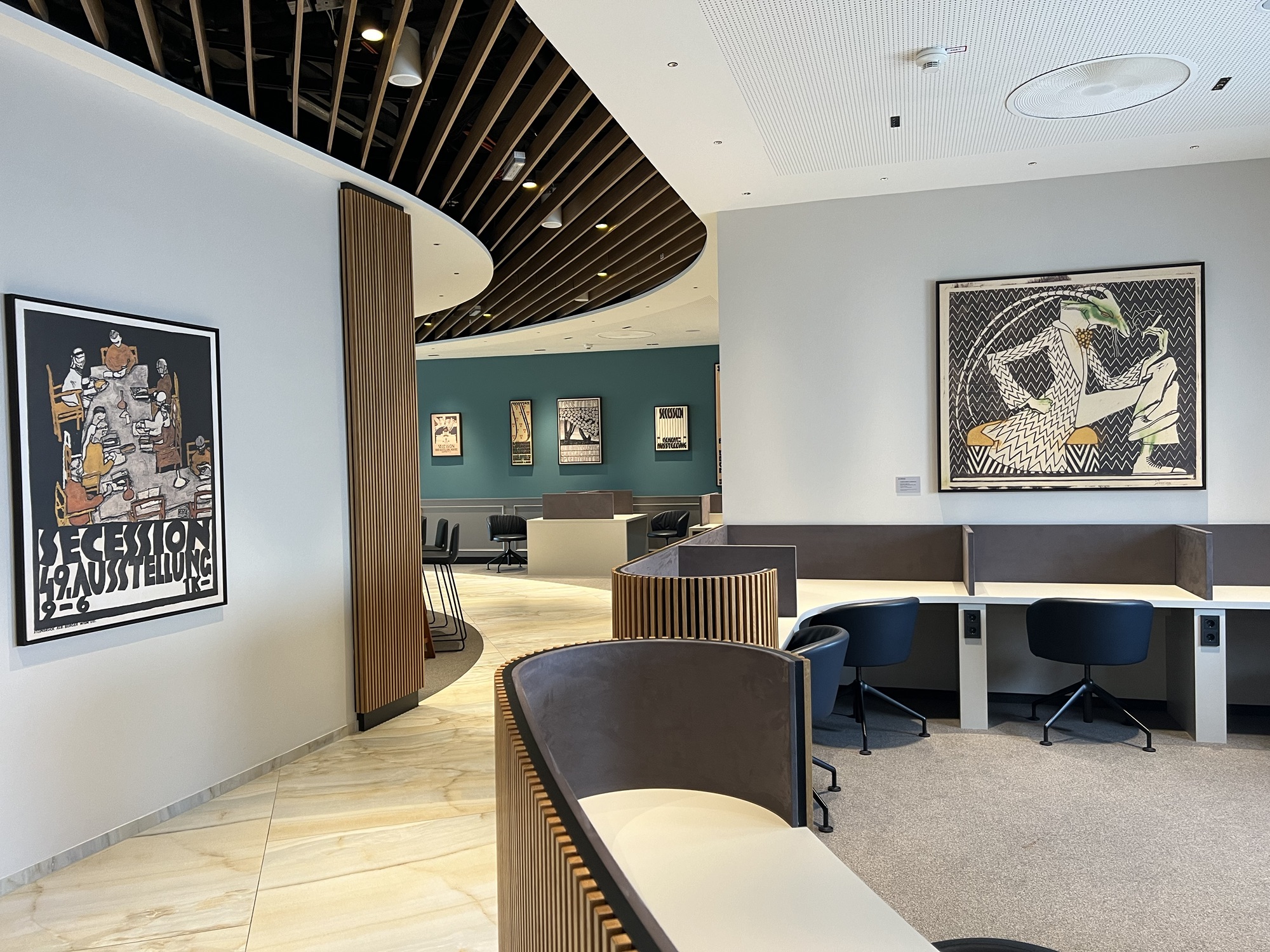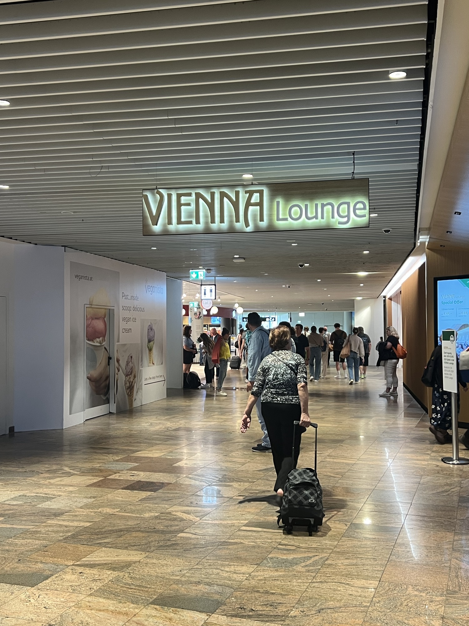 安檢後來去貴賓室坐坐,長榮給的是新開的Vienna lounge,看來奧地利航空不想給別家航空進去他們自家主場的貴賓室,特地搞了一個新貴賓室讓外人跟自家人分開。安檢過後右轉上二樓就到了,空間也不小,餐點和飲料也算齊全,冷食熱食甜點該有的都有,也有展現出奧地利的特色料理。窗邊有一排位置能看飛機,甚至還有外面的露台可以曬太陽,只可惜一堆人在那邊抽煙。還有一區辦公區,旁邊掛了一堆分離派的海報,沒什麼人。貴賓室裡有很多同樣來參加EULAR的台灣風濕科醫師前輩,我一個社恐,就躲到正在直播歐國盃足球賽的小房間裡去。拿了幾個好消化的甜點配熱茶,還吃了到處可見但從來沒吃過的巧克力香蕉,一直以為裡面是香蕉蛋糕,沒想到裡面是香蕉本人!還是有點酸味的香蕉,配上巧克力真是絕配!我太小看這東西了!還好剛剛在超市有買一包!