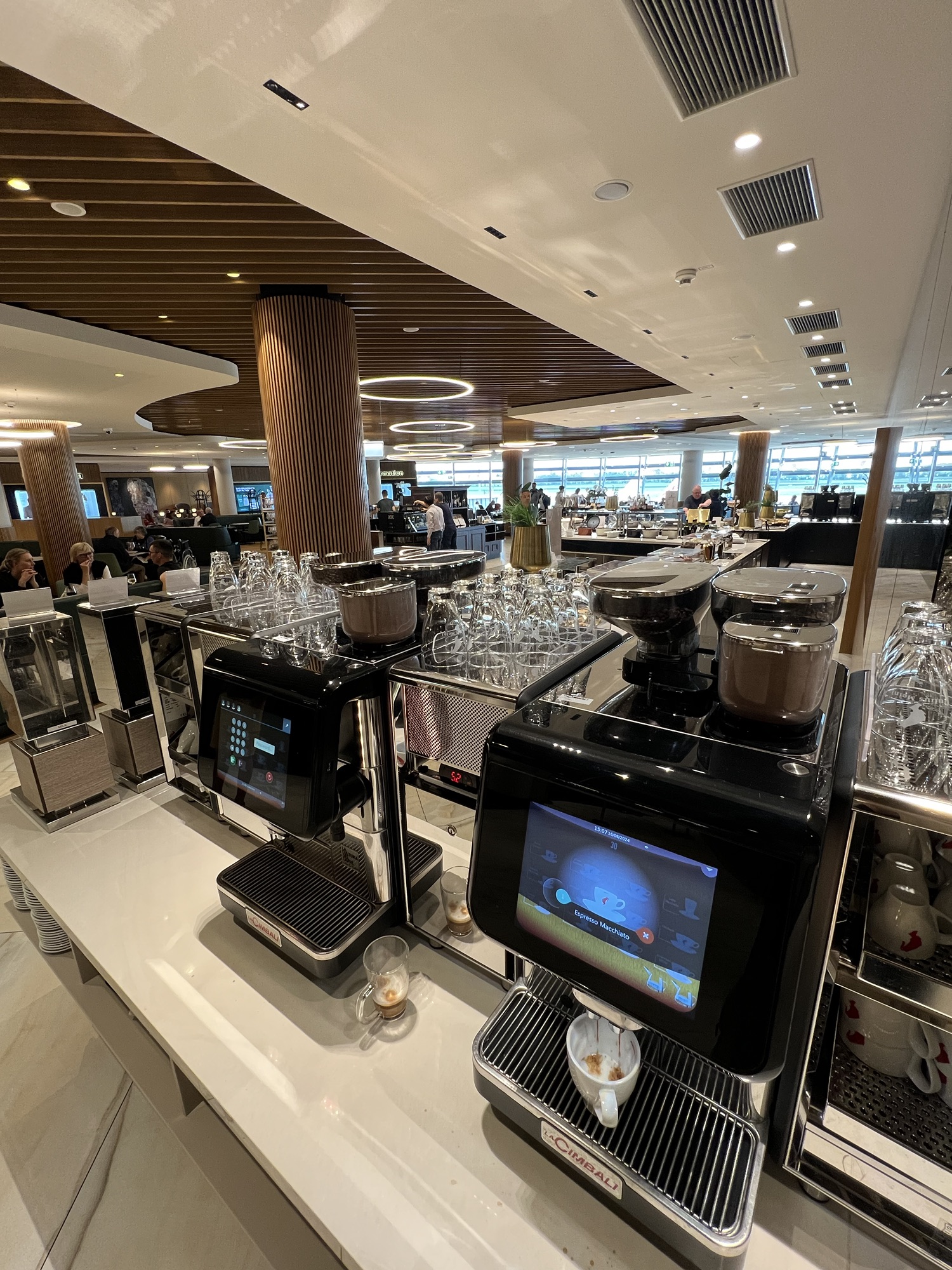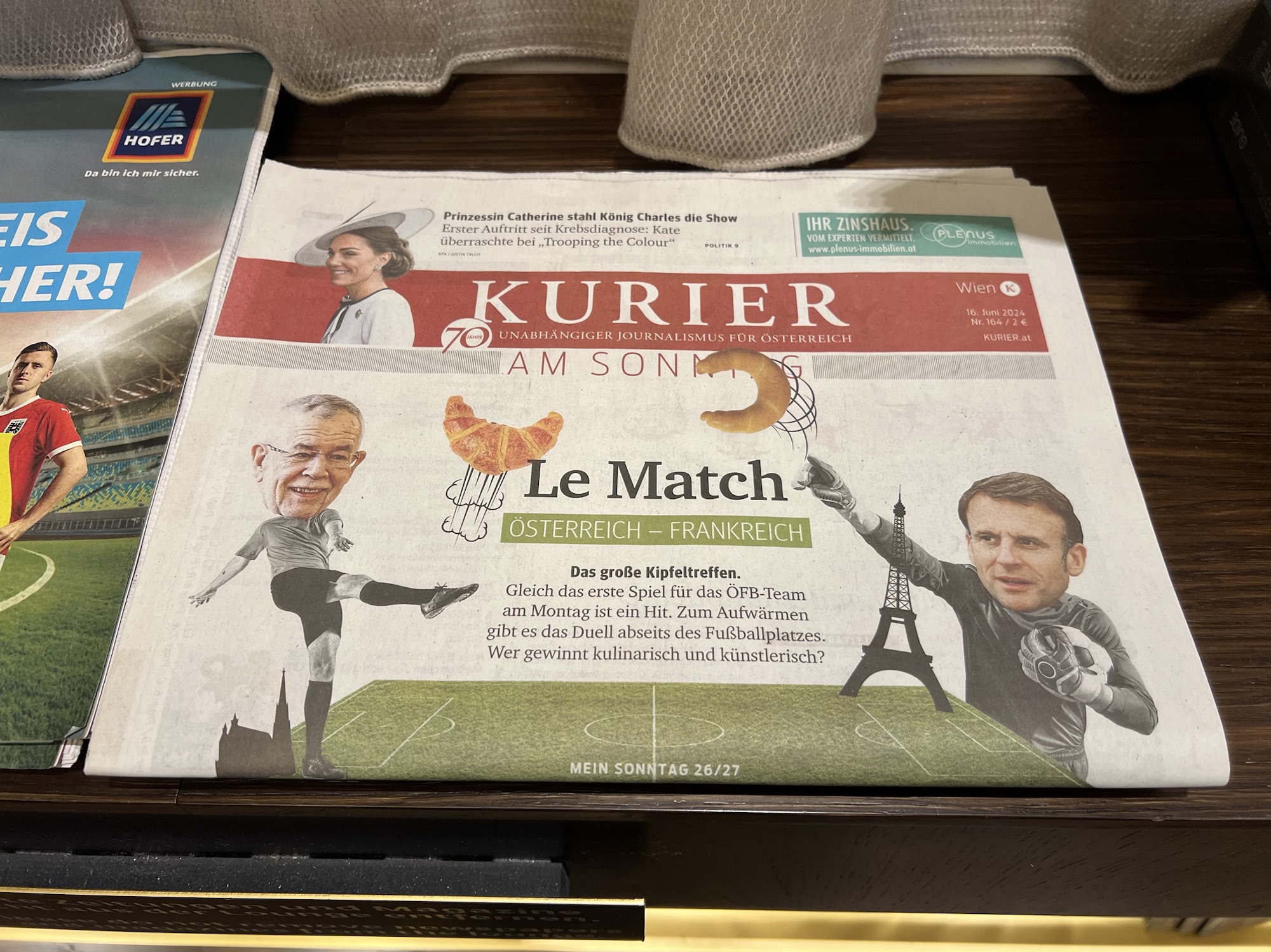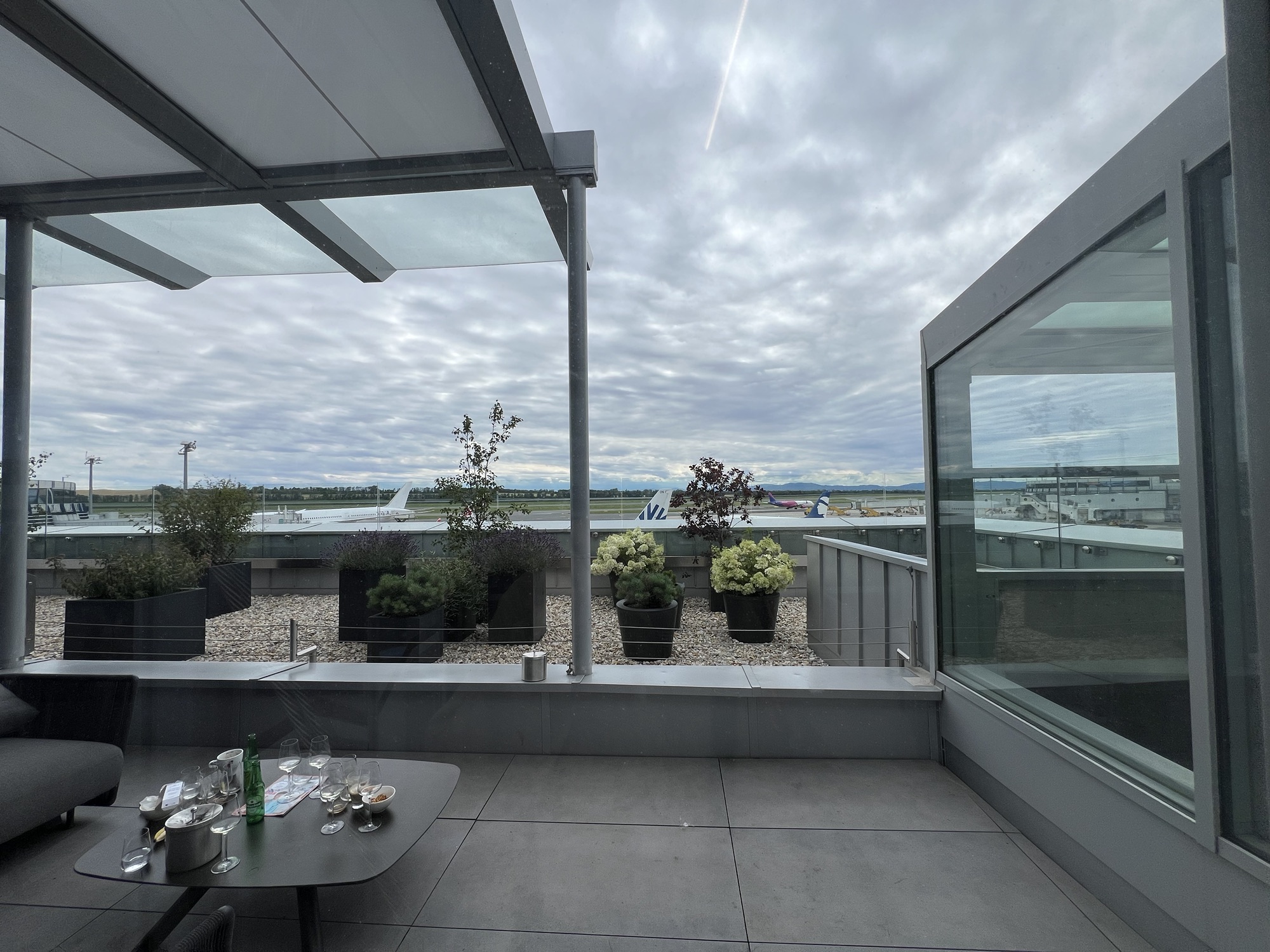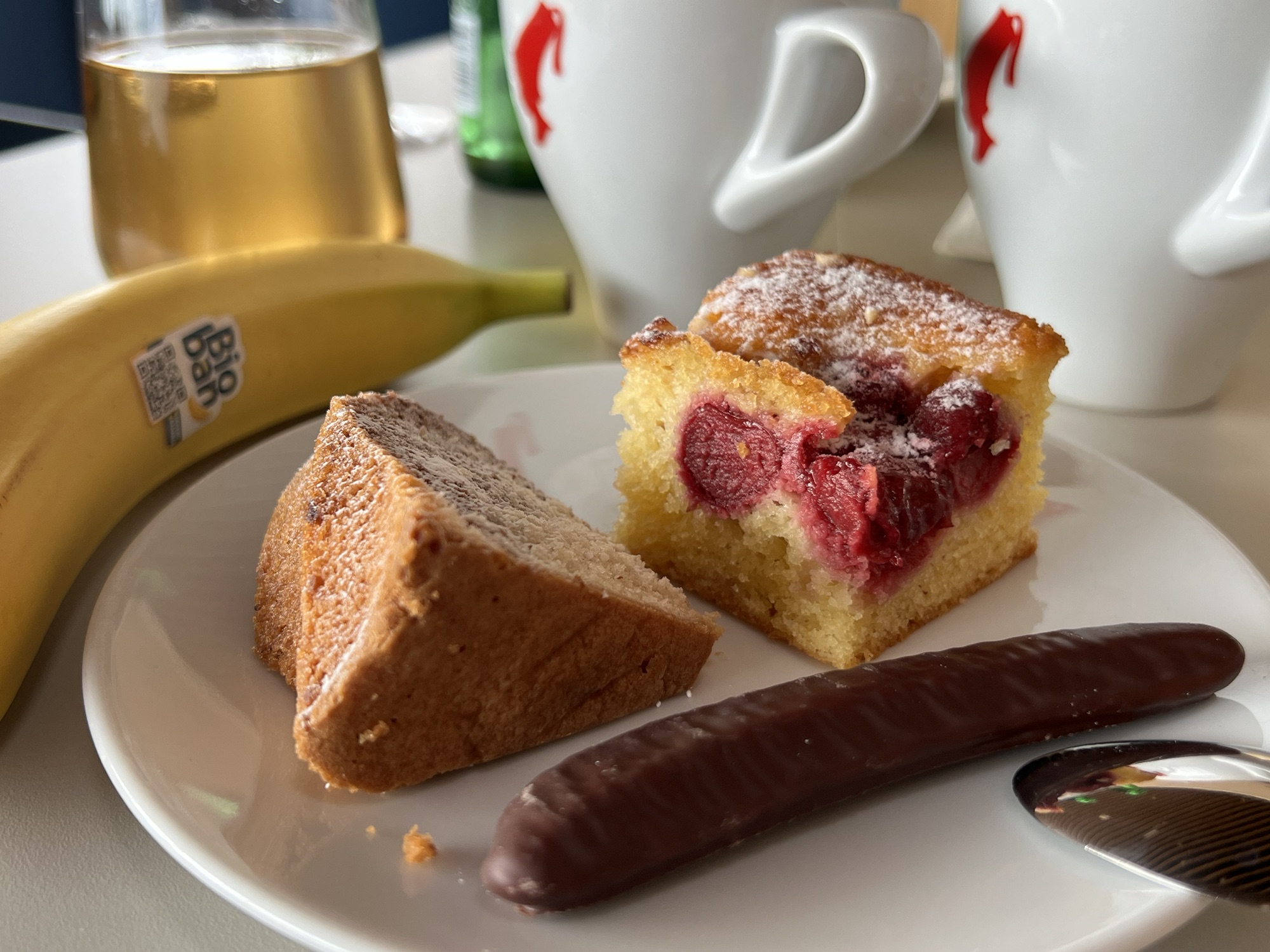安檢後來去貴賓室坐坐,長榮給的是新開的Vienna lounge,看來奧地利航空不想給別家航空進去他們自家主場的貴賓室,特地搞了一個新貴賓室讓外人跟自家人分開。安檢過後右轉上二樓就到了,空間也不小,餐點和飲料也算齊全,冷食熱食甜點該有的都有,也有展現出奧地利的特色料理。窗邊有一排位置能看飛機,甚至還有外面的露台可以曬太陽,只可惜一堆人在那邊抽煙。還有一區辦公區,旁邊掛了一堆分離派的海報,沒什麼人。貴賓室裡有很多同樣來參加EULAR的台灣風濕科醫師前輩,我一個社恐,就躲到正在直播歐國盃足球賽的小房間裡去。拿了幾個好消化的甜點配熱茶,還吃了到處可見但從來沒吃過的巧克力香蕉,一直以為裡面是香蕉蛋糕,沒想到裡面是香蕉本人!還是有點酸味的香蕉,配上巧克力真是絕配!我太小看這東西了!還好剛剛在超市有買一包!