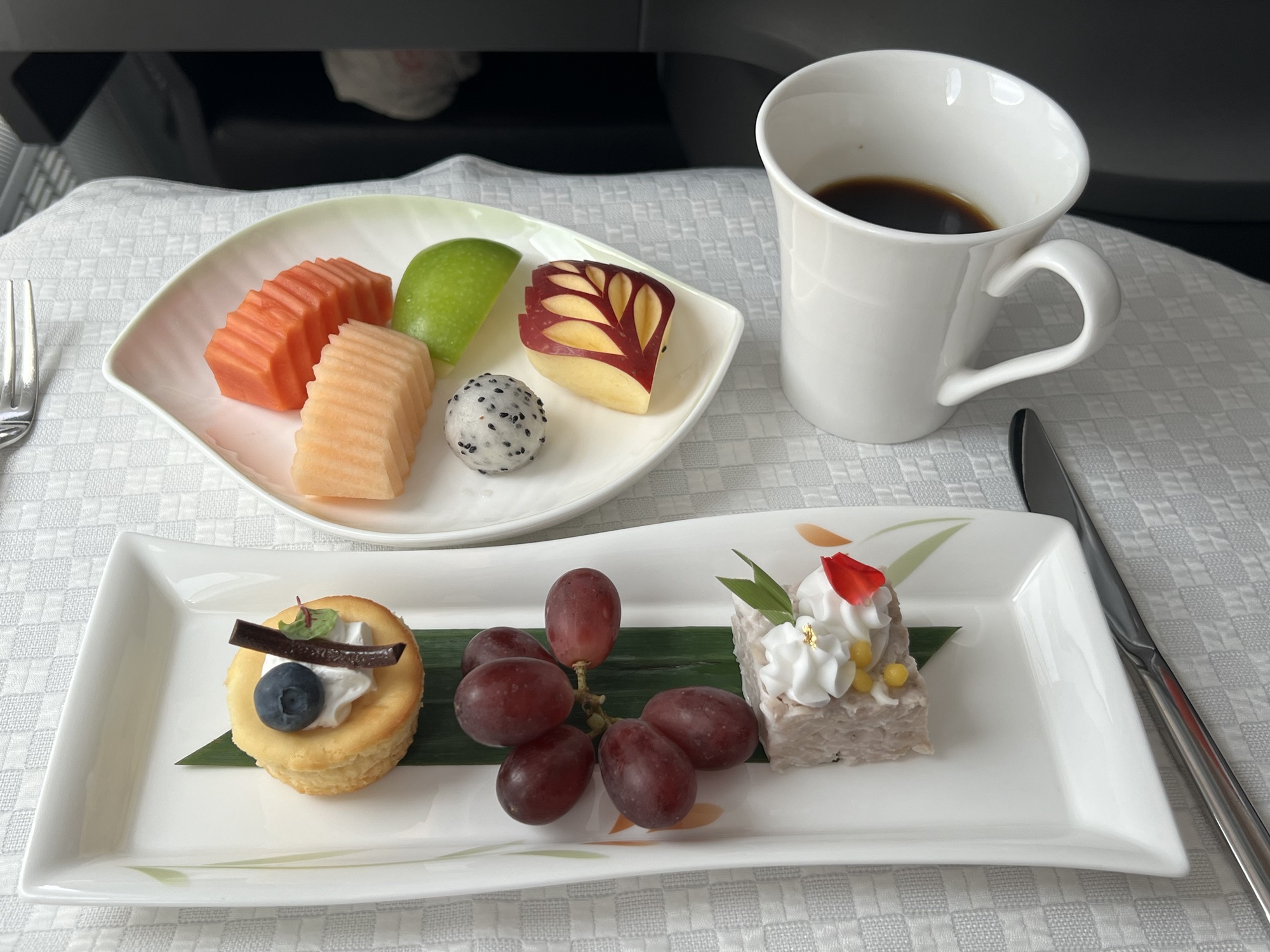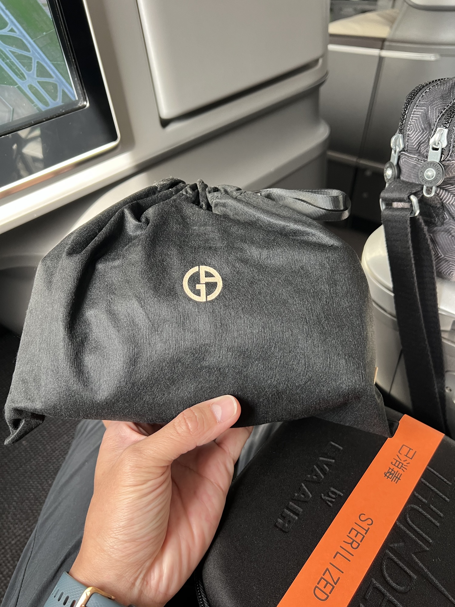 回程的飛機是新款的787-10,位子方正又寬敞,比較不會卡腳,長程航班真的是要慎選機型!還拿到新款的Armani過夜包,質感很不錯。