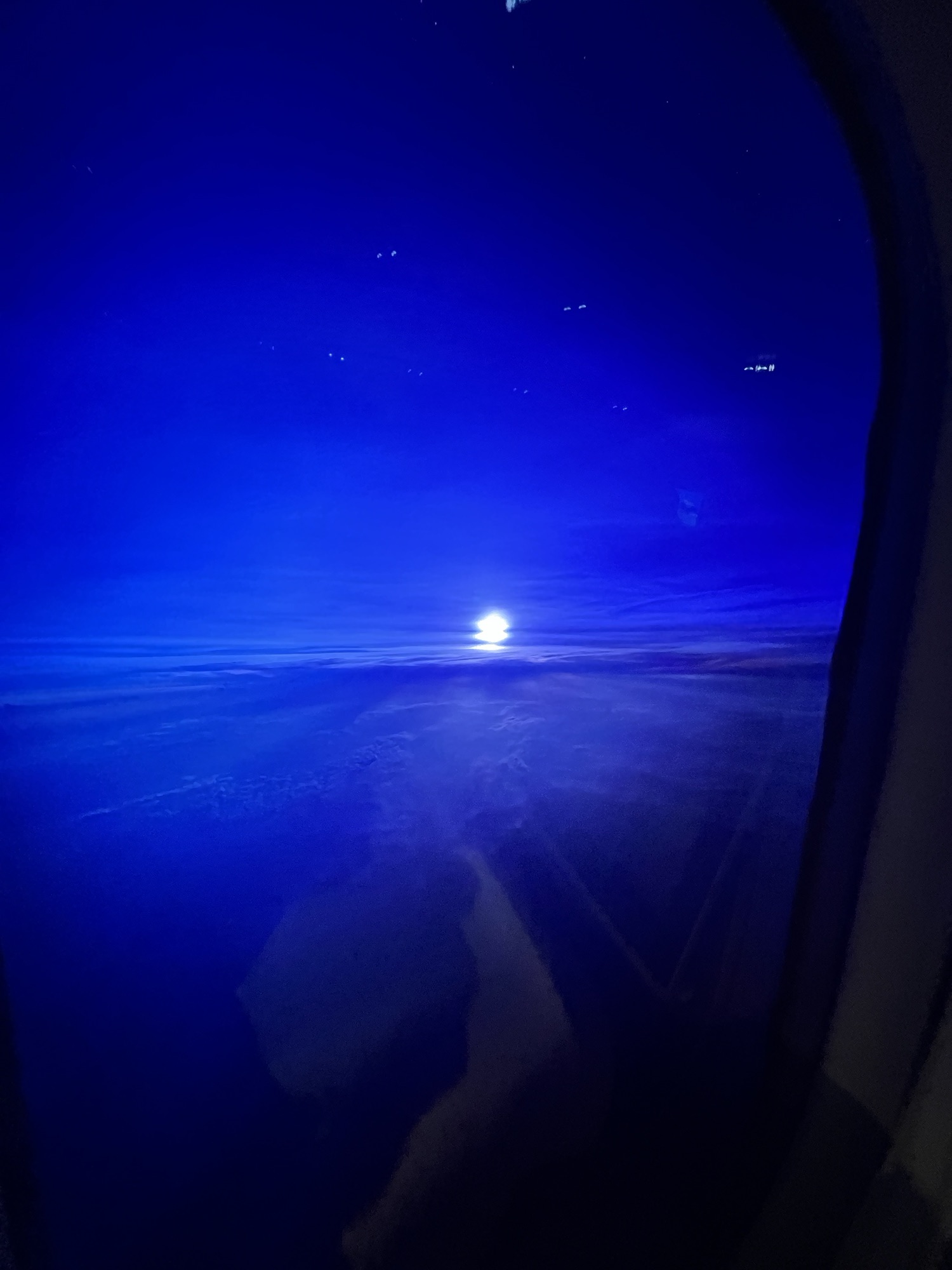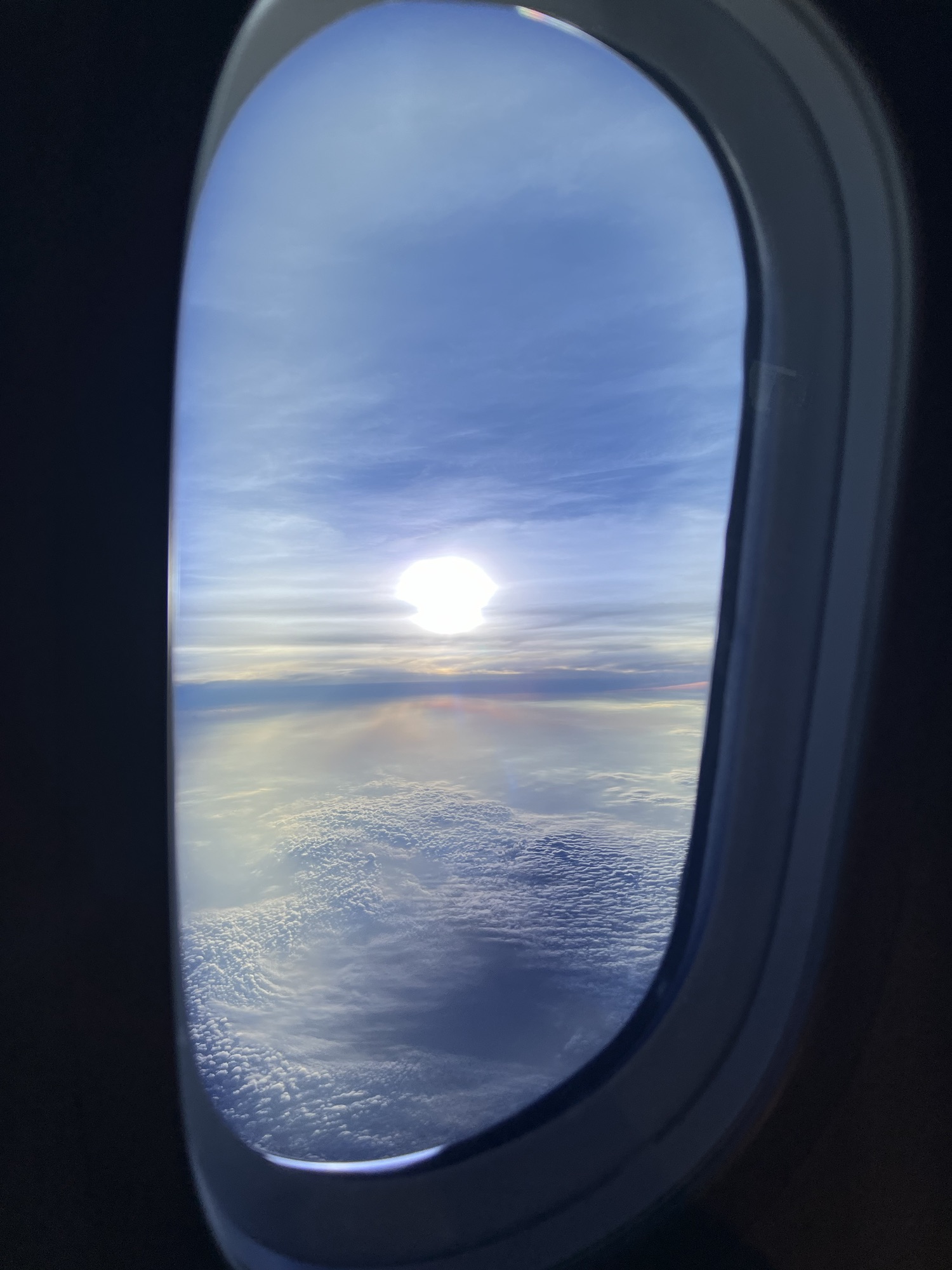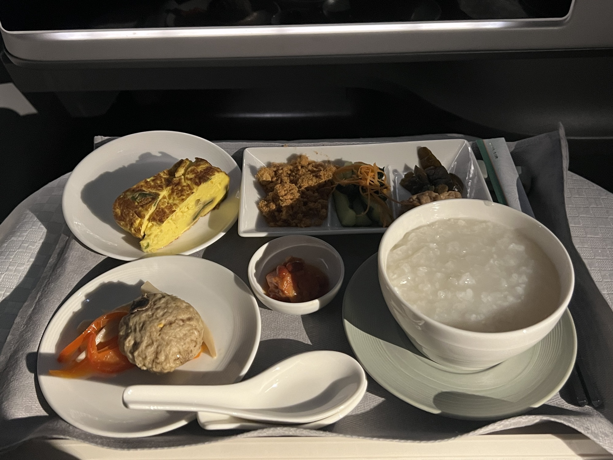 勉勉強強淺淺睡了四個小時,醒來看到窗外太陽剛從地平線上升起,差不多是吃早餐的時間了,請空姐幫我把原本預訂的法式吐司換成清粥,吃一吃還是比較舒服。