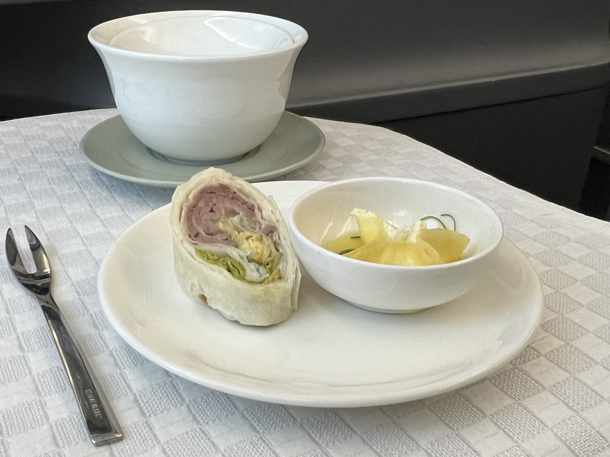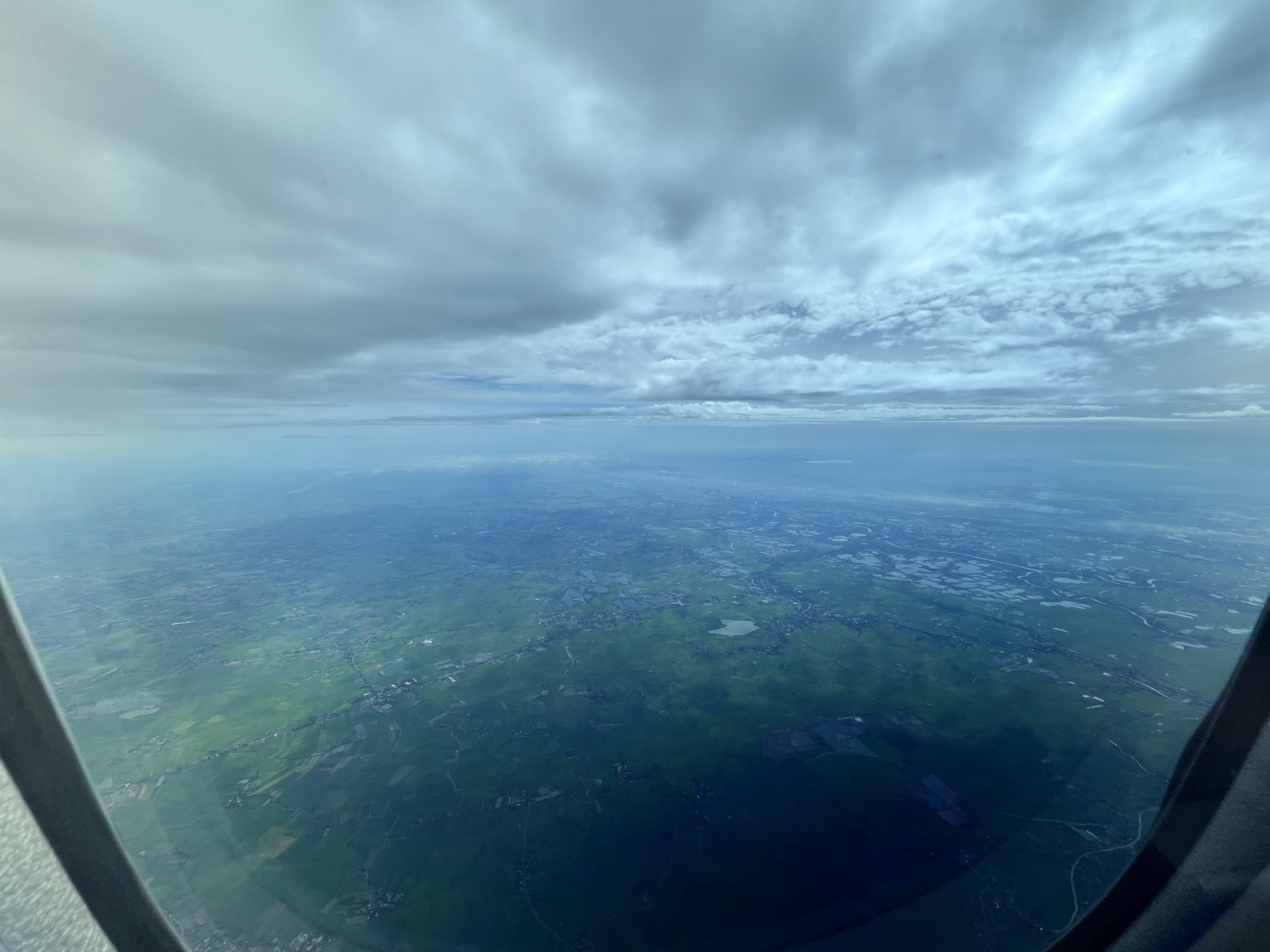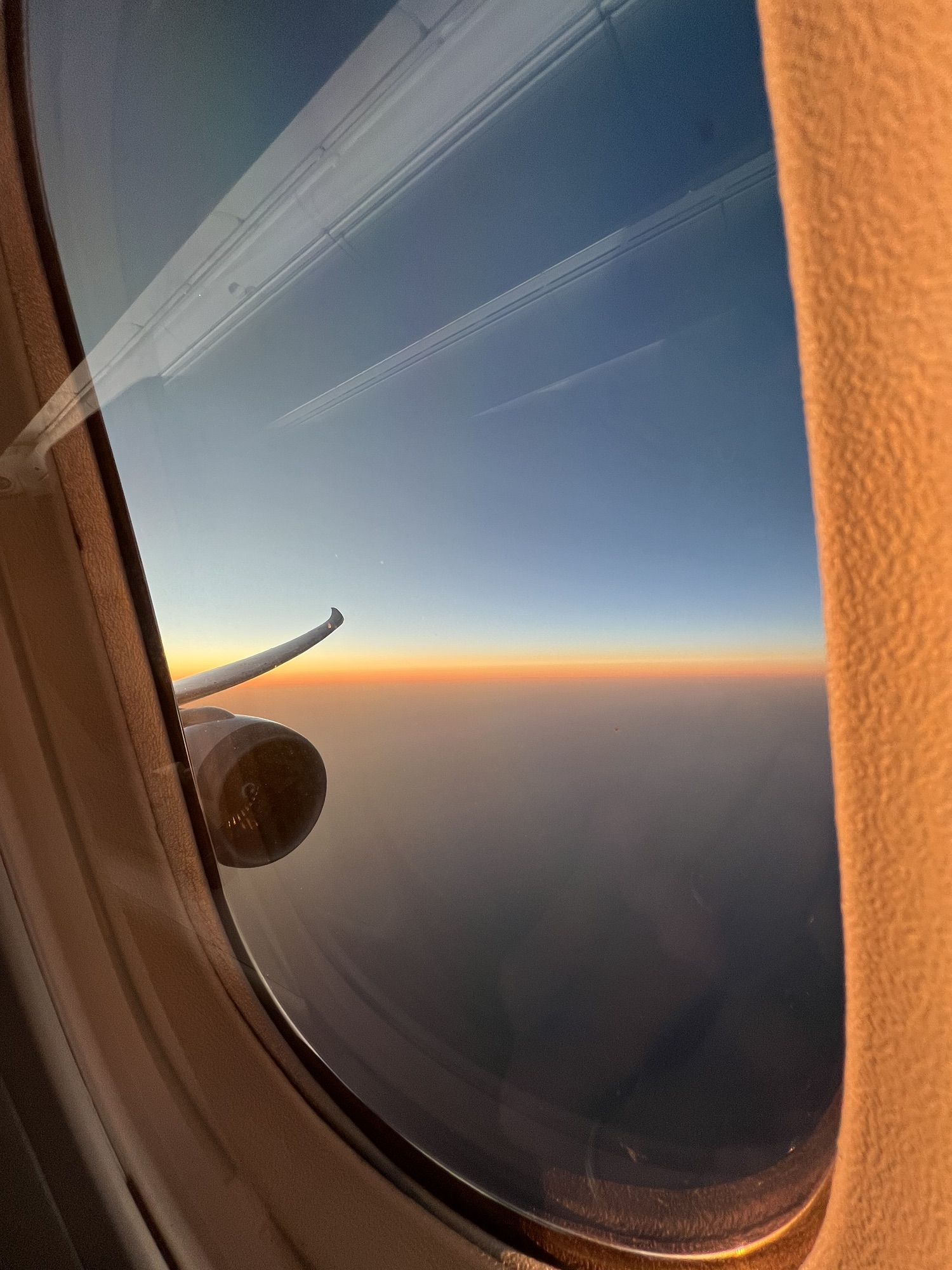 勉勉強強淺淺睡了四個小時,醒來看到窗外太陽剛從地平線上升起,差不多是吃早餐的時間了,請空姐幫我把原本預訂的法式吐司換成清粥,吃一吃還是比較舒服。