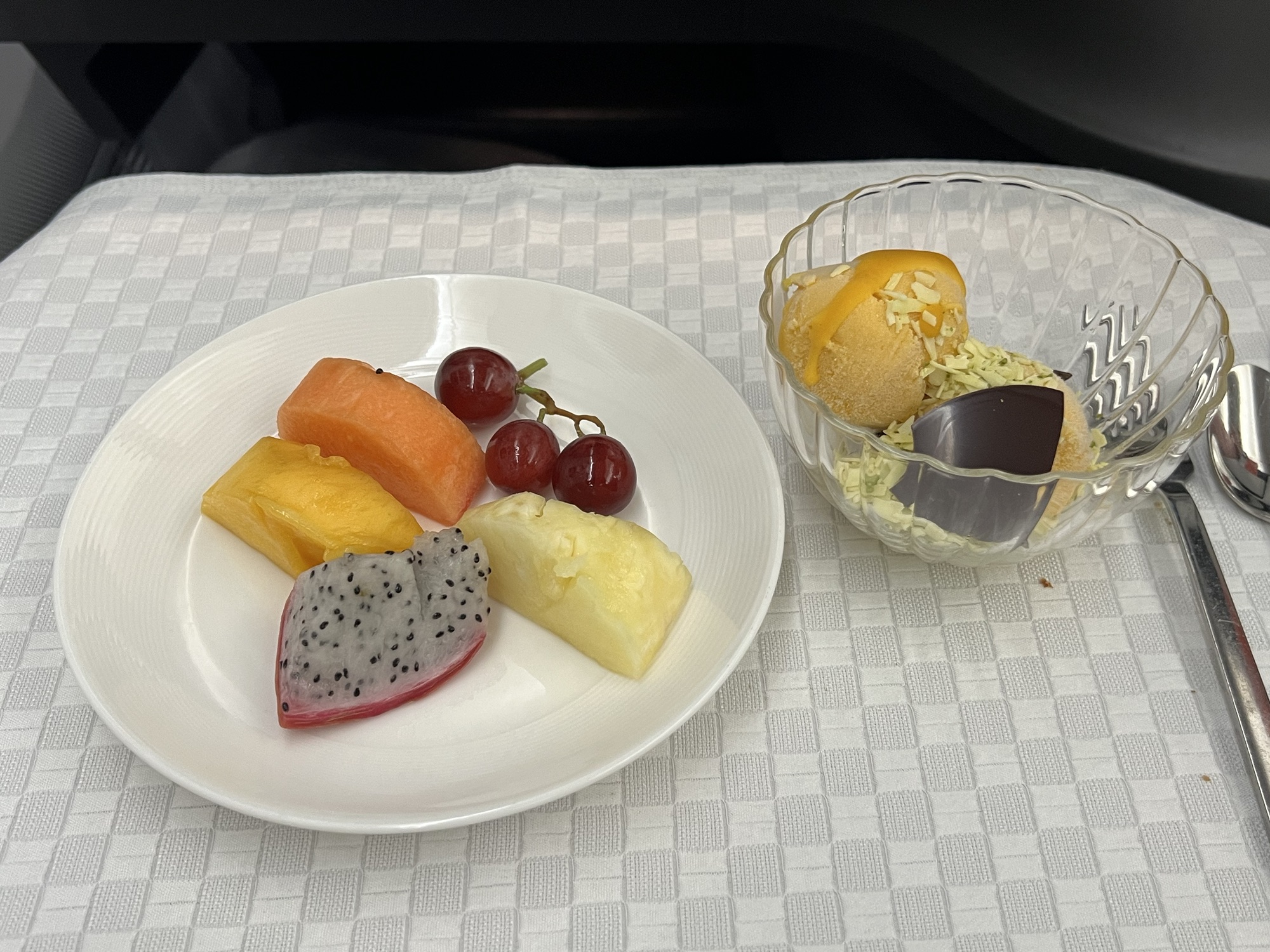 我整個人在機上還是很不好,雖然每四個鐘頭就吃一次藥還是微痛苦,主餐的羊小排雖然感覺很美味,但我只當成熱量補充吃掉;倒是餐後的芒果冰淇淋我很喜歡(雖然很硬)。吃飯時看了一直沒看的La La Land,結果就像茹茹預測的一樣,我不喜歡,我覺得這就是有夢想就會成功的理想主義,而且他們之間的愛情對我而言只是失敗者間的取暖,沒有什麼真正的羈絆,因此最後結尾對我來說也沒什麼惆悵的。