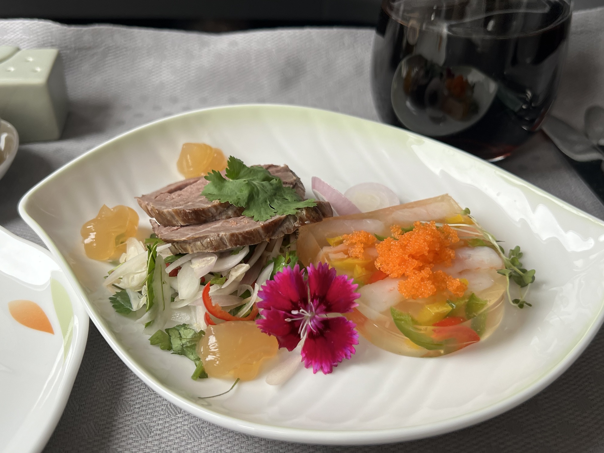 早上九點抵達曼谷,需要先下機後過兩個小時再重新登機,還好貴賓室離登機口很近,快速過安檢就又窩進泰航的貴賓室裡,裡面服務人員超多,每個餐檯旁都有一兩個人,壓力有點大。餐點看起來很不錯,但沒什麼胃口,又喝了一罐通寧水自以為免疫治療,就窩在沙發上打遊記。