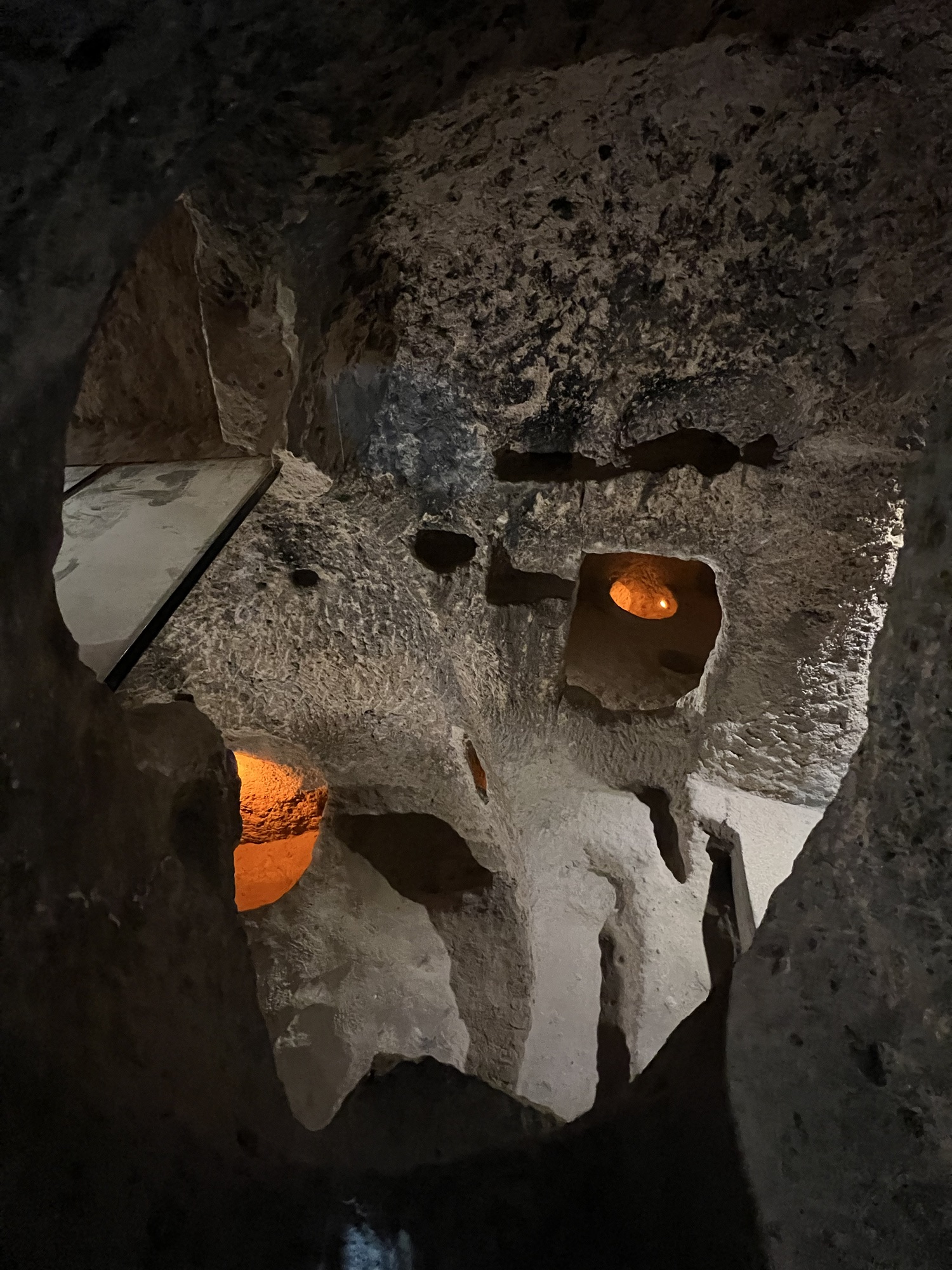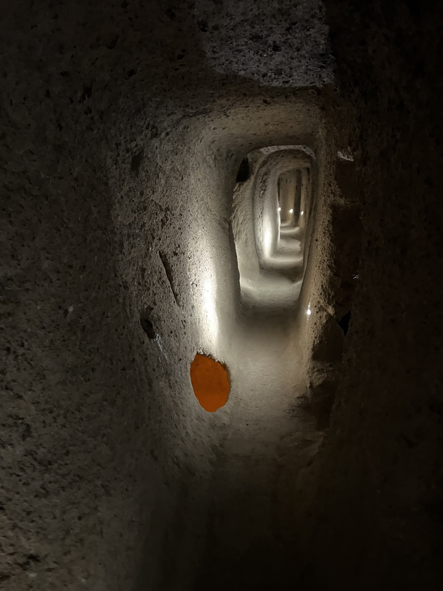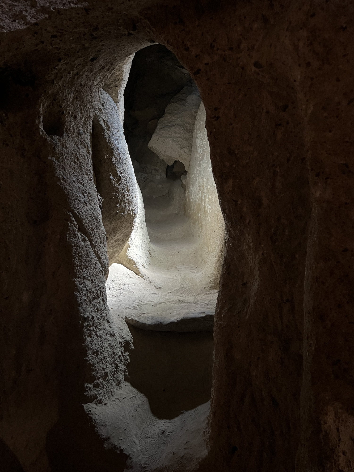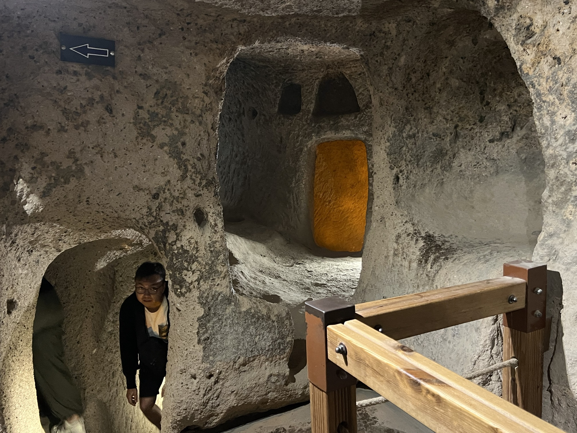 第一站是地下城,距離市區有點遠,大概一個小時的車程。地下城是羅馬帝國時代受迫害的基督教徒往西遷移至此,每當軍隊來襲就會躲進地下城裡避難,所以只是緊急庇護所,並不是日常使用。裡頭除了食物儲藏室和廚房廁所等生活空間外,還有可以用一個大圓盤石頭關閉的通道,中間還留了一個洞可以戳敵人。現在是土耳其的暑假時間,景點裡全都是人,在狹小的地下城裡尤其明顯。還好我們的身高走通道不用太低頭,還是能夠快速移動,茹茹移動速度之快很像上輩子住在這邊。地下城內上上下下的通道很容易不知道自己在哪一層,跟著指標走雖然不會迷路,但少了一點探索的樂趣。