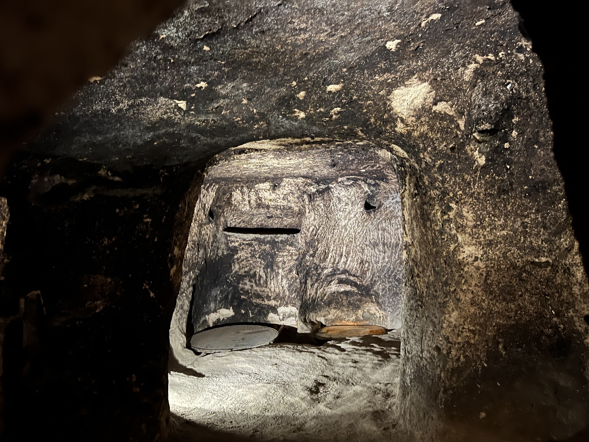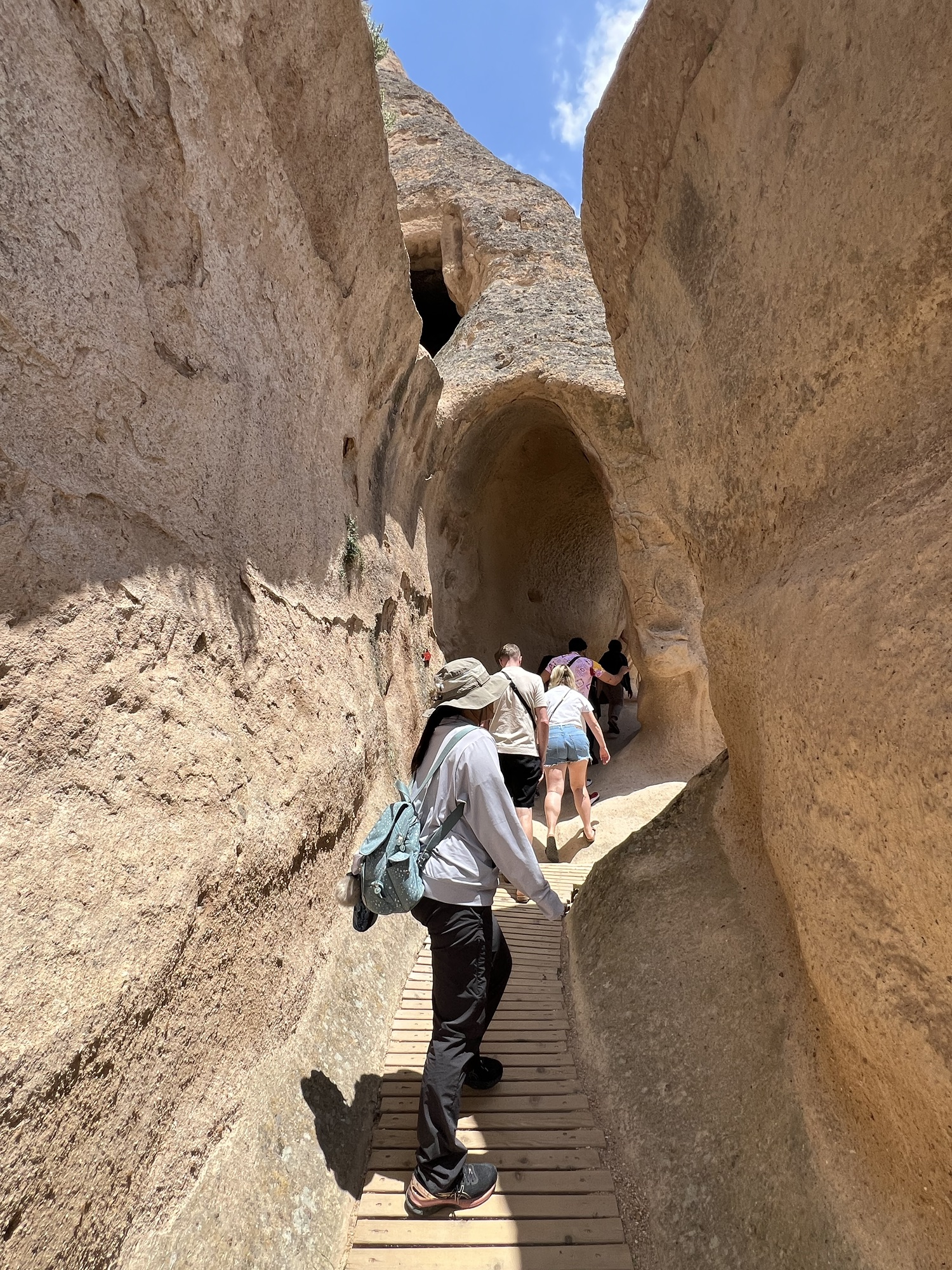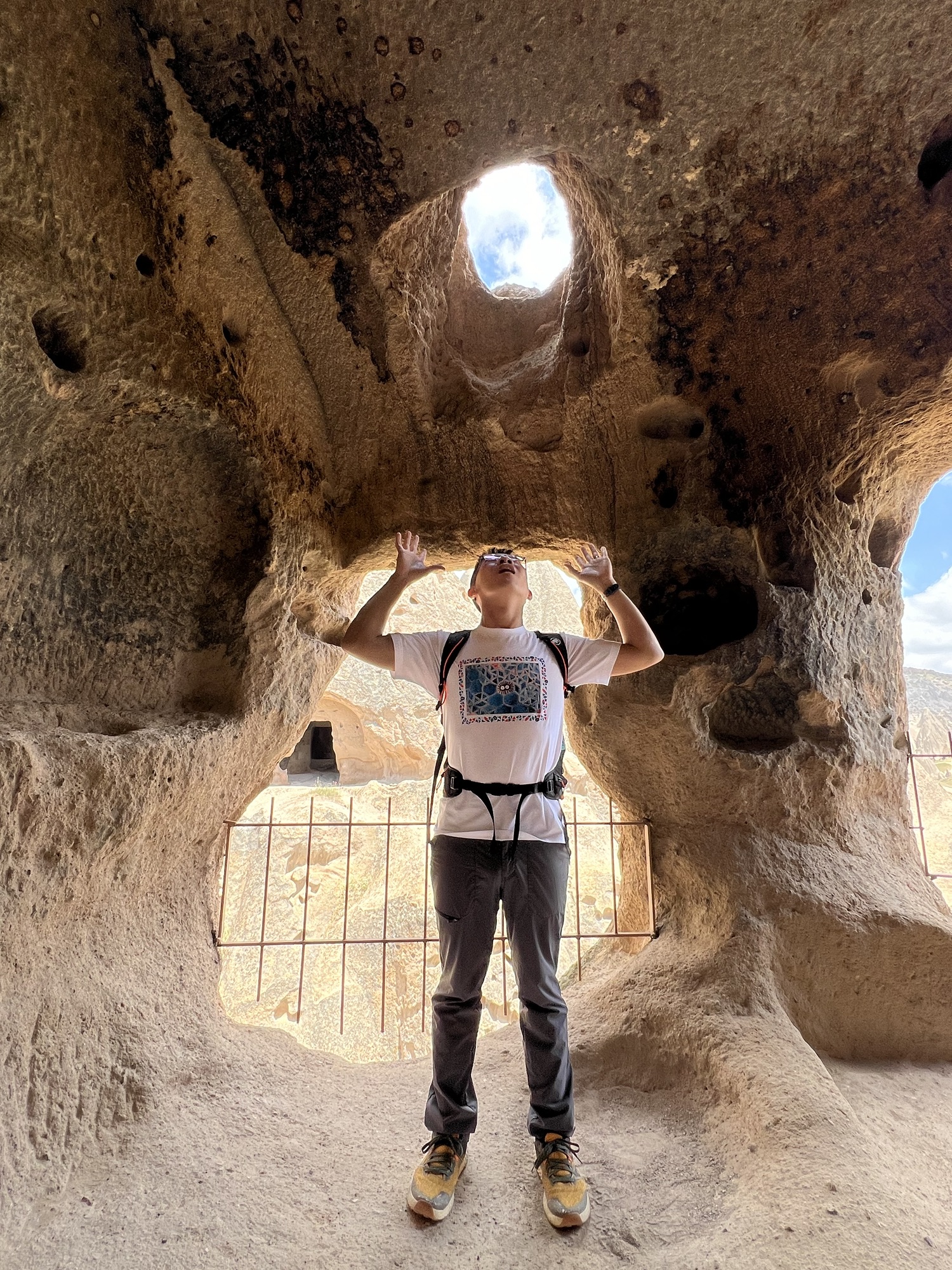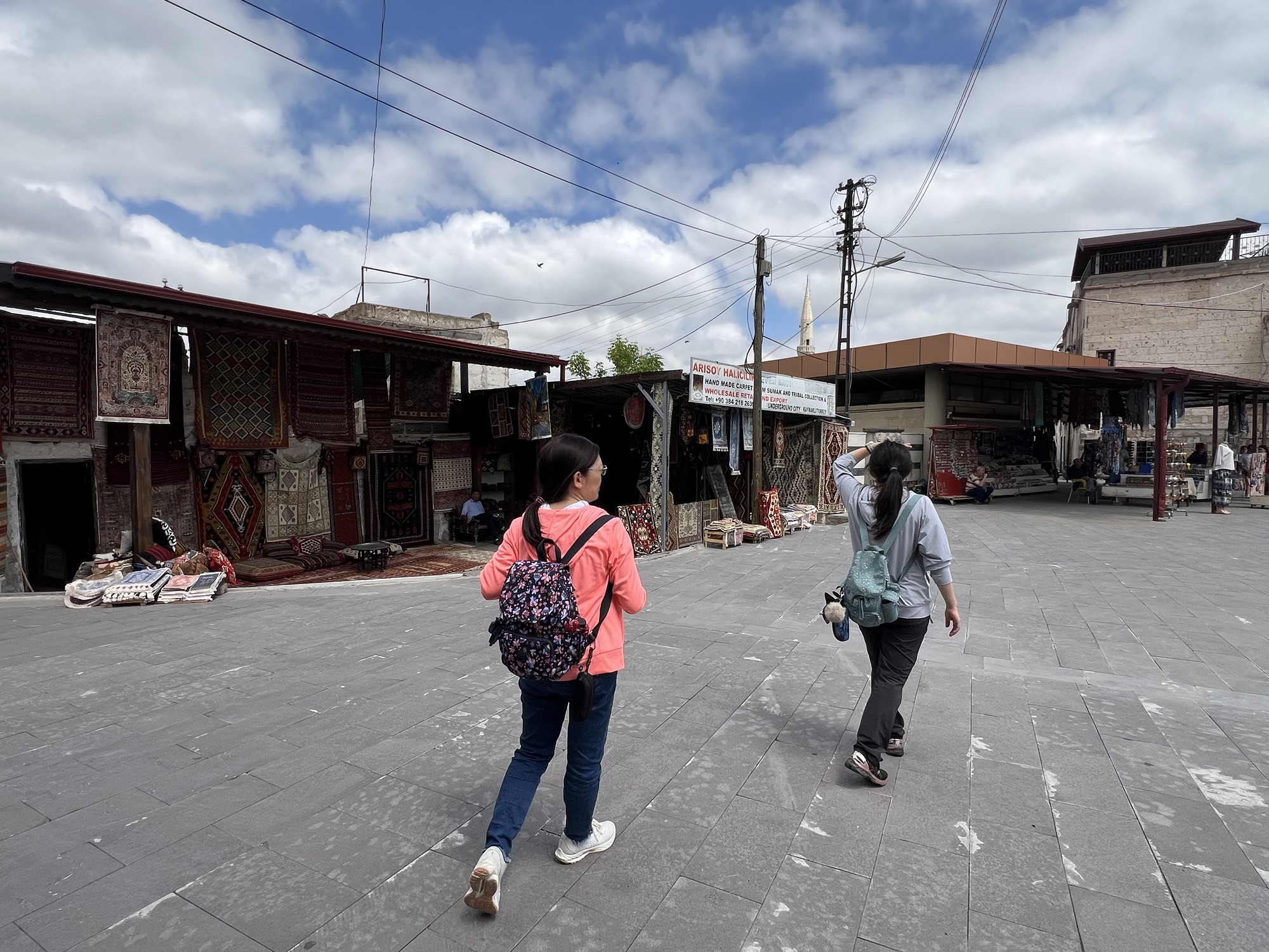 第一站是地下城,距離市區有點遠,大概一個小時的車程。地下城是羅馬帝國時代受迫害的基督教徒往西遷移至此,每當軍隊來襲就會躲進地下城裡避難,所以只是緊急庇護所,並不是日常使用。裡頭除了食物儲藏室和廚房廁所等生活空間外,還有可以用一個大圓盤石頭關閉的通道,中間還留了一個洞可以戳敵人。現在是土耳其的暑假時間,景點裡全都是人,在狹小的地下城裡尤其明顯。還好我們的身高走通道不用太低頭,還是能夠快速移動,茹茹移動速度之快很像上輩子住在這邊。地下城內上上下下的通道很容易不知道自己在哪一層,跟著指標走雖然不會迷路,但少了一點探索的樂趣。