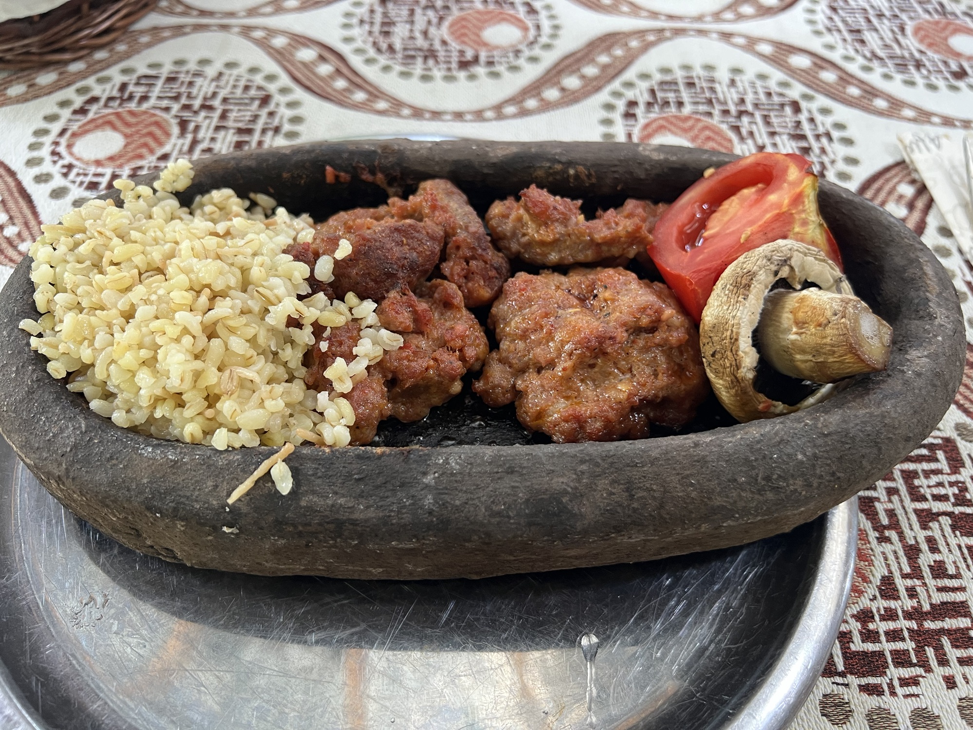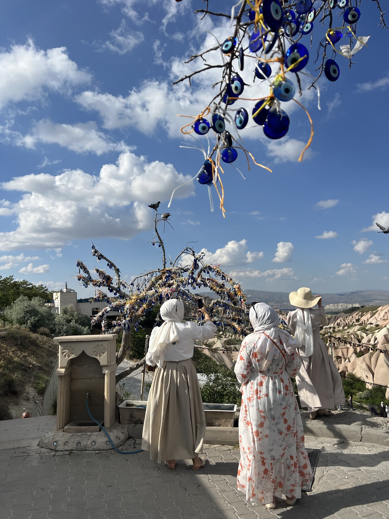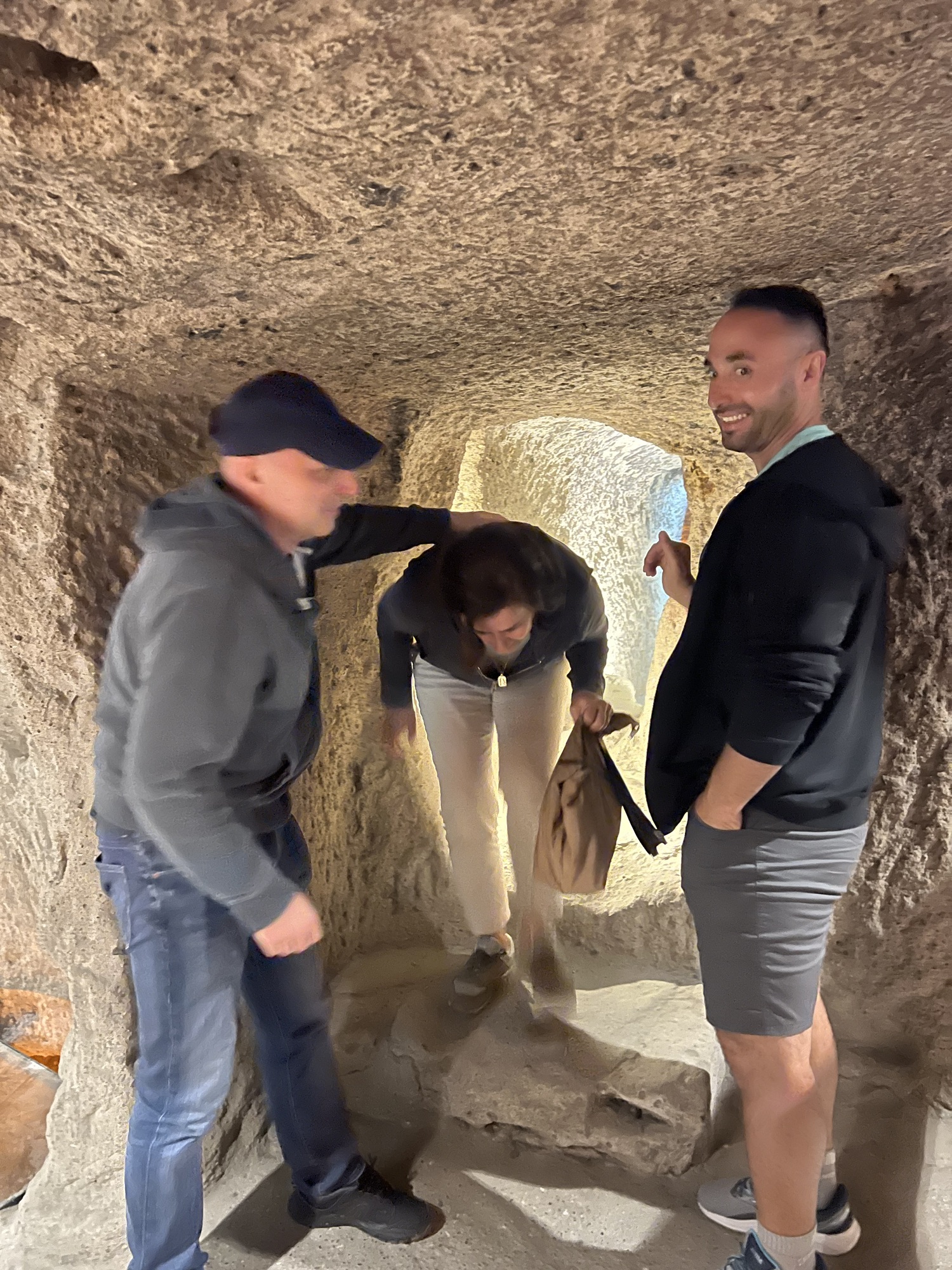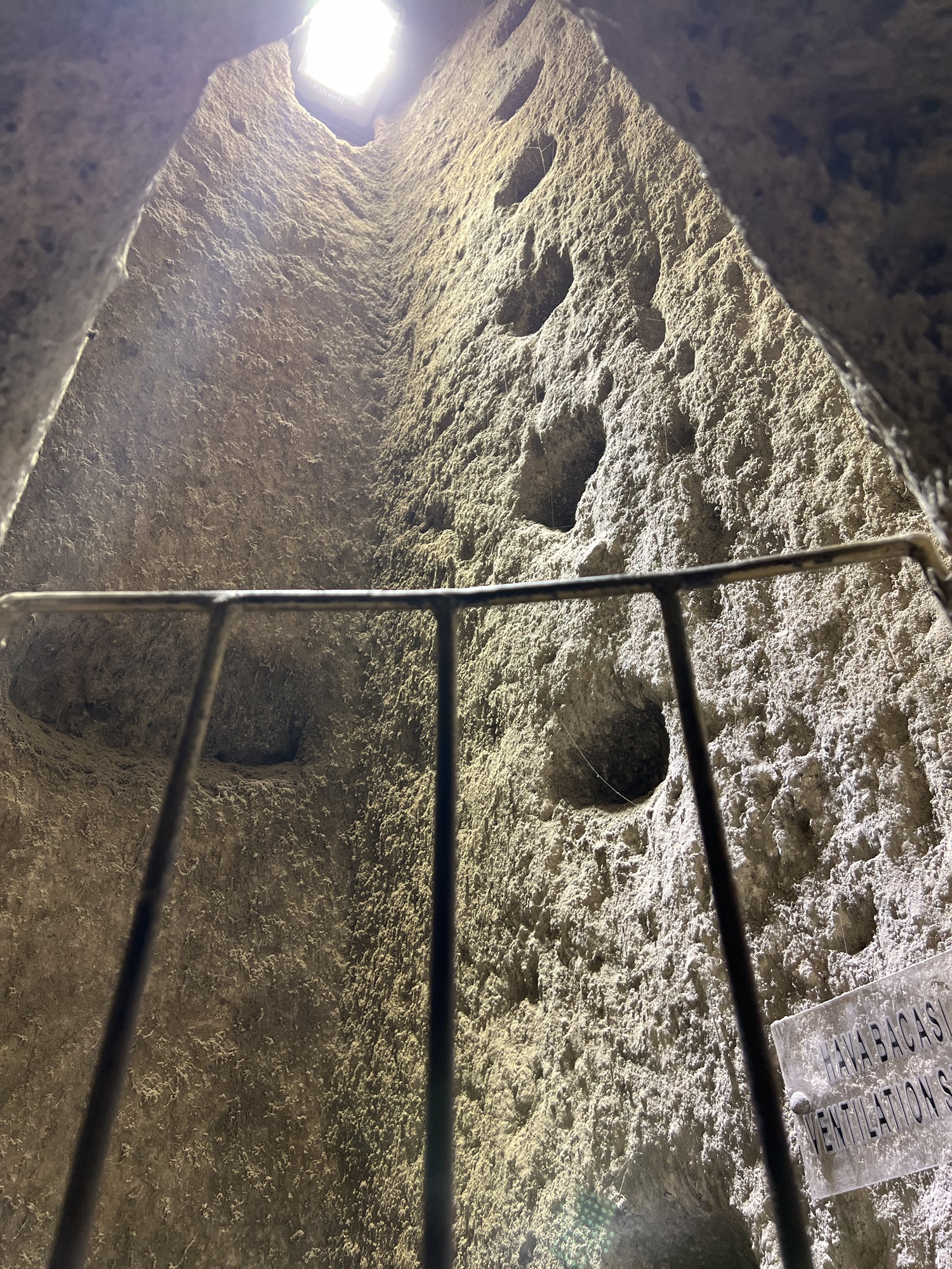 第一站是地下城,距離市區有點遠,大概一個小時的車程。地下城是羅馬帝國時代受迫害的基督教徒往西遷移至此,每當軍隊來襲就會躲進地下城裡避難,所以只是緊急庇護所,並不是日常使用。裡頭除了食物儲藏室和廚房廁所等生活空間外,還有可以用一個大圓盤石頭關閉的通道,中間還留了一個洞可以戳敵人。現在是土耳其的暑假時間,景點裡全都是人,在狹小的地下城裡尤其明顯。還好我們的身高走通道不用太低頭,還是能夠快速移動,茹茹移動速度之快很像上輩子住在這邊。地下城內上上下下的通道很容易不知道自己在哪一層,跟著指標走雖然不會迷路,但少了一點探索的樂趣。