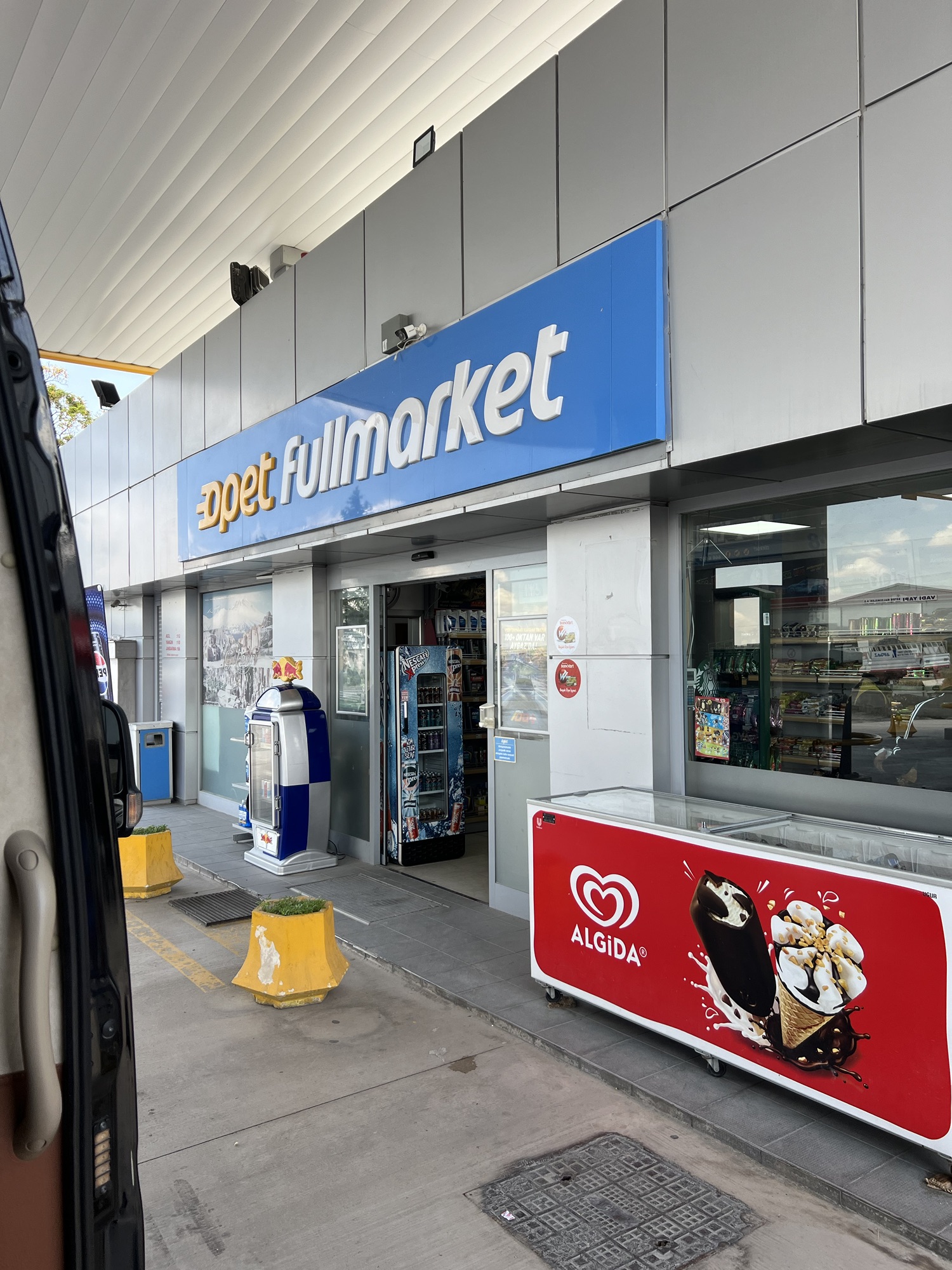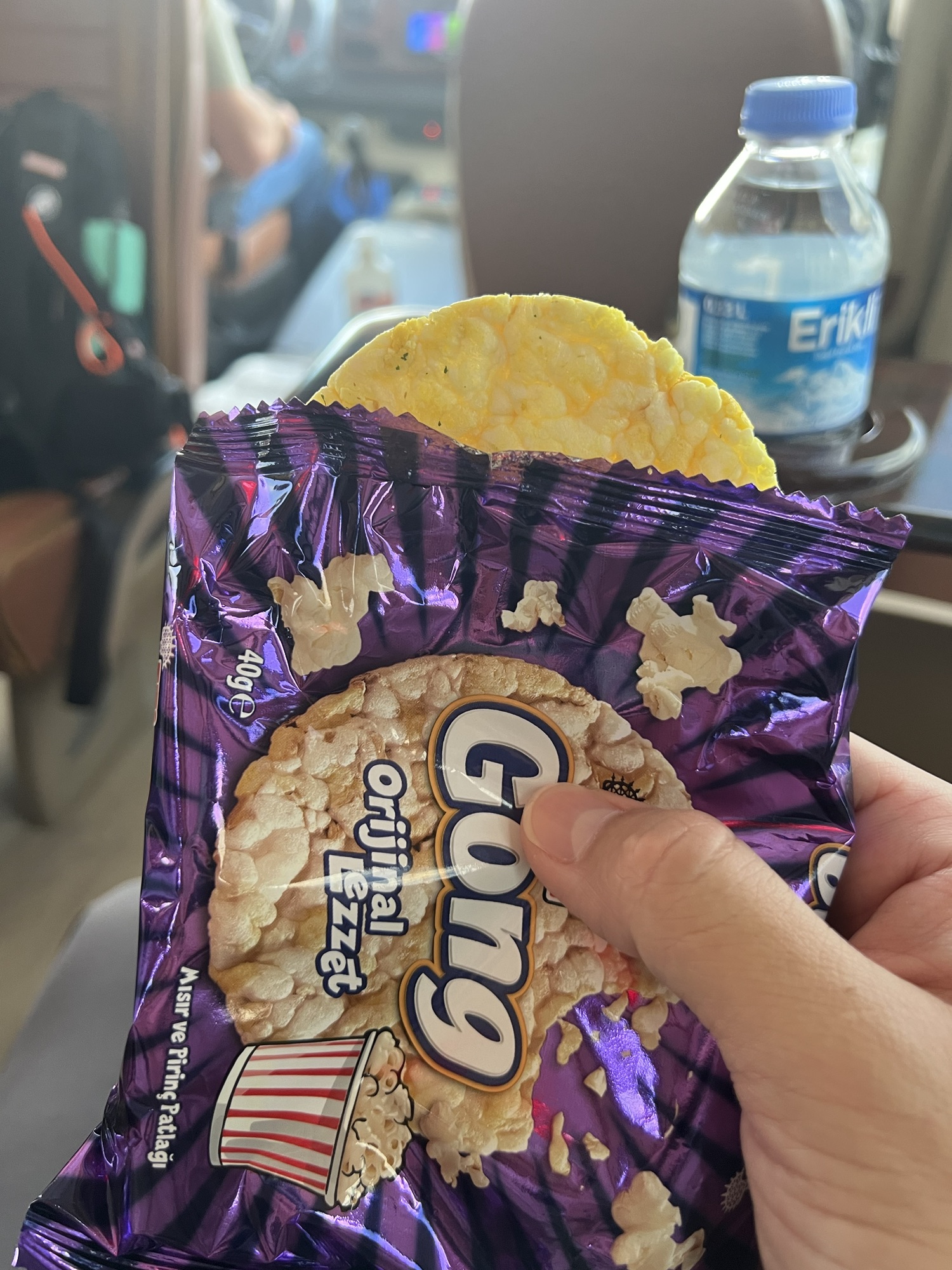 離開地下城,中間在一個加油站休息,進去小超商上廁所買零嘴,茹茹買了一個夯實的爆米花片,超級好吃!我買了一包巧克力棒就很普通。