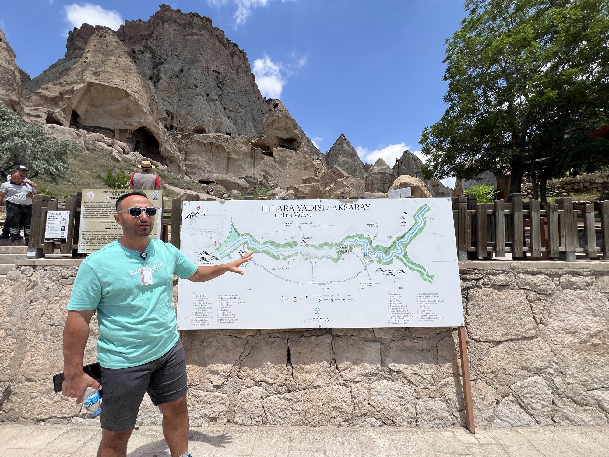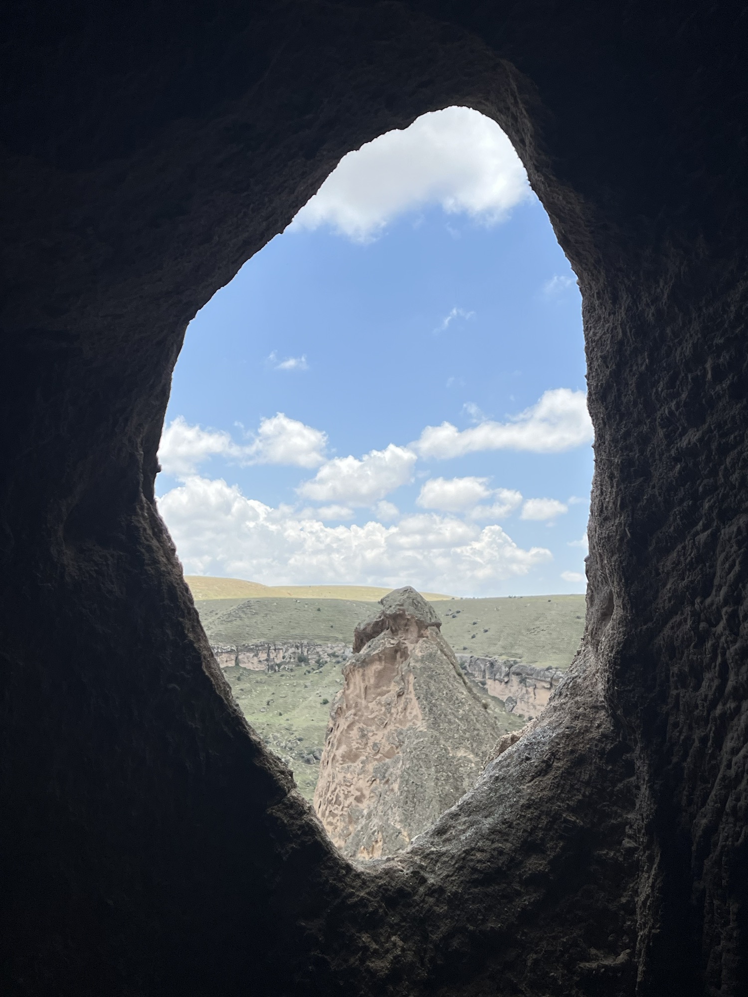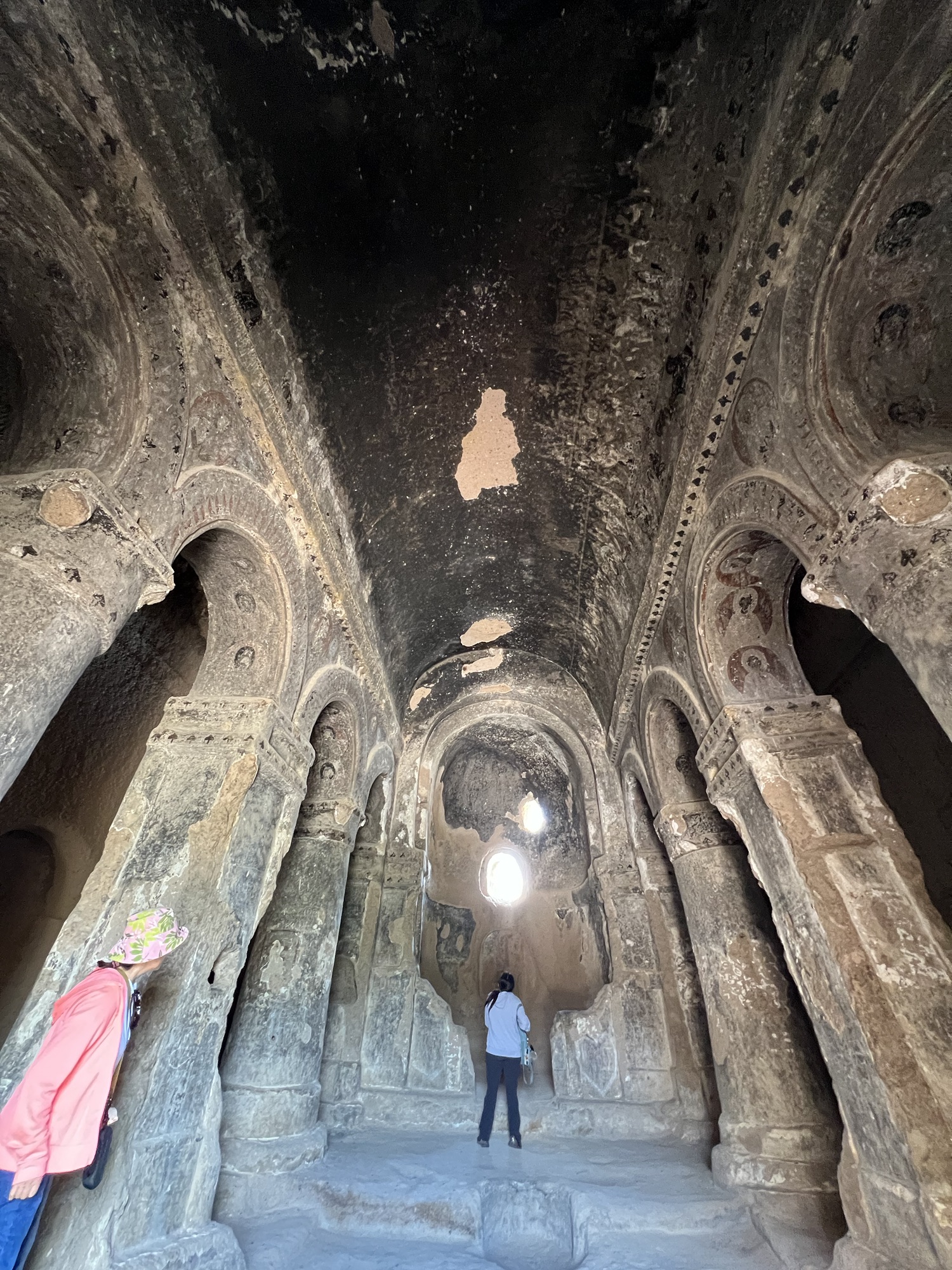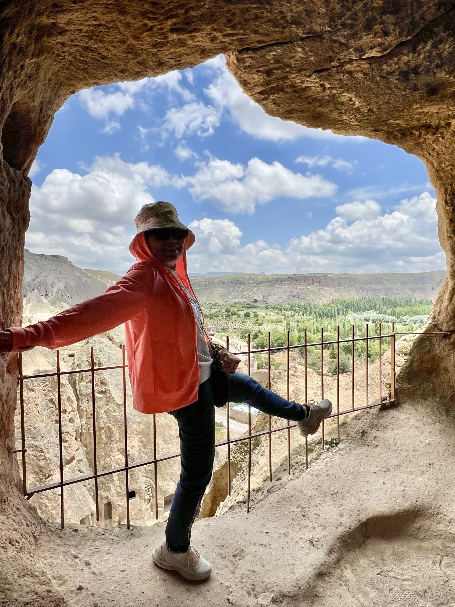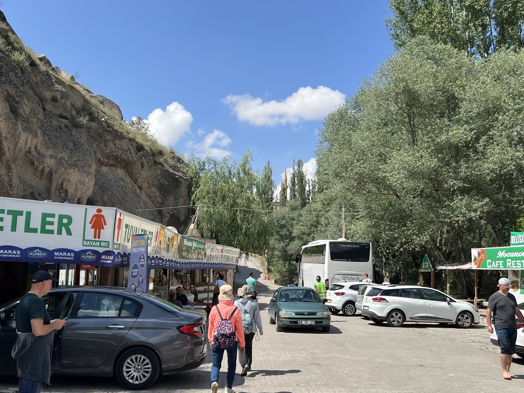 下一站來到Ihlara峽谷的入口處,這裡也有一區岩石屋驛站,可以登高眺望蓊鬱的峽谷風景。這裡比起哥樂梅比較沒有維護和管制,也有一些小教堂和壁畫,但多數都褪色得厲害。導遊給了我們半小時自由時間,在洞穴間鑽來鑽去很是有趣,高處的洞穴很涼,遠望就能看見垂直下切的峽谷邊緣。