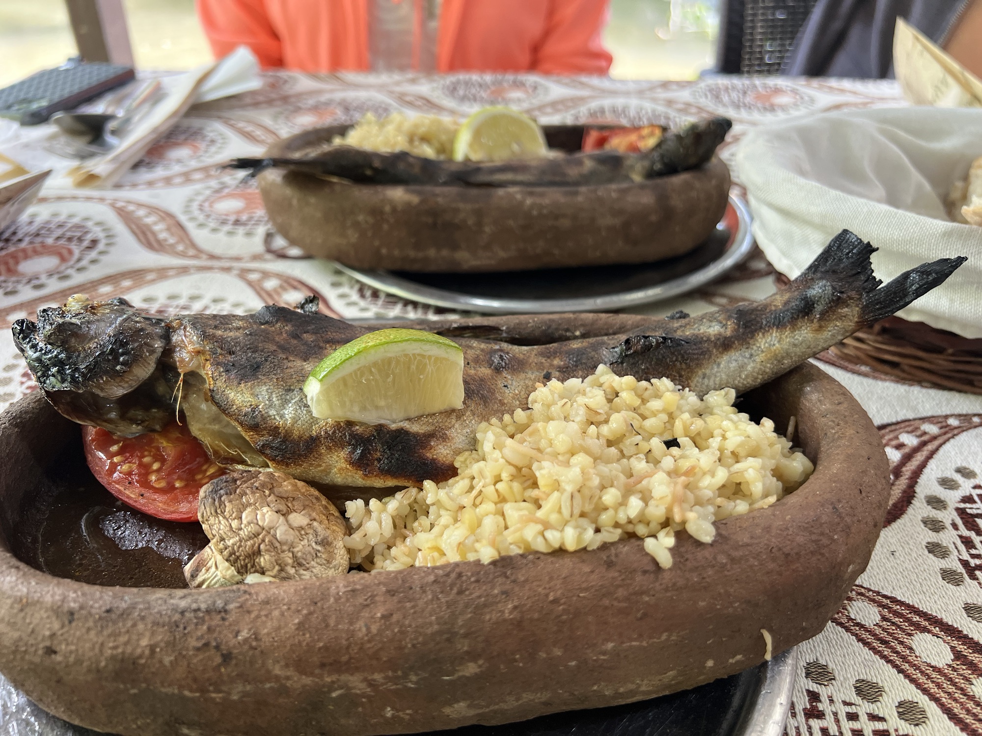 繼續往峽谷中段前進,首先進到水上屋餐廳吃飯,烤肉丸和烤魚都十分好吃,可惜沒有讓我們去水上臥榻區喝茶(導遊說之前大家去都會賴著不走,我想也是,臥榻超涼超爽!)