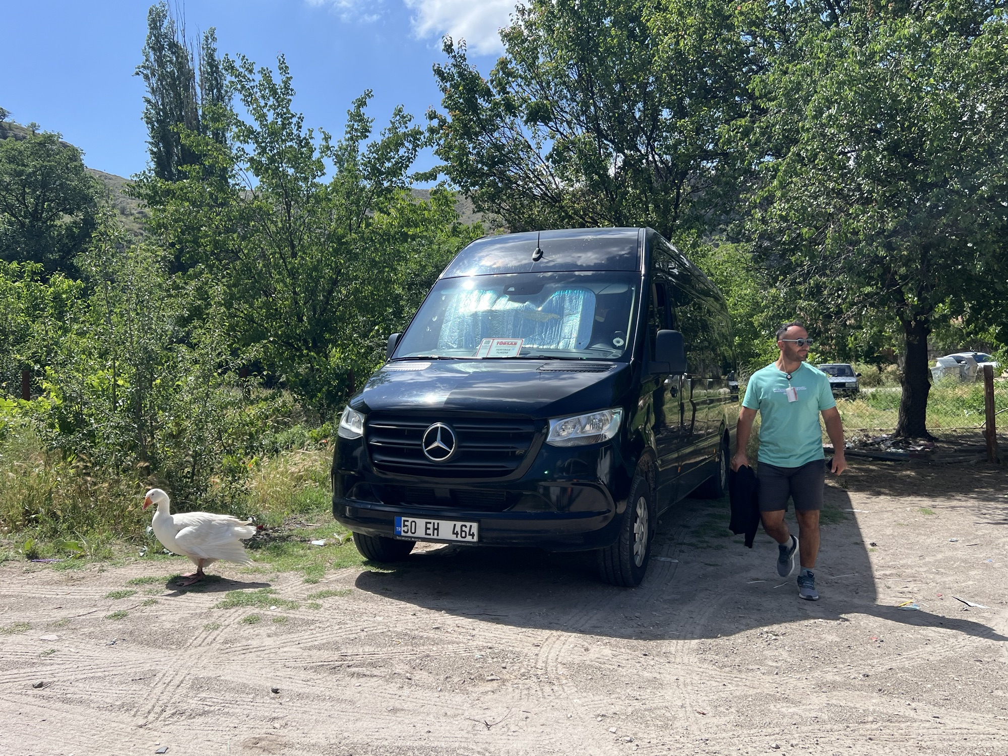 回到小巴旁,附近都是旅行團的大巴士,迴轉時只見我們的導遊在不到十公分處閃過車尾,還用手滑過車身,好像這一點都不危險一樣。車旁有隻吵鬧的白鵝,導遊說他的故鄉在土東,冬天時會宰大量的鵝放進雪地裡保存,看見呱呱叫的白鵝應該覺得很美味。