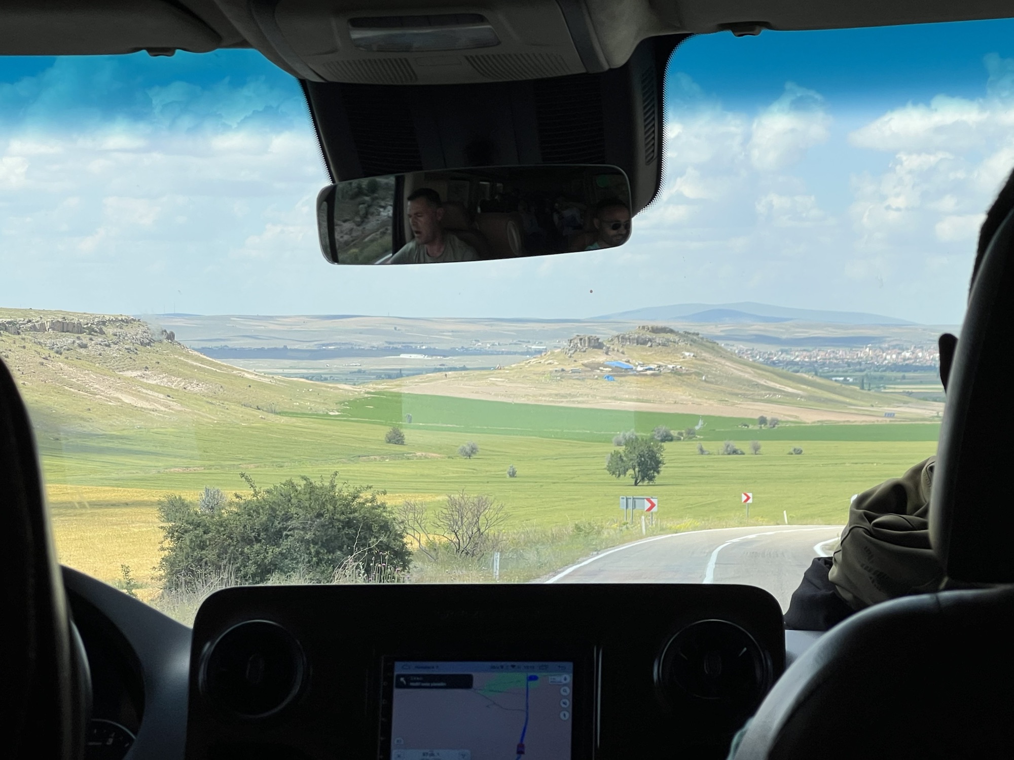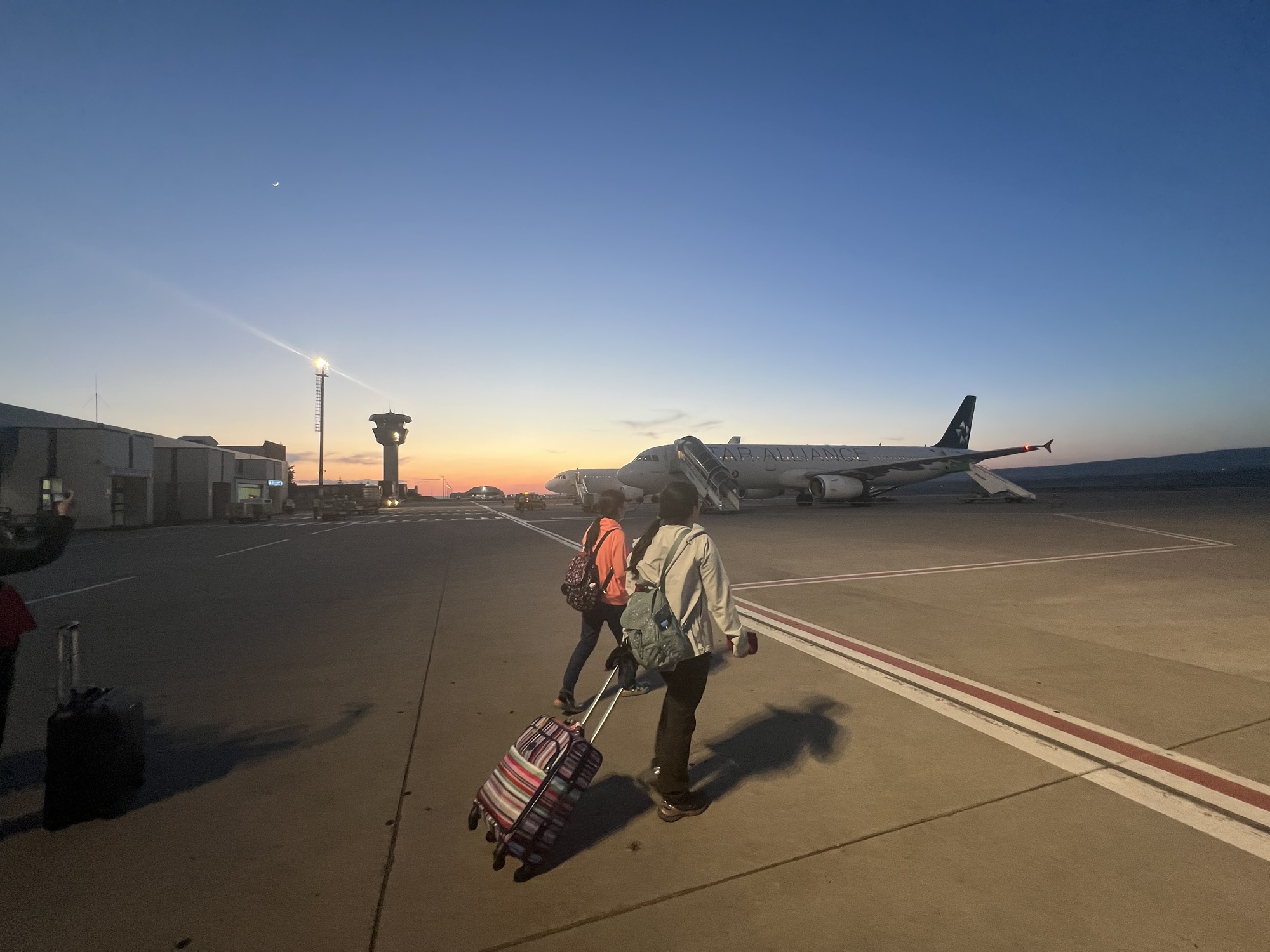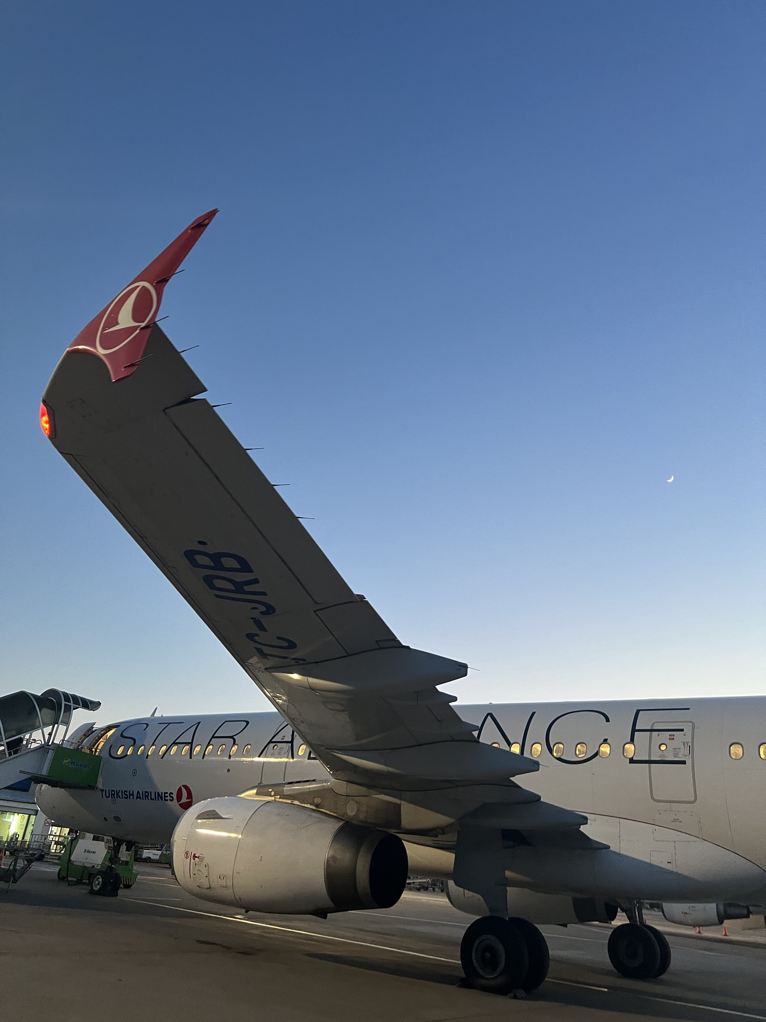 六點半坐上機場接送的小巴,司機還先去了烏奇薩接其他客人,中間還進到好幾個別的市區,花了一個小時才到機場。機場報到後等待登機,原本以為還要等一個小時,沒想到馬上就輪到我們,還被地勤催了。走到停機坪上登機,傍晚的暮色和一彎低垂的新月(可惜就差一顆新月旁的金星),真是最土耳其風情的景色。