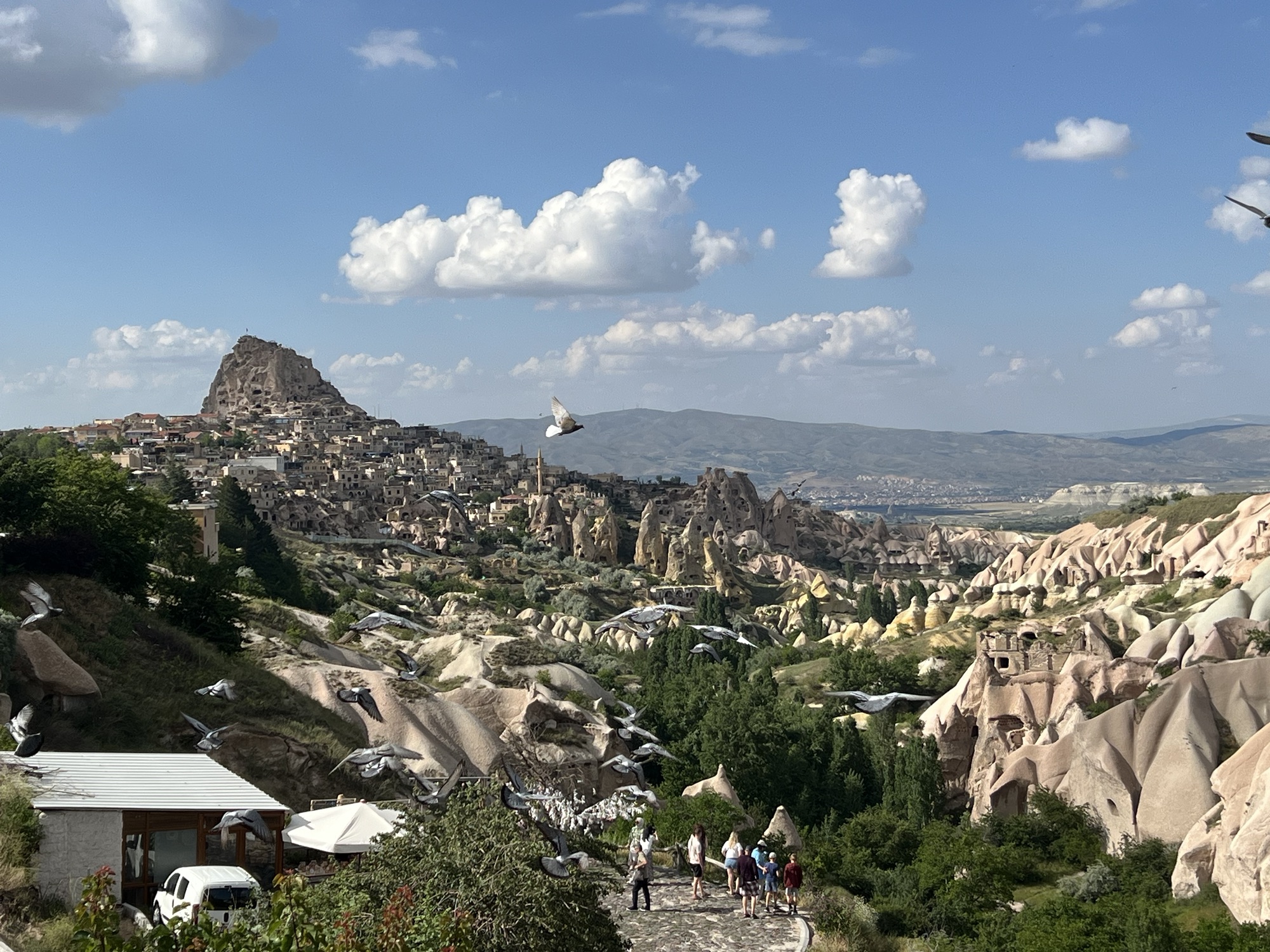今天的最後一站是鴿子谷,以前應該是真的有在養來搜集鴿糞,現在大概就是定時灑飼料讓鴿子漫天飛舞作為景點,背景正好是遠處的烏奇薩城堡,確實是很適合網美拍照。茹茹在底下的小店買了一顆玉石打磨成的蘋果,好像覺得放在魚缸裡很合適。
