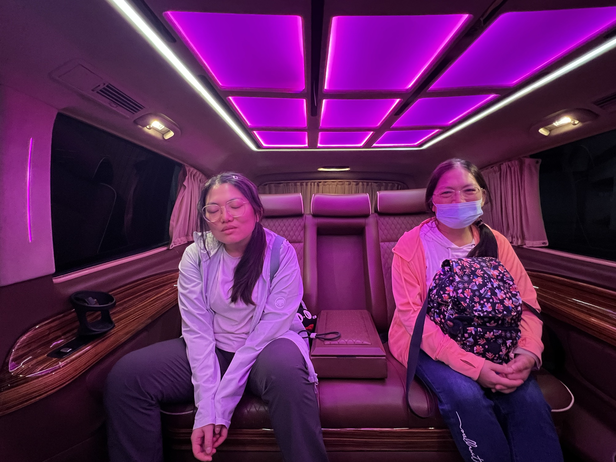 坐上機場接送的廂型車,裡面裝了整面屋頂粉紅的霓虹燈,就算車窗都是關著,車外的聲音還是聽得一清二楚,不知道鈑金是不是超薄,非常猛。搭到市區的過程不太舒適,下交流道後又走走停停,總算在十二點之前抵達旅館。