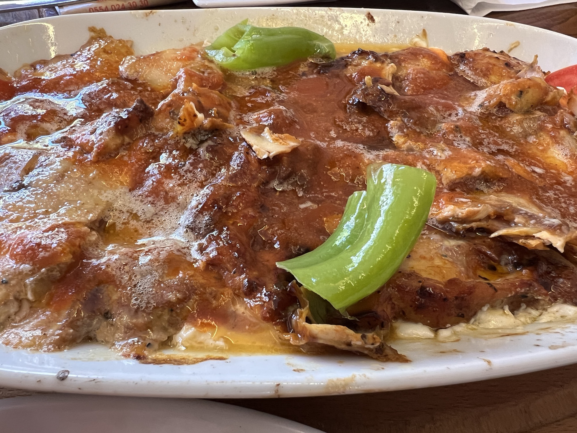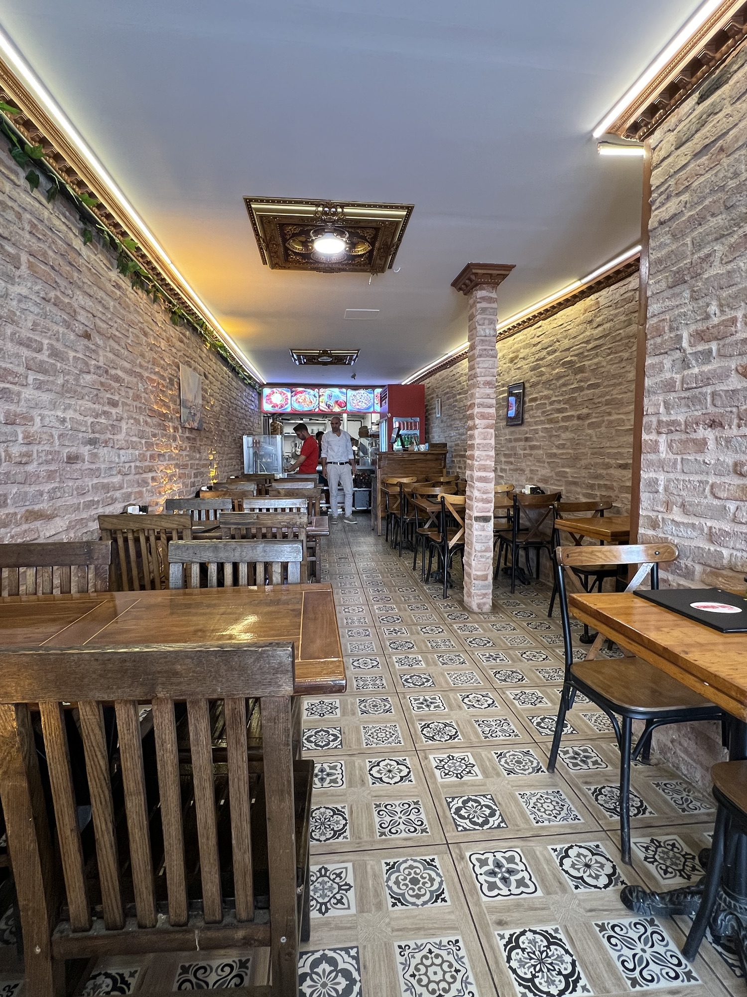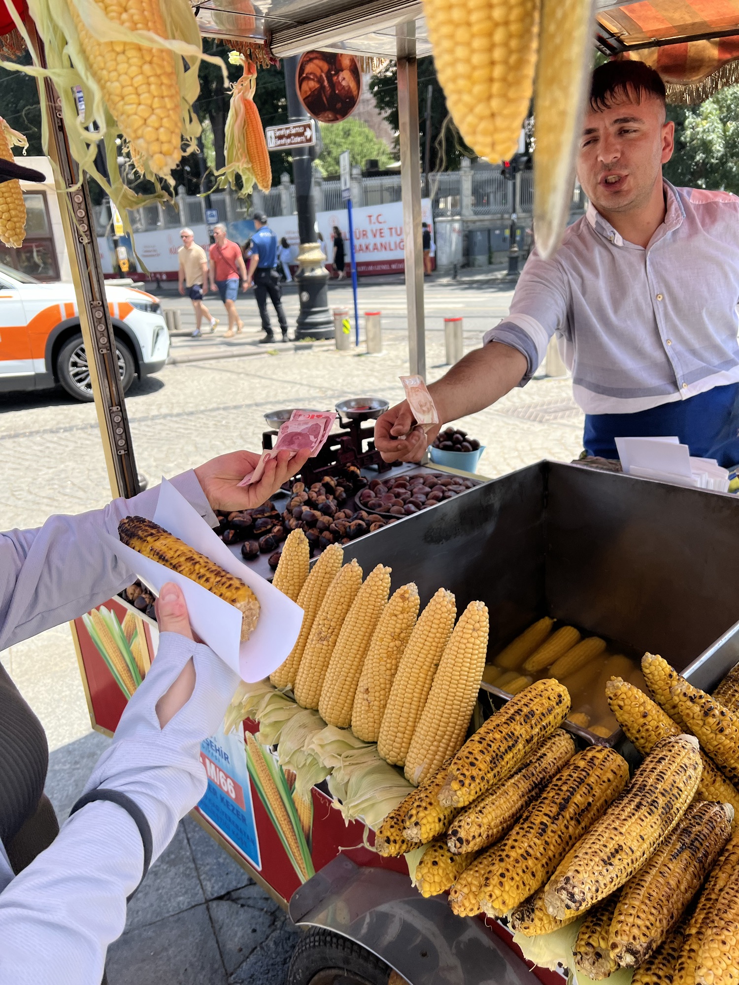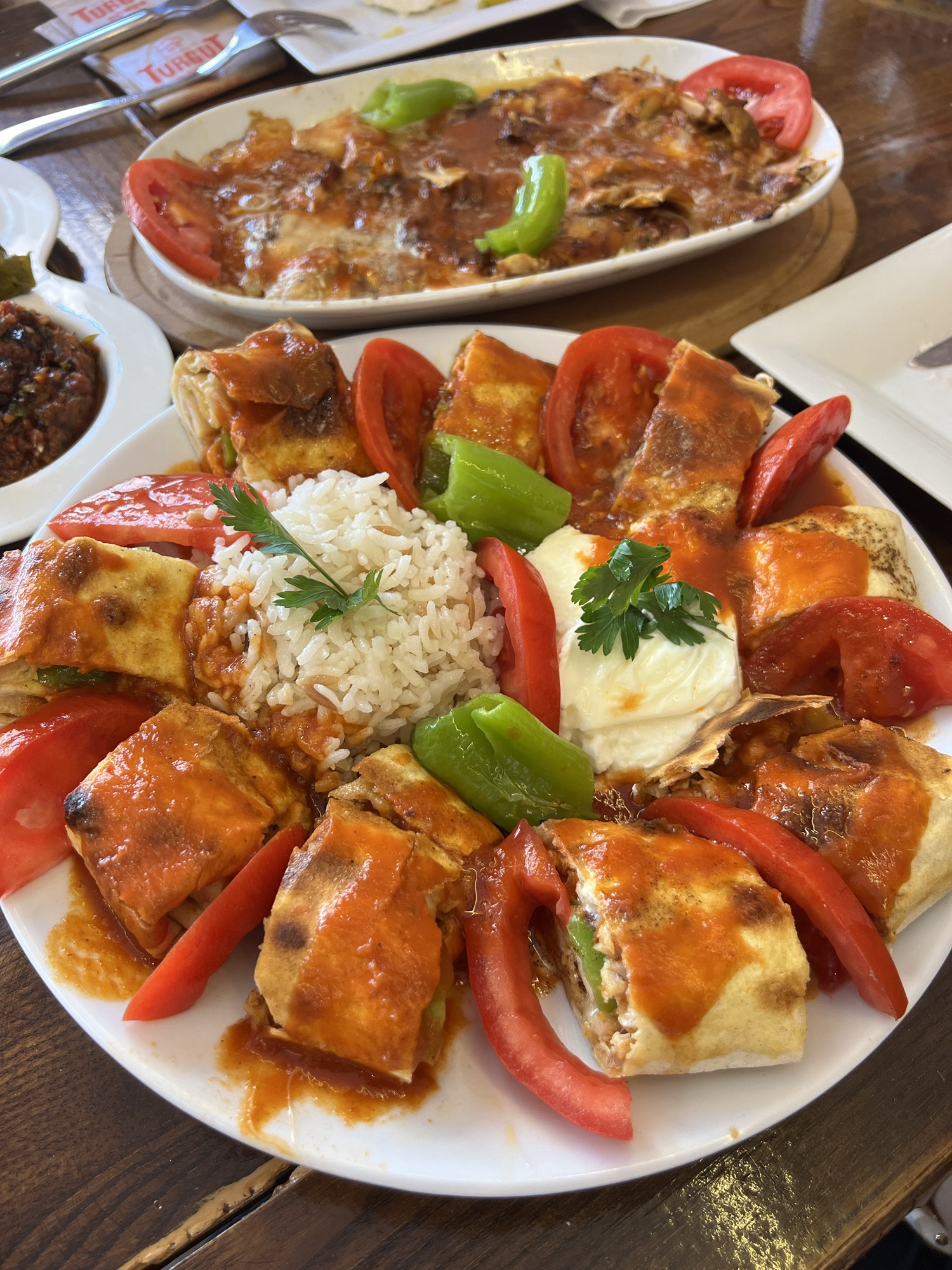 回到地面的艷陽下,廣場旁很多賣烤栗子和烤玉米(一支30里拉)的攤販,試了一下,玉米還行,栗子很乾。走往海邊的方向找餐廳吃飯,許多高級旅館也在這一區,餐廳的價位都是一個人七八百起跳,非常驚人。最後決定吃一間賣捲餅的連鎖店Tur Döner,叫了一盤前菜、一份主菜捲餅、和一份烤優格牛肉片,一共1650里拉,結果份量有點驚人,吃不到三分之一就飽到不行。一位女店員(看起來像經理),最後來找我們聊天,還幫小美喬好了彈性頭巾,又送我們喝橘子茶和小甜點。離開前跟小美合照,好像一直覺得自己臉太大要求重拍,也不忘叫我們去Google Maps給五星好評;這頓吃起來一個人五百多塊(還吃不完),在這區已經是經濟實惠,評價當然是要給好給滿的,但是茹茹依然覺得太坑錢不能接受。