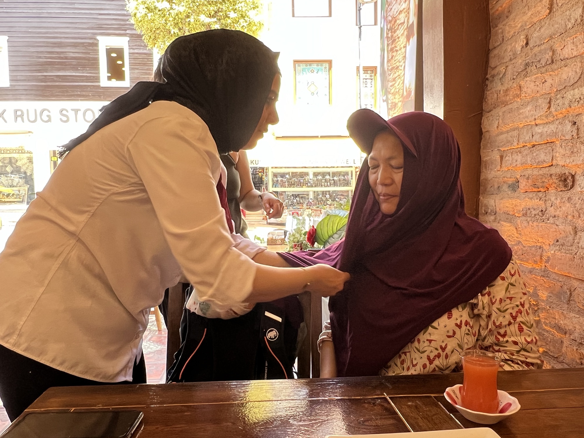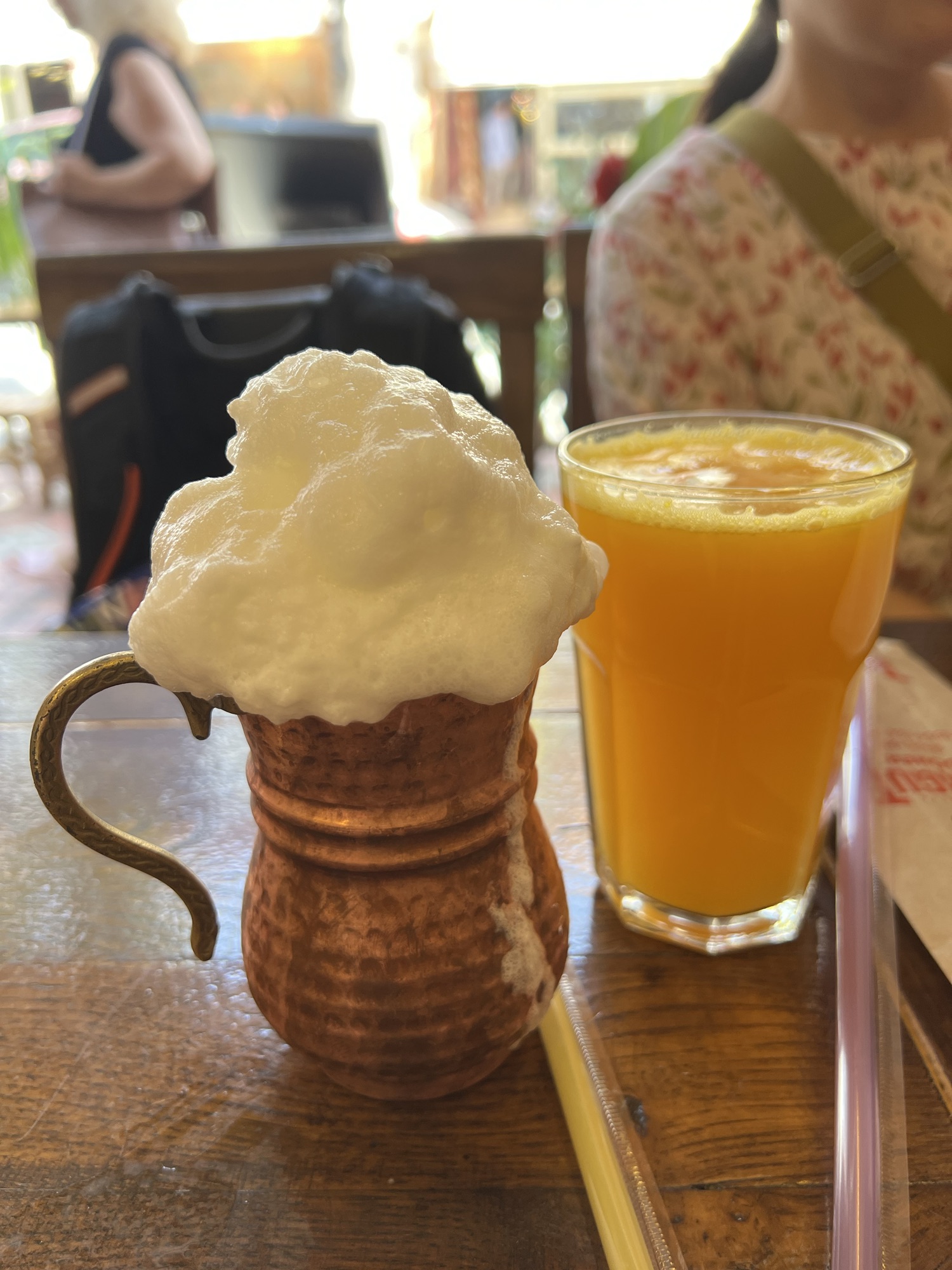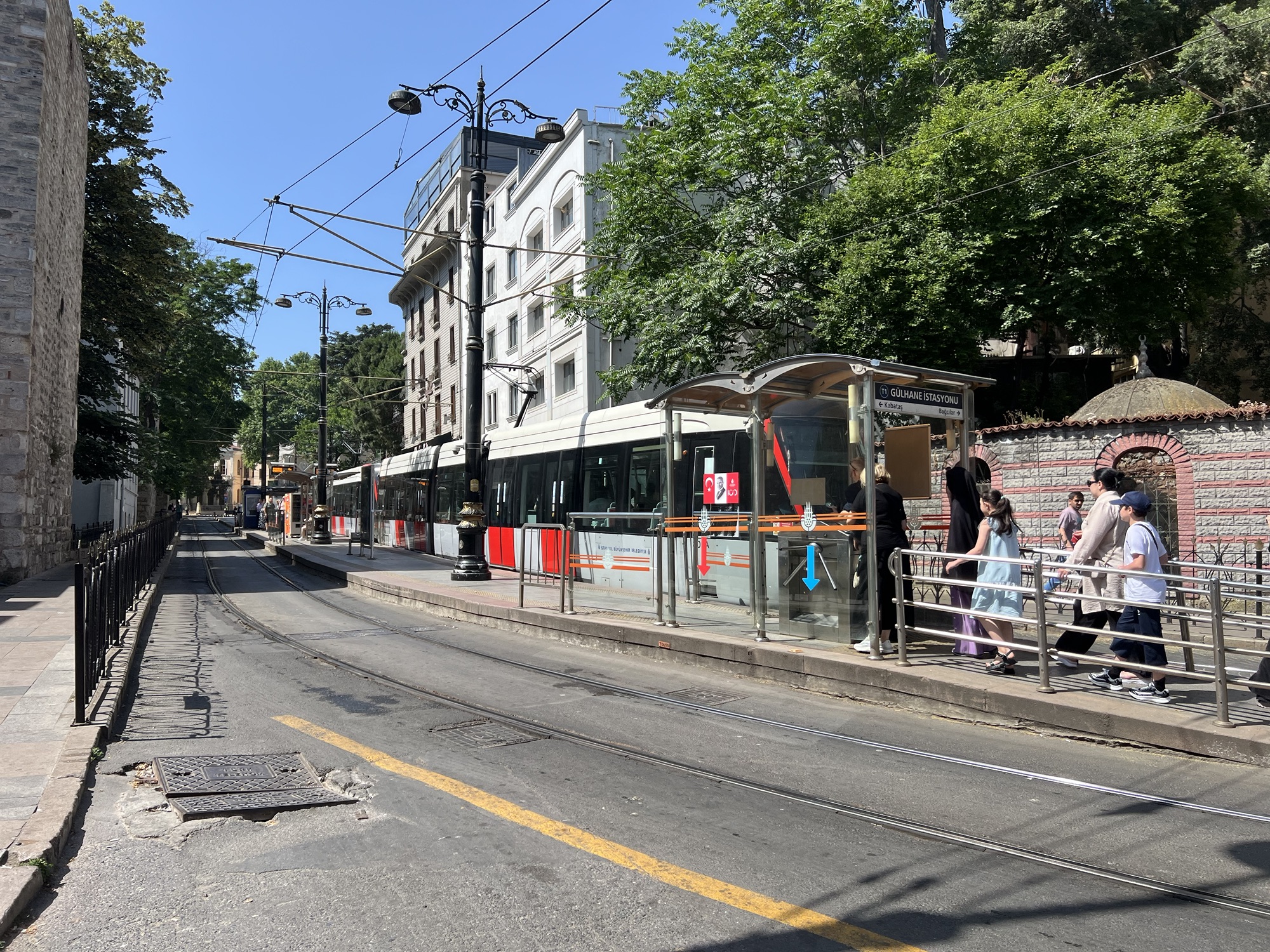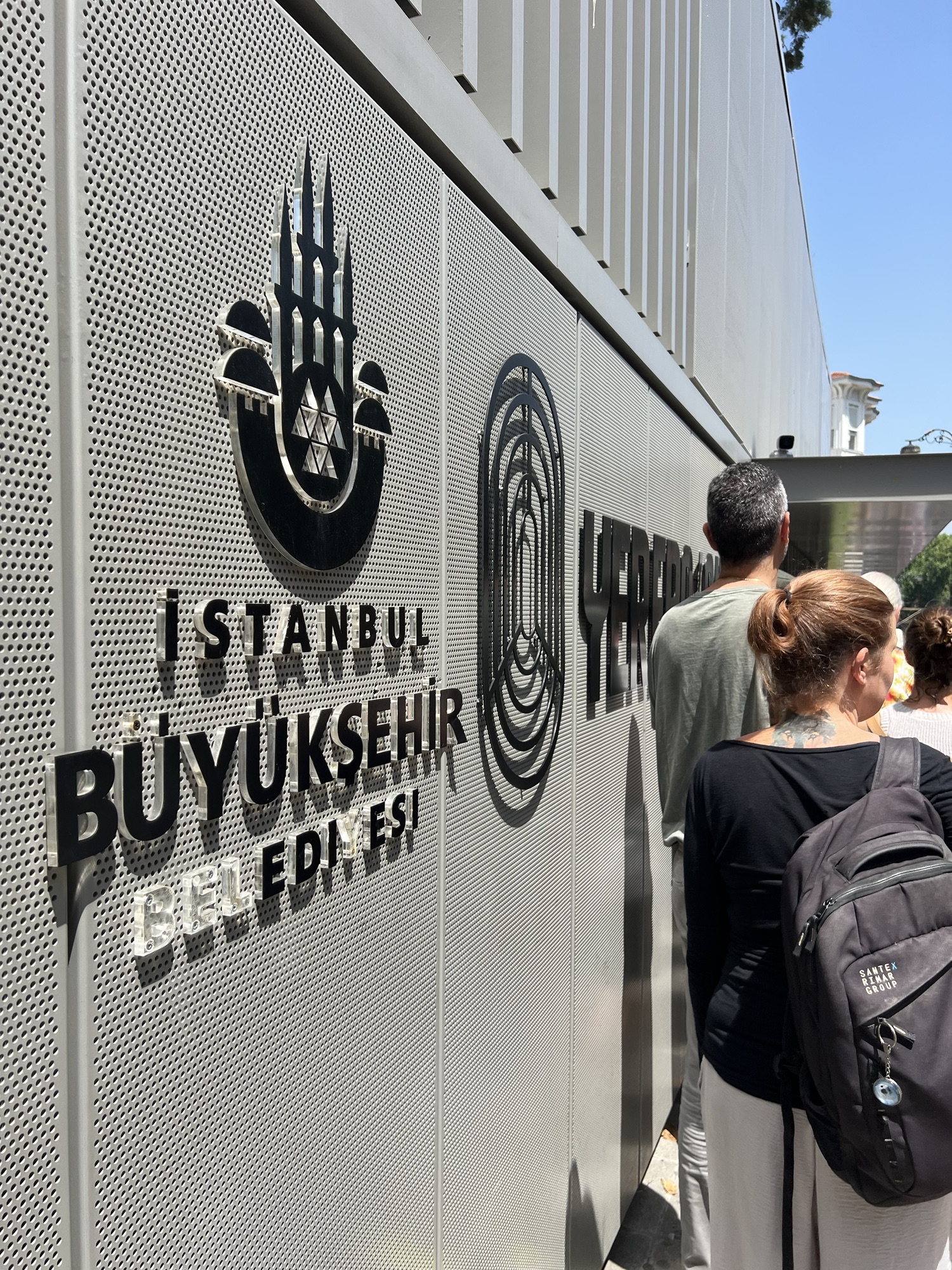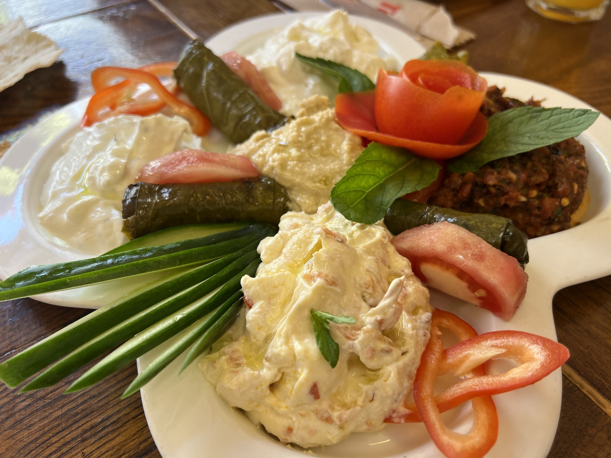 回到地面的艷陽下,廣場旁很多賣烤栗子和烤玉米(一支30里拉)的攤販,試了一下,玉米還行,栗子很乾。走往海邊的方向找餐廳吃飯,許多高級旅館也在這一區,餐廳的價位都是一個人七八百起跳,非常驚人。最後決定吃一間賣捲餅的連鎖店Tur Döner,叫了一盤前菜、一份主菜捲餅、和一份烤優格牛肉片,一共1650里拉,結果份量有點驚人,吃不到三分之一就飽到不行。一位女店員(看起來像經理),最後來找我們聊天,還幫小美喬好了彈性頭巾,又送我們喝橘子茶和小甜點。離開前跟小美合照,好像一直覺得自己臉太大要求重拍,也不忘叫我們去Google Maps給五星好評;這頓吃起來一個人五百多塊(還吃不完),在這區已經是經濟實惠,評價當然是要給好給滿的,但是茹茹依然覺得太坑錢不能接受。