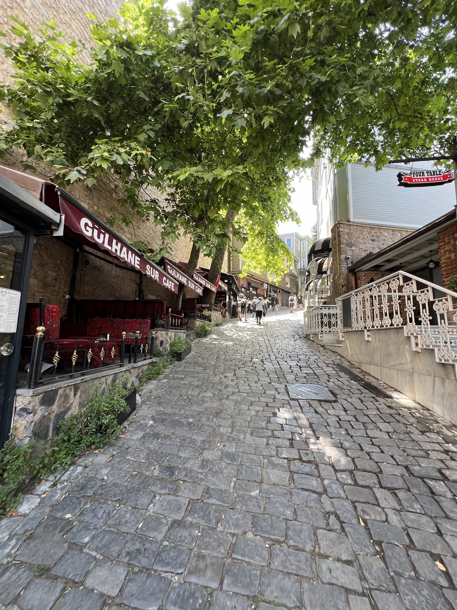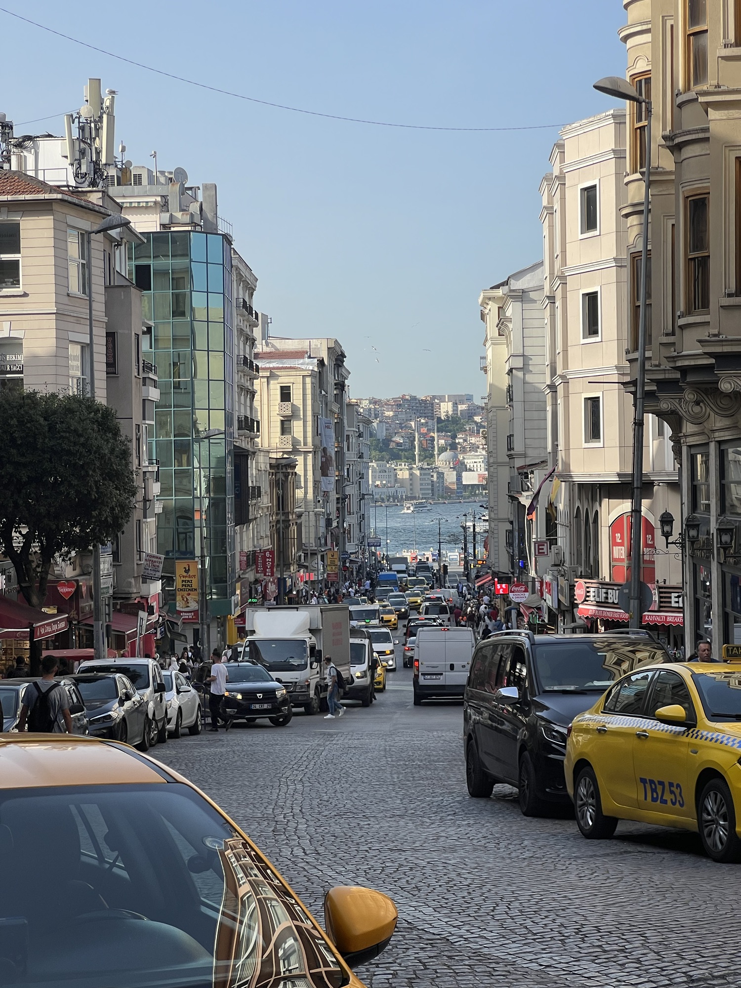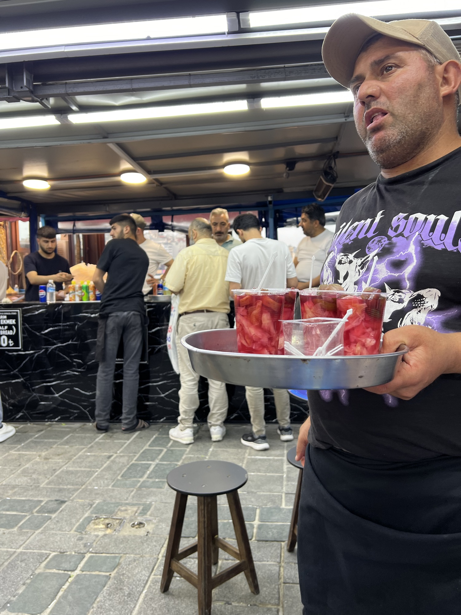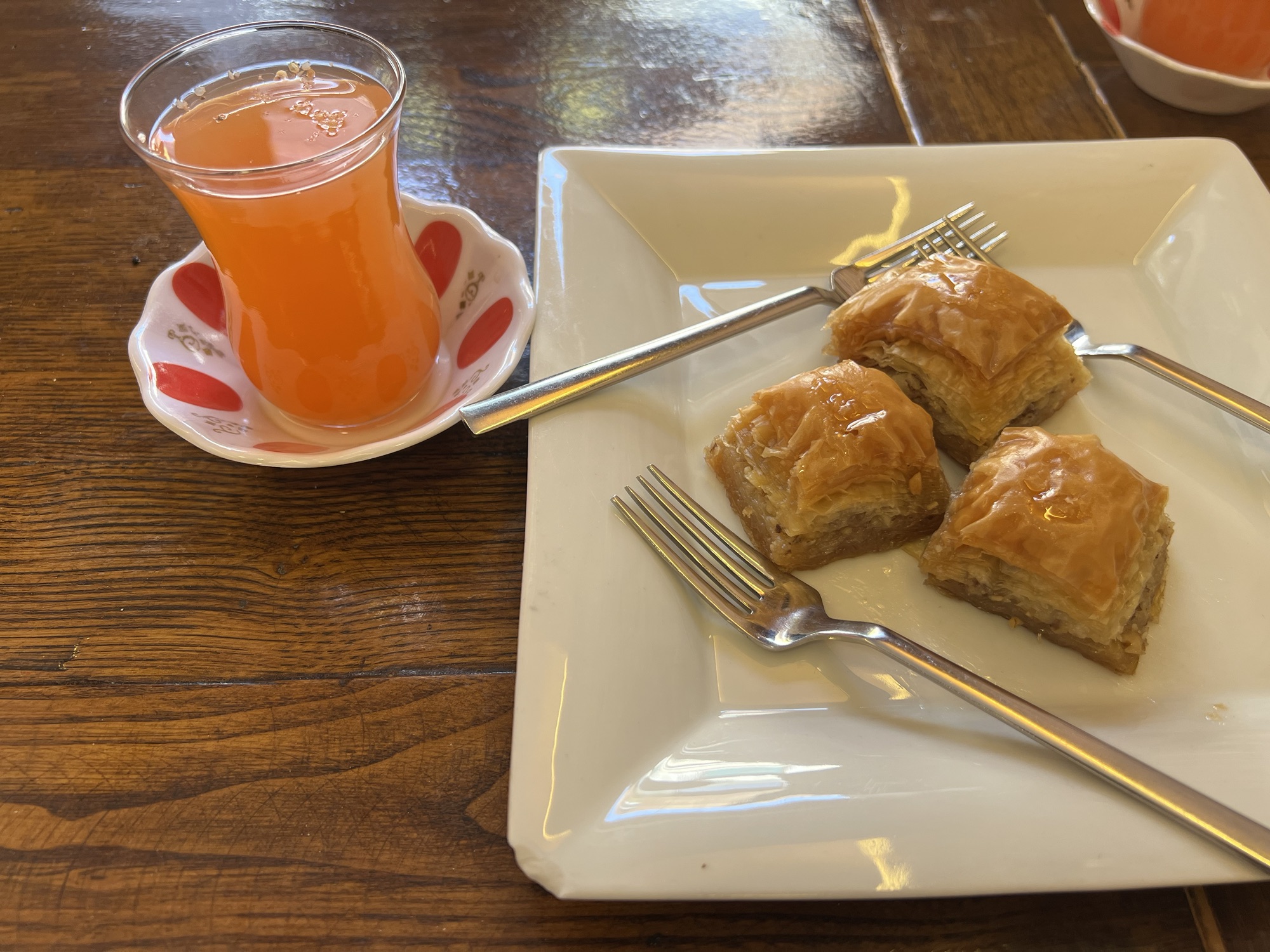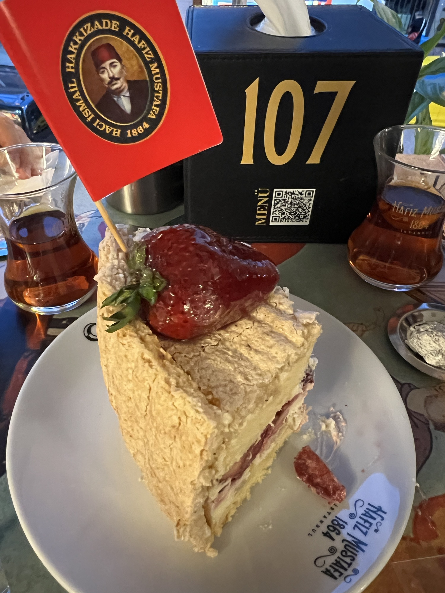 伴著地平線上的夕陽走回香料市集,大部分的店家也都收攤了。市集旁的老字號甜點店Hafiz Mustafa在伊斯坦堡有超多分店,可以說是不會出錯的甜食安全牌。我挑了一塊超大的草莓蛋糕加上三杯紅茶(一共315里拉),坐在不知道為何開窗還是很悶熱的二樓內用休息一下。草莓蛋糕的最外層是類似達克瓦茲的脆脆糖殼口感,很特別又很好吃,只可惜紅茶還是澀了些。最後買了幾盒咖啡和軟糖當伴手禮,櫃台裡的傳統甜點實在誘人,但我努力克制住了,很棒。