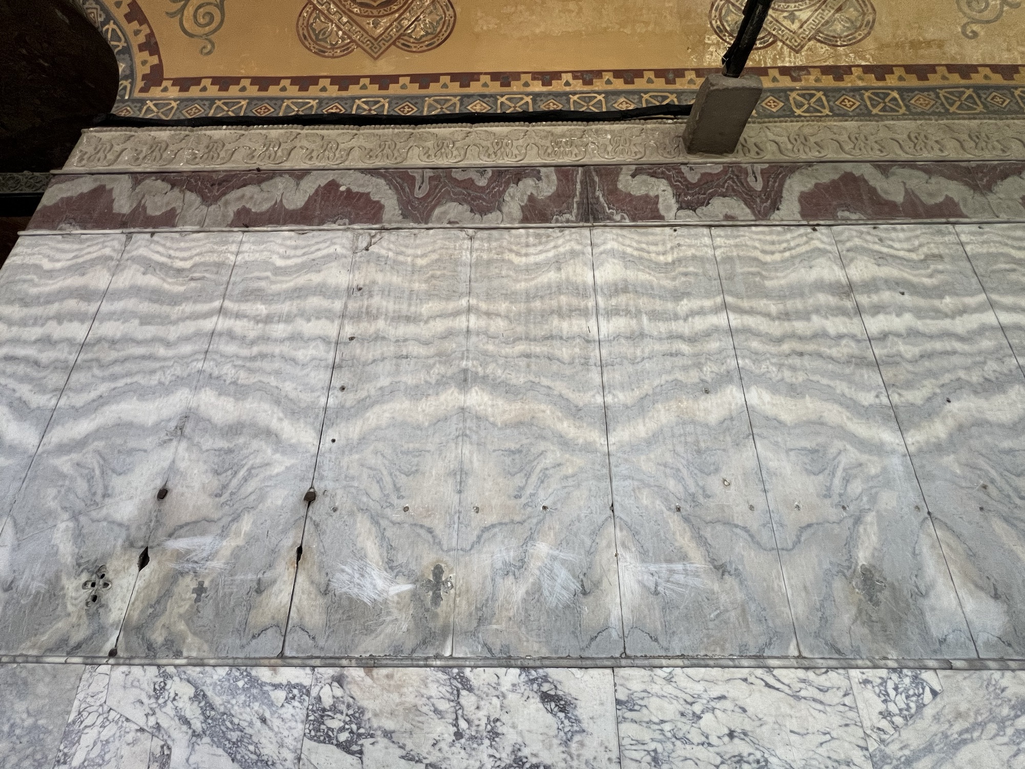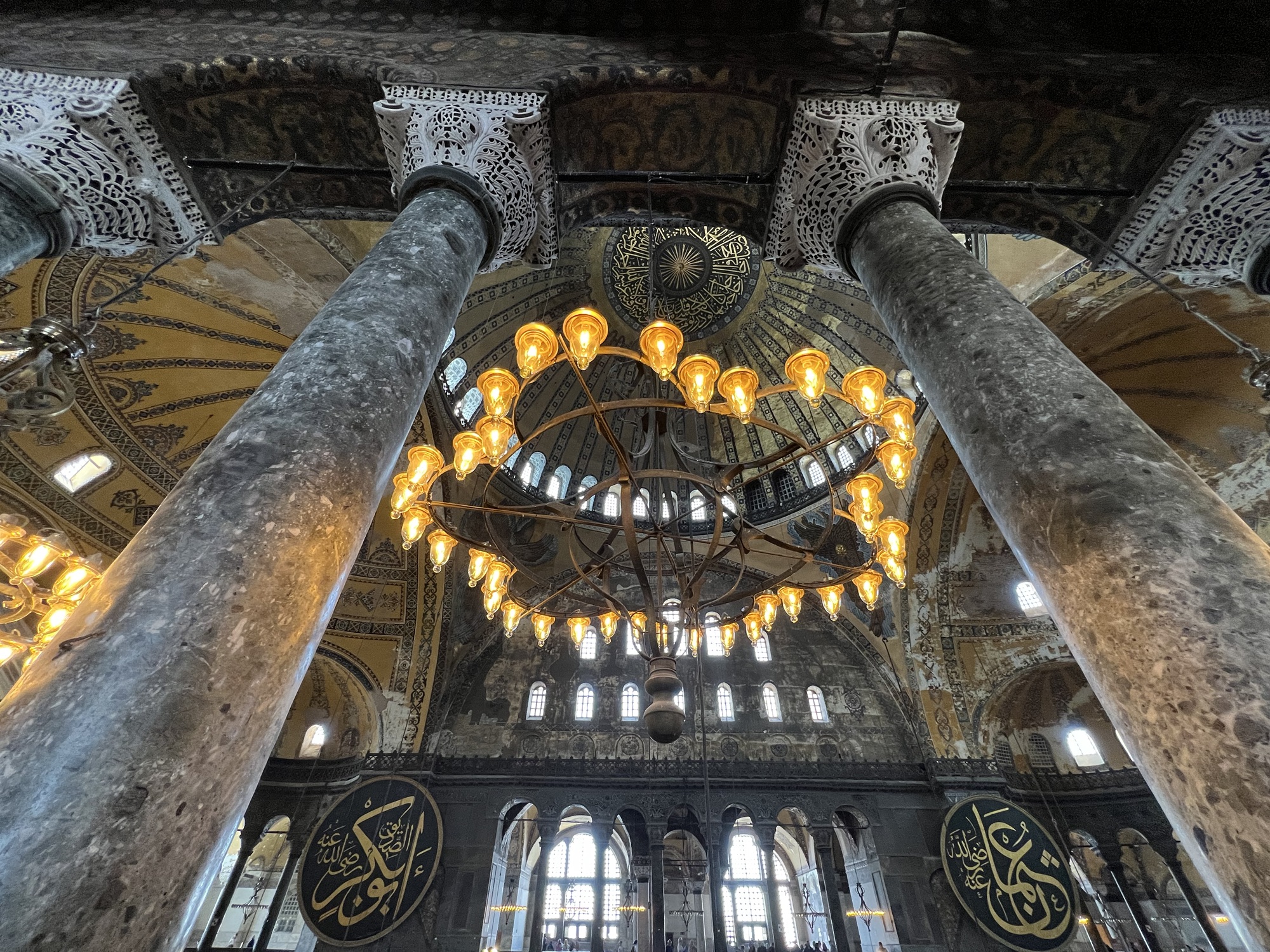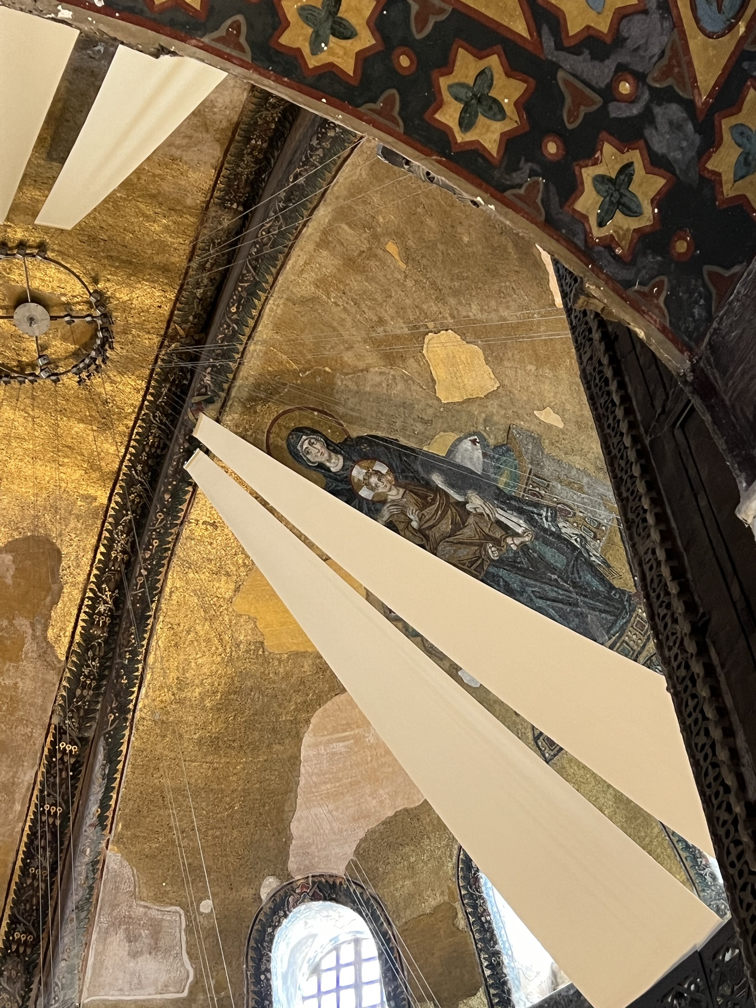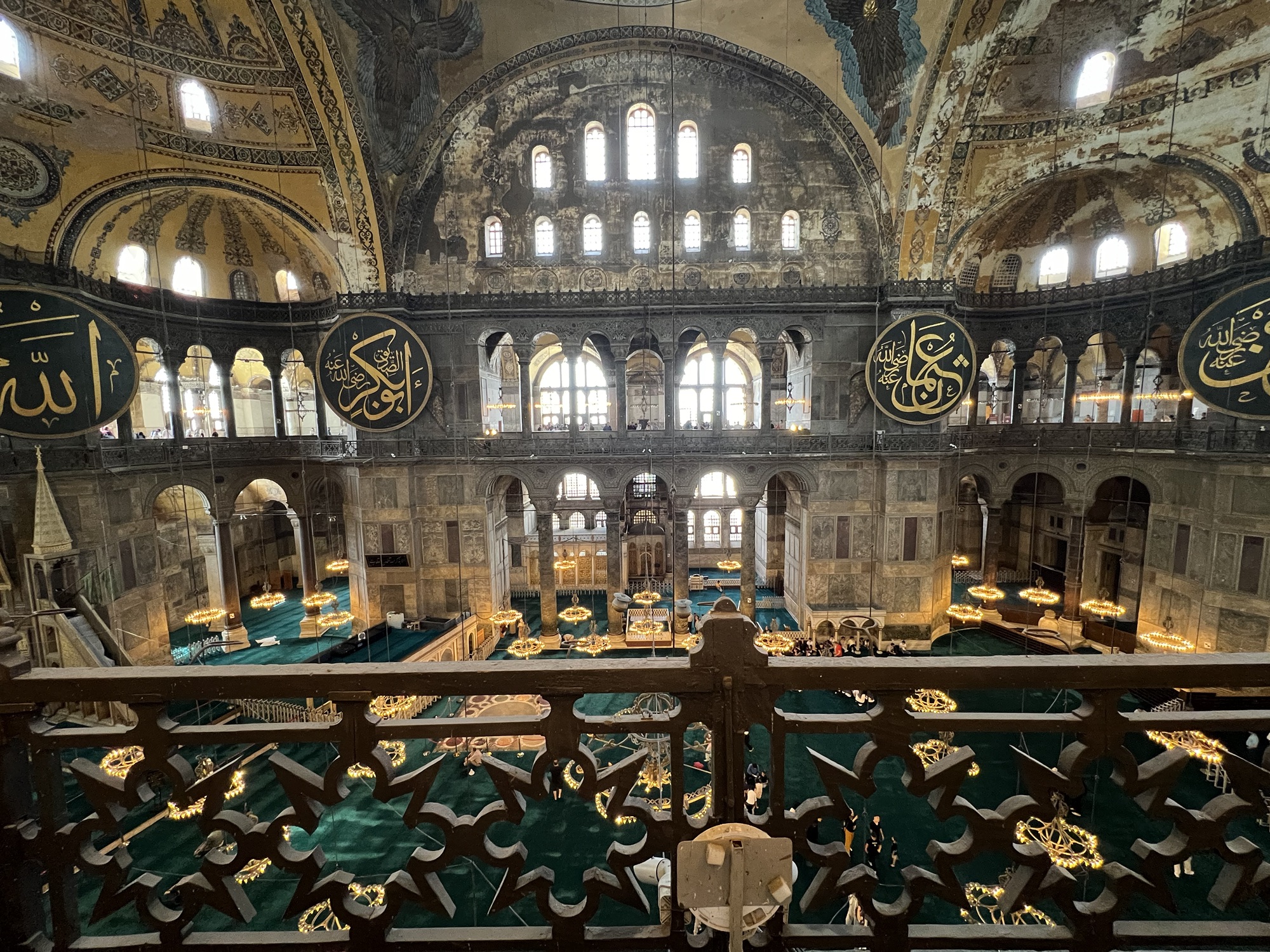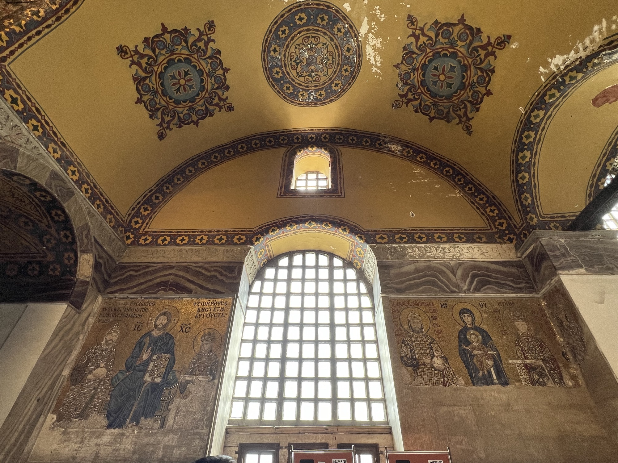 自從艾爾多安掌權之後,聖索菲亞重新改回有禮拜功能的清真寺,還封閉了二樓不讓人上去(因為有基督教聖像畫),聽導遊說直到前幾個月才重新開放二樓但僅給遊客參觀,入場要25歐。走上階梯來到二樓,發現原先掛著聖像畫的壁面上空空如也,只剩當初掛畫的鑽孔,唯一能看的剩下牆面上的馬賽克聖像畫(如果想看原先那些畫的要再付25歐去旁邊的博物館看);整個二樓空蕩蕩的,灰白的大理石顯得十分淒涼,只能俯視中庭禮拜中的人們和高高掛著的伊斯蘭圖騰。最有趣的是在聖壇上方的聖母和耶穌的壁畫用一條懸空的白布遮擋一樓穆斯林的視線,只有遊客能從側邊窺見,真是改造的非常徹底。