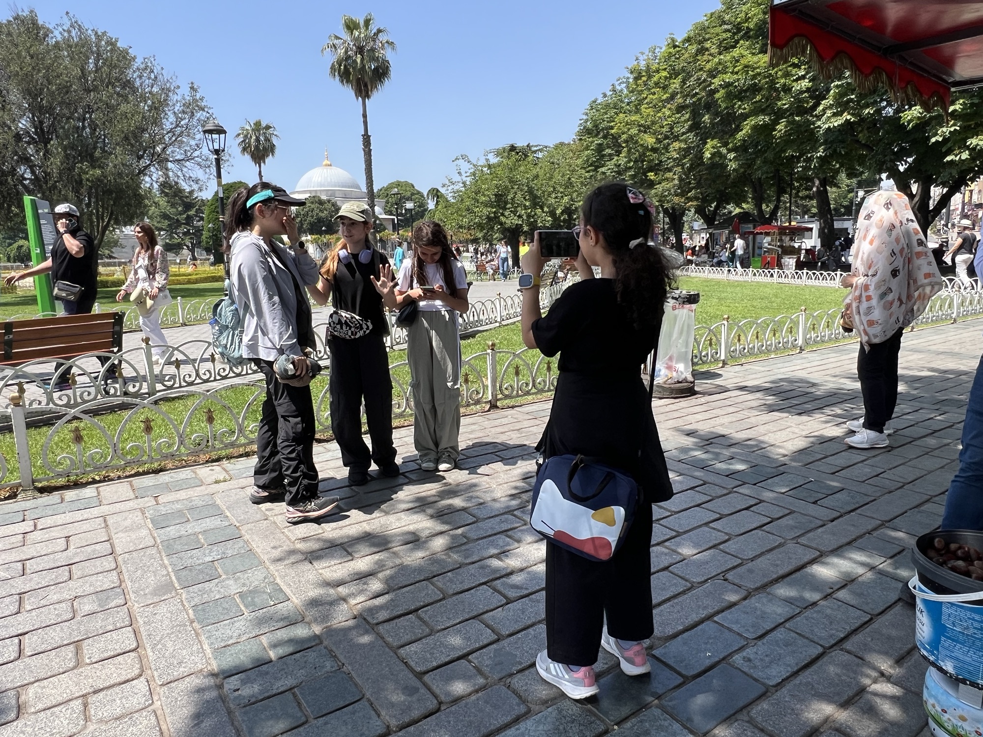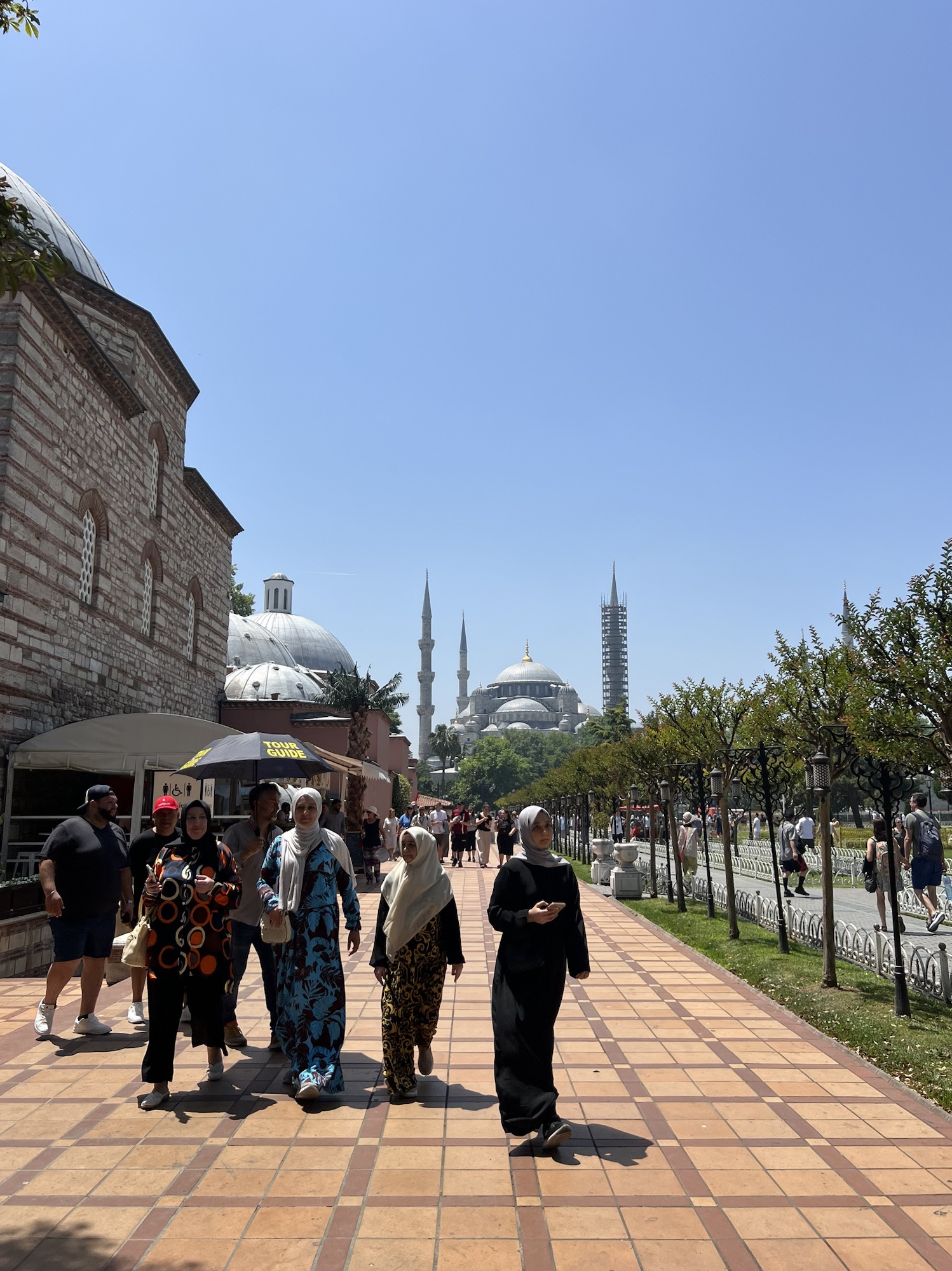 略感失望的離開聖索菲亞,廣場另一側遠遠就看到氣勢磅礡的藍色清真寺。我們拍照時又遇到興奮的土耳其小朋友,小朋友很羞澀的問茹茹:Can you speak English?她回答說Yes!妹妹就心花怒放的說:Then, we both speak English!然後扭捏的笑開懷!茹茹覺得自己穿的超隨便還有人要拍照,有點後悔,早知道就穿漂亮一點了,但是伊斯坦堡的太陽實在太毒辣,防曬還是第一要務。