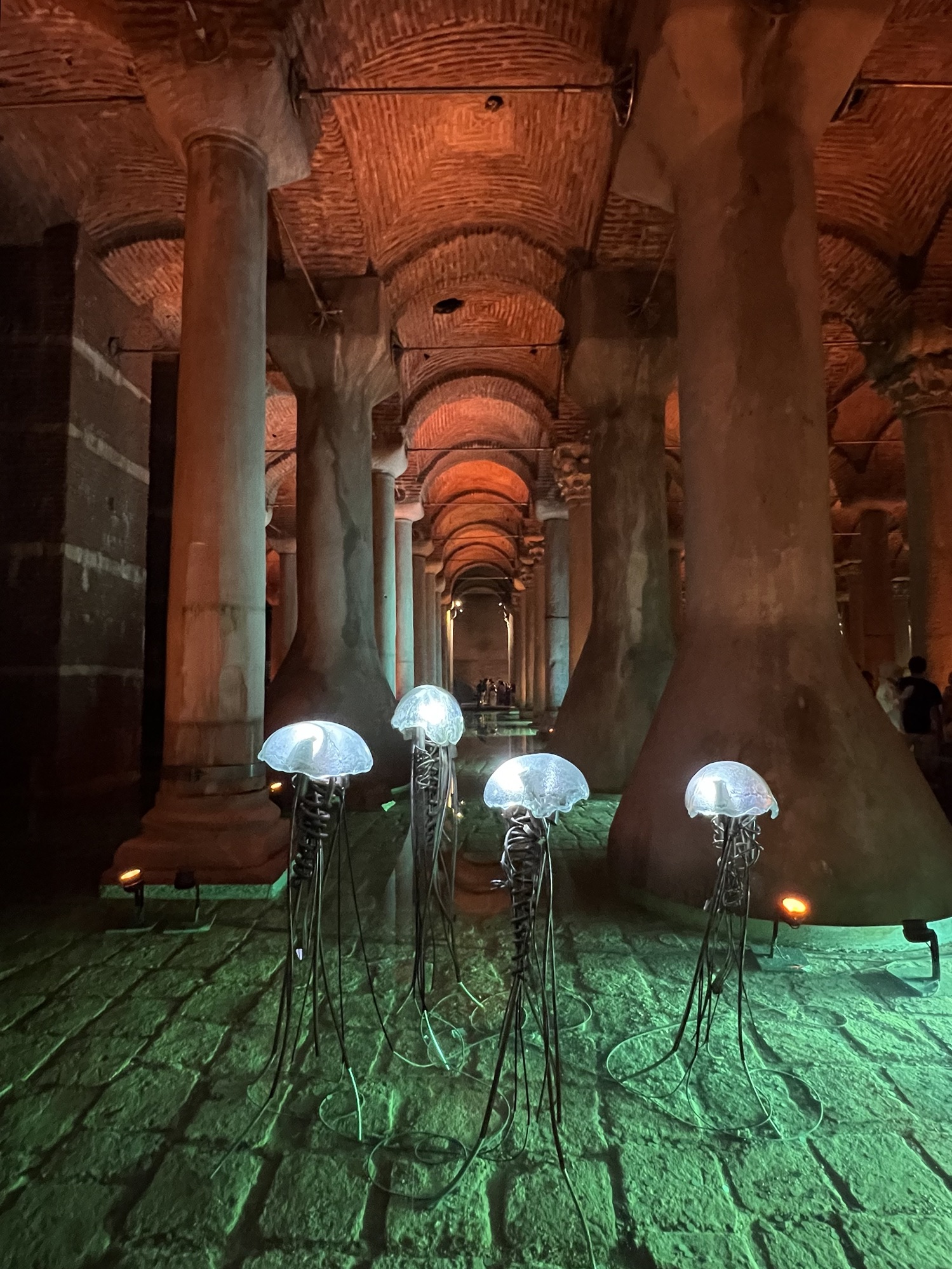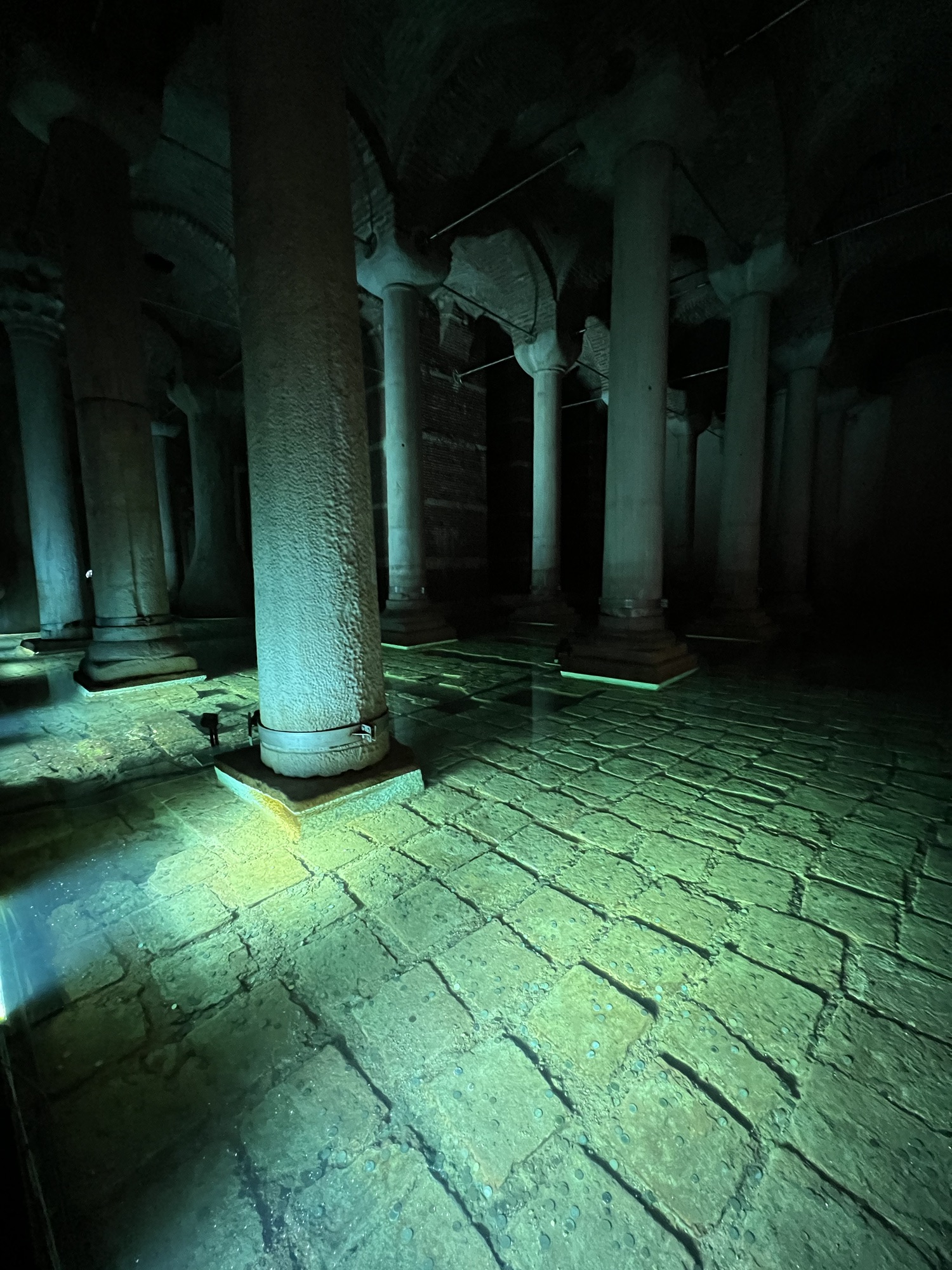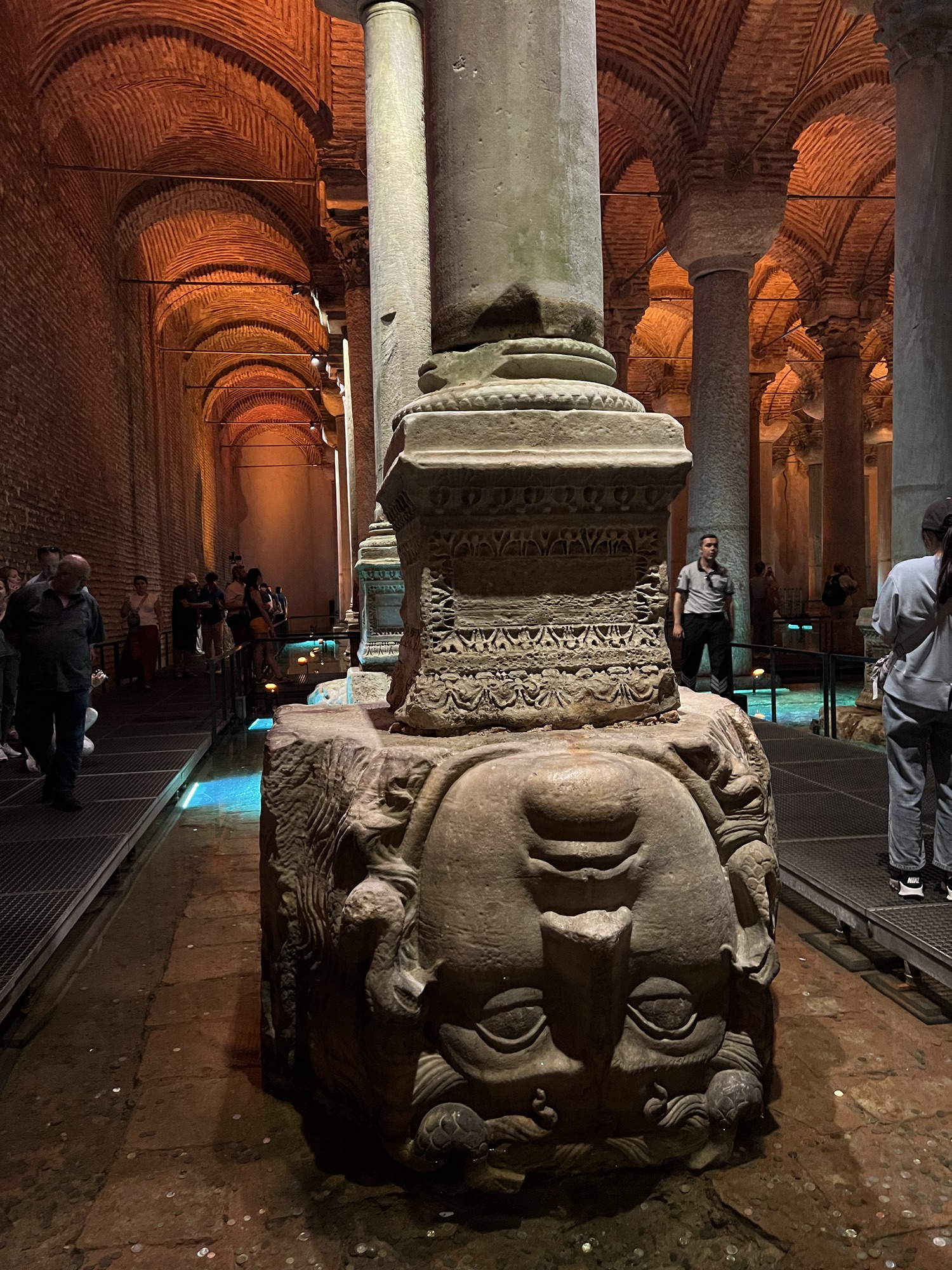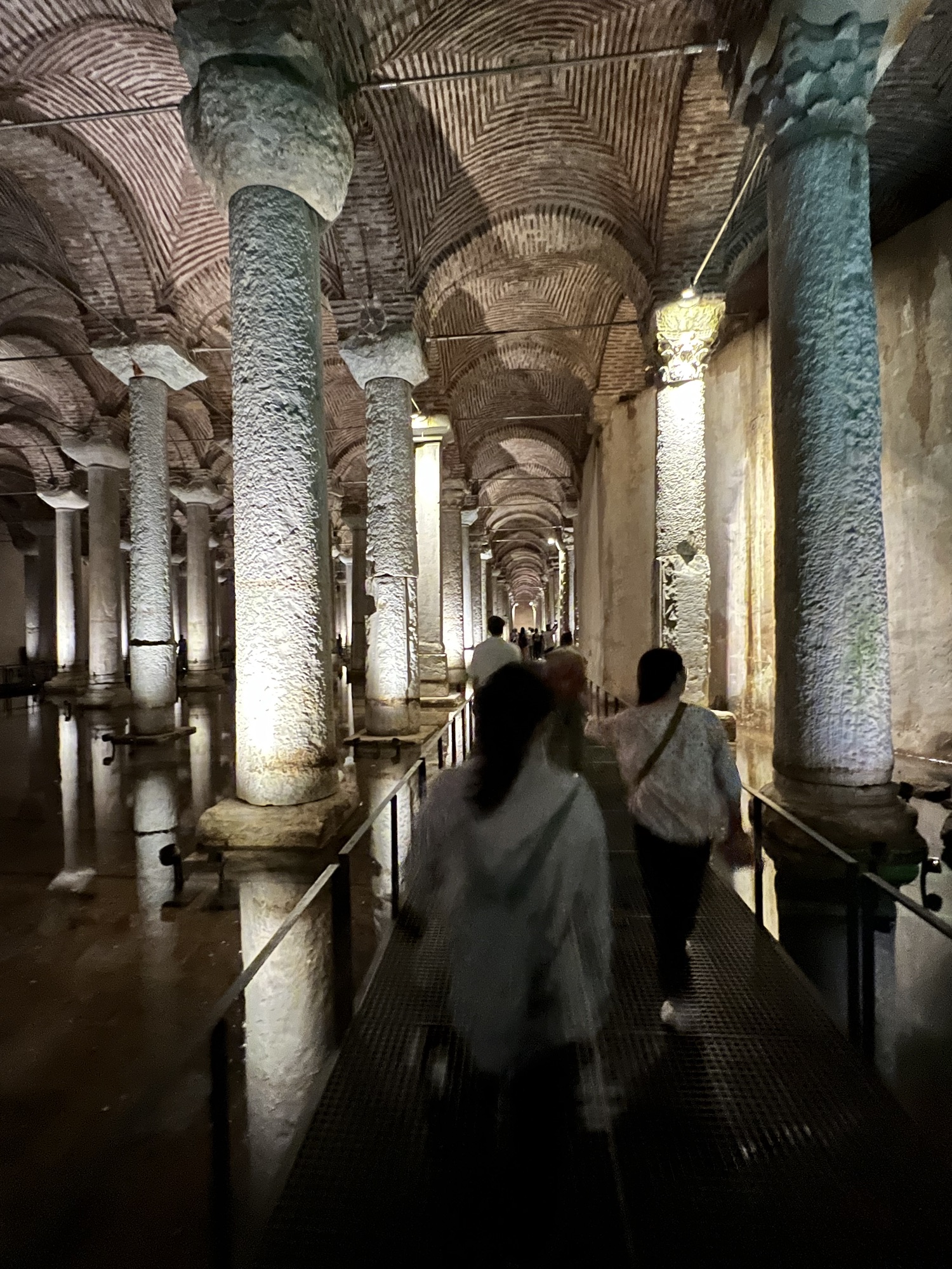 接著去馬路對面的地下水宮殿,入口有點難找,人雖然多但排隊很快,一個人800里拉一進去就覺得超級涼爽,在外面爆曬一頓裡面簡直是天堂。燈光會定時變換,黃色光很有古典感、紅色光很神秘、藍色光很清涼(?),不時穿插一些裝置藝術,聽說晚上會有光雕秀,但當然是要加錢(1300里拉)。壓在柱子下的梅杜莎的頭是最大熱點,還有一根充滿眼睛的柱子;右手邊一面高高的混凝土牆把觀光區塊分隔開,這個水宮殿應該只是羅馬時期儲水系統的一小小部分,真難想像全部有多大。茹茹覺得夭壽讚,伊斯坦堡景點第一名!