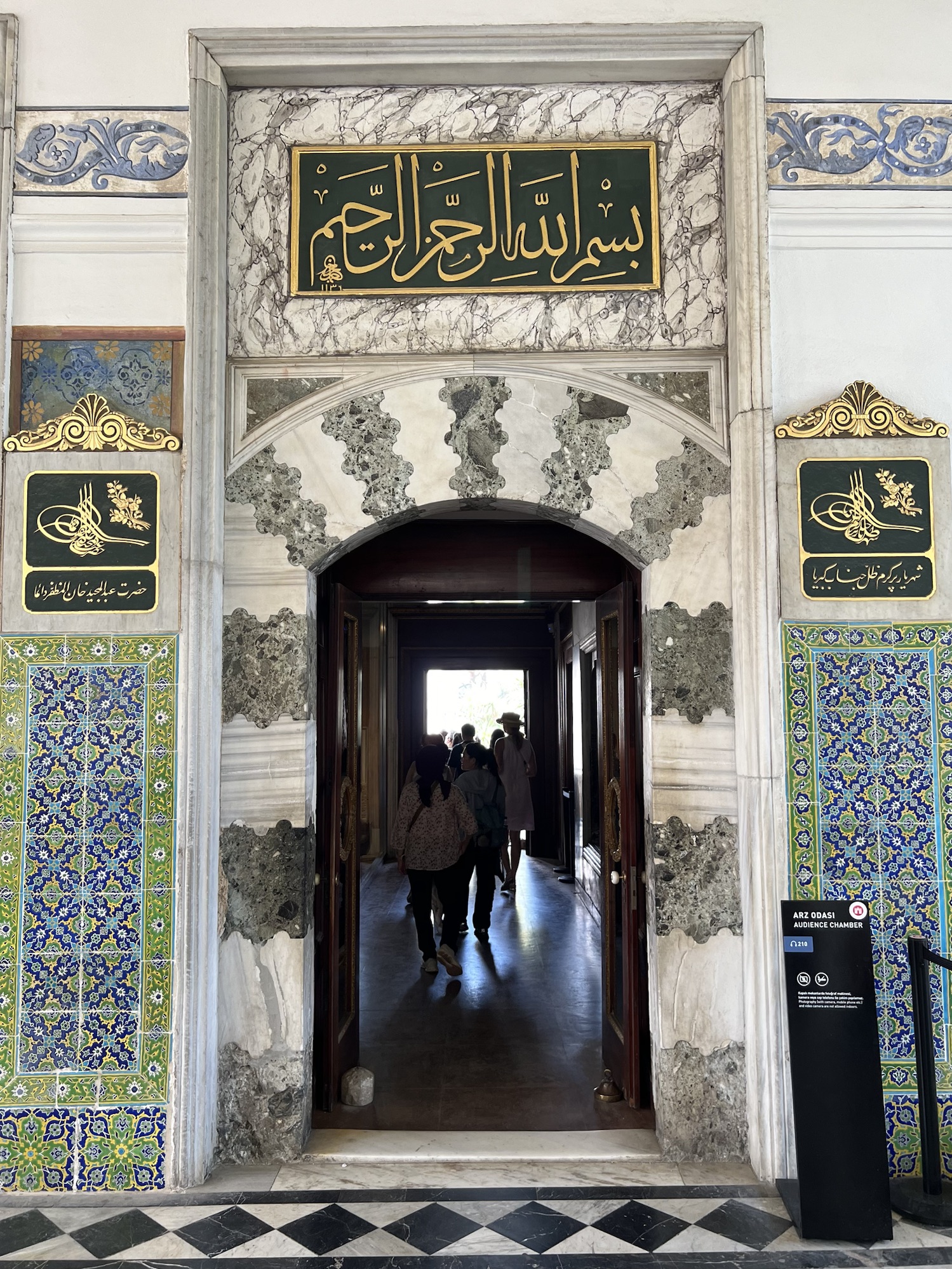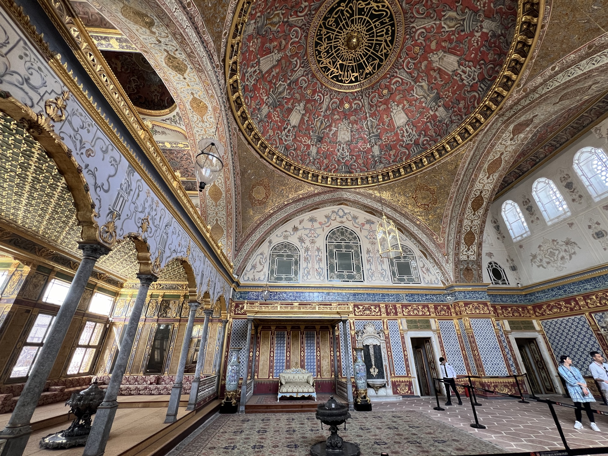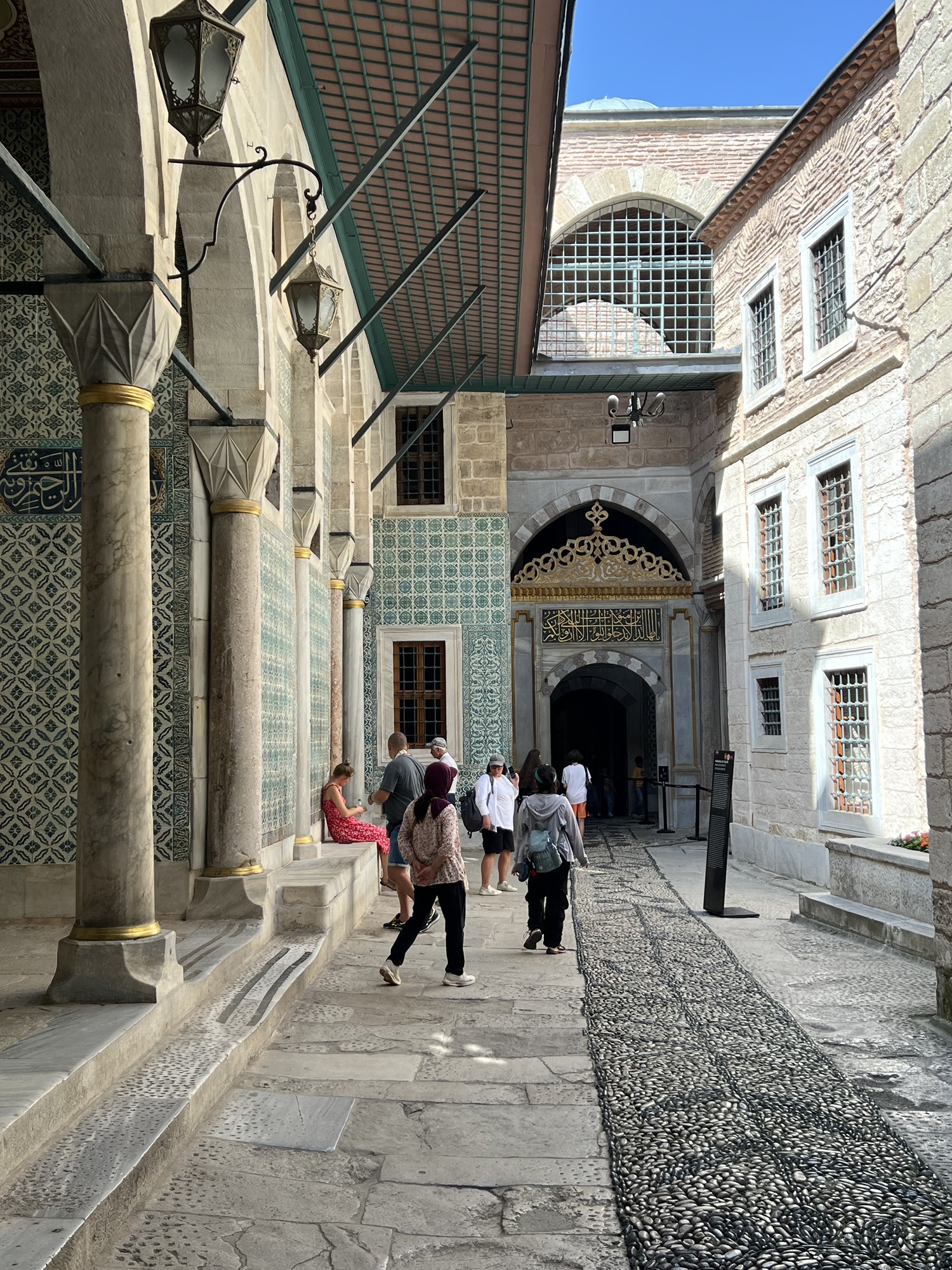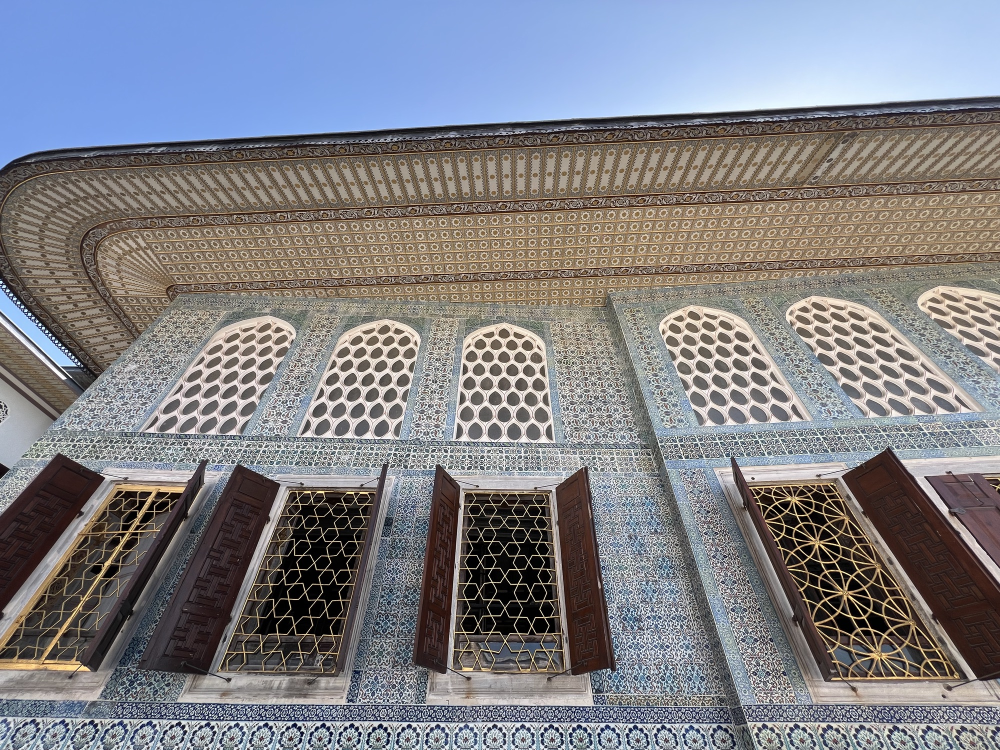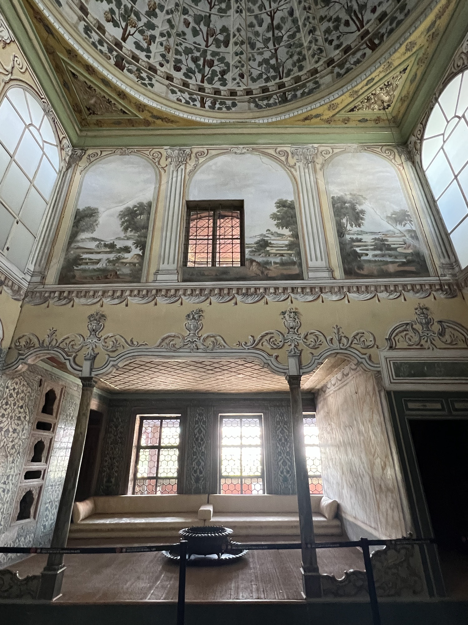 皇宮中女性生活的區塊叫作後宮,我們找了一陣才找到後宮入口。後宮的路和空間都變得擁擠不少,但功能性明確,還有很多間採光很好的浴室。大部分的功能性空間都沒什麼裝飾,多半只在門口點綴些彩色磁磚,內部就是乾淨的白牆。走到最後面蘇丹休息的臥榻,一切才突然變得華麗起來:除了五顏六色的磁磚圖騰和各種鑲金邊的門框,屋頂上還有精美的西洋風格山水畫和類似歐洲宮殿紋章的圖樣,和皇宮正殿典型伊斯蘭風格的單色圖樣相比活潑許多,也能感受到鄂圖曼帝國的文化包容性。