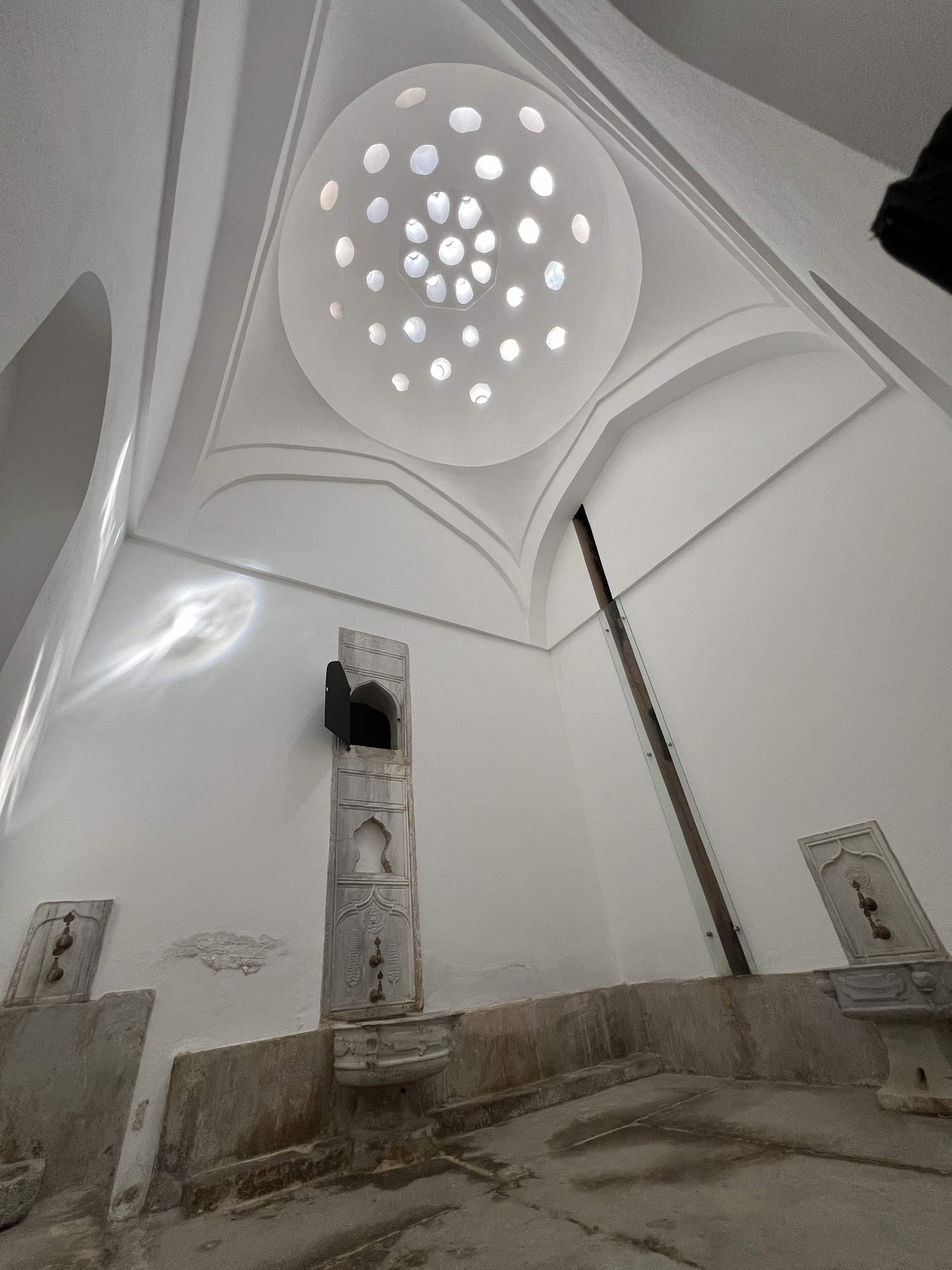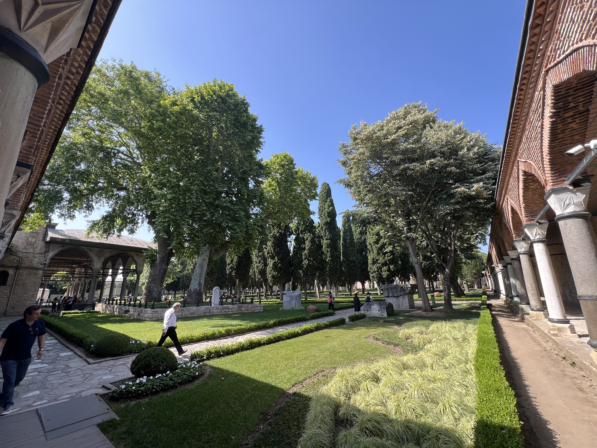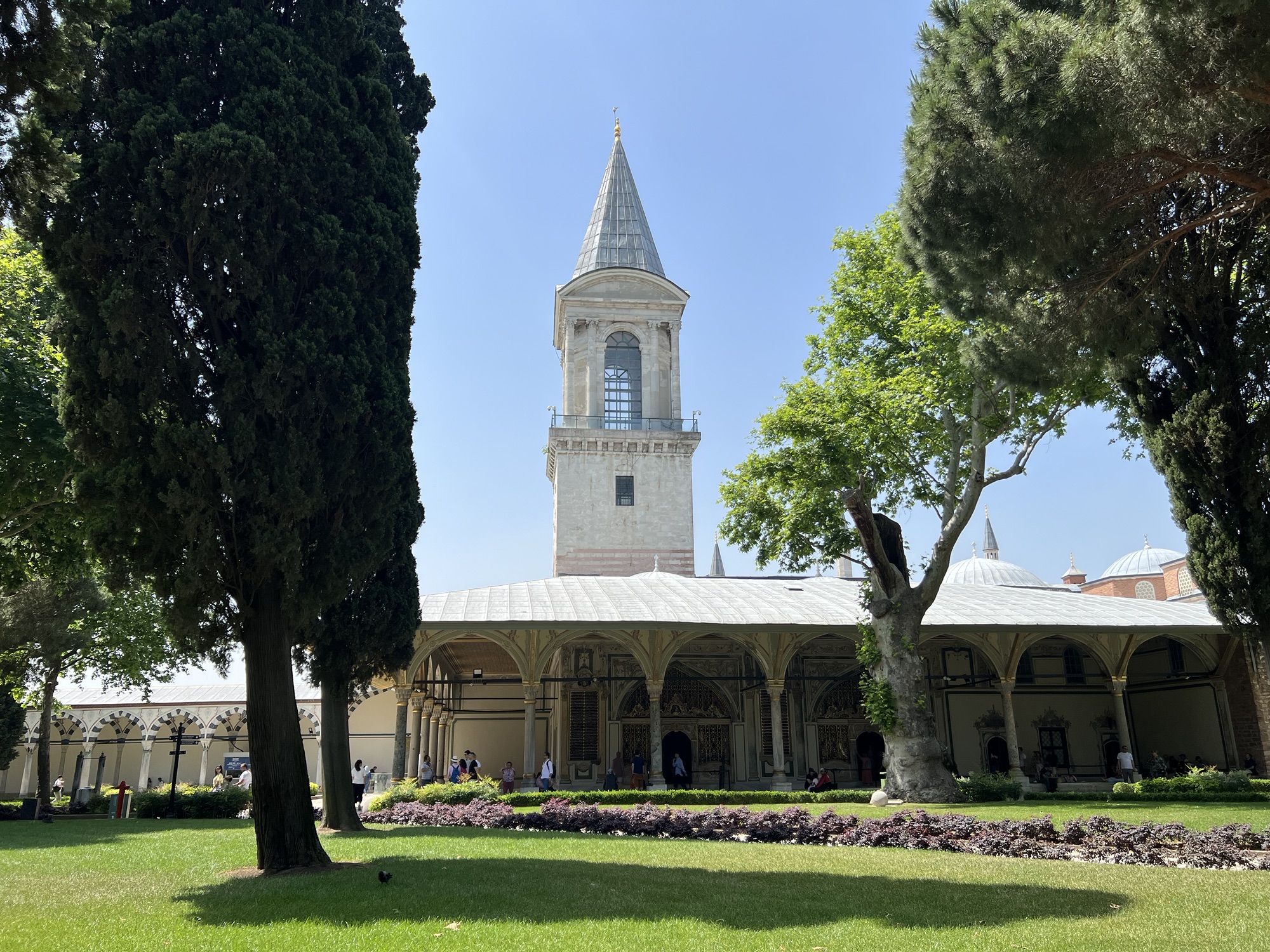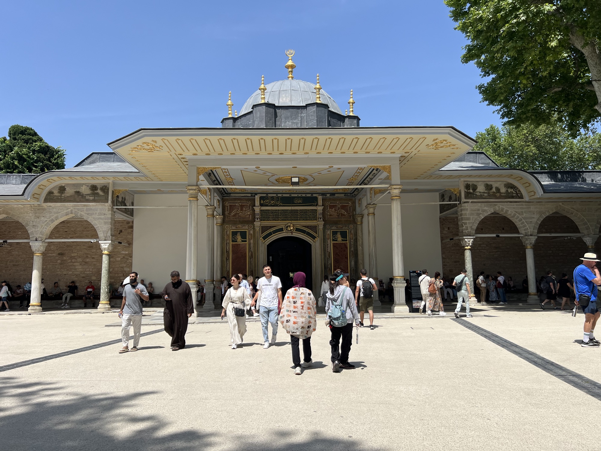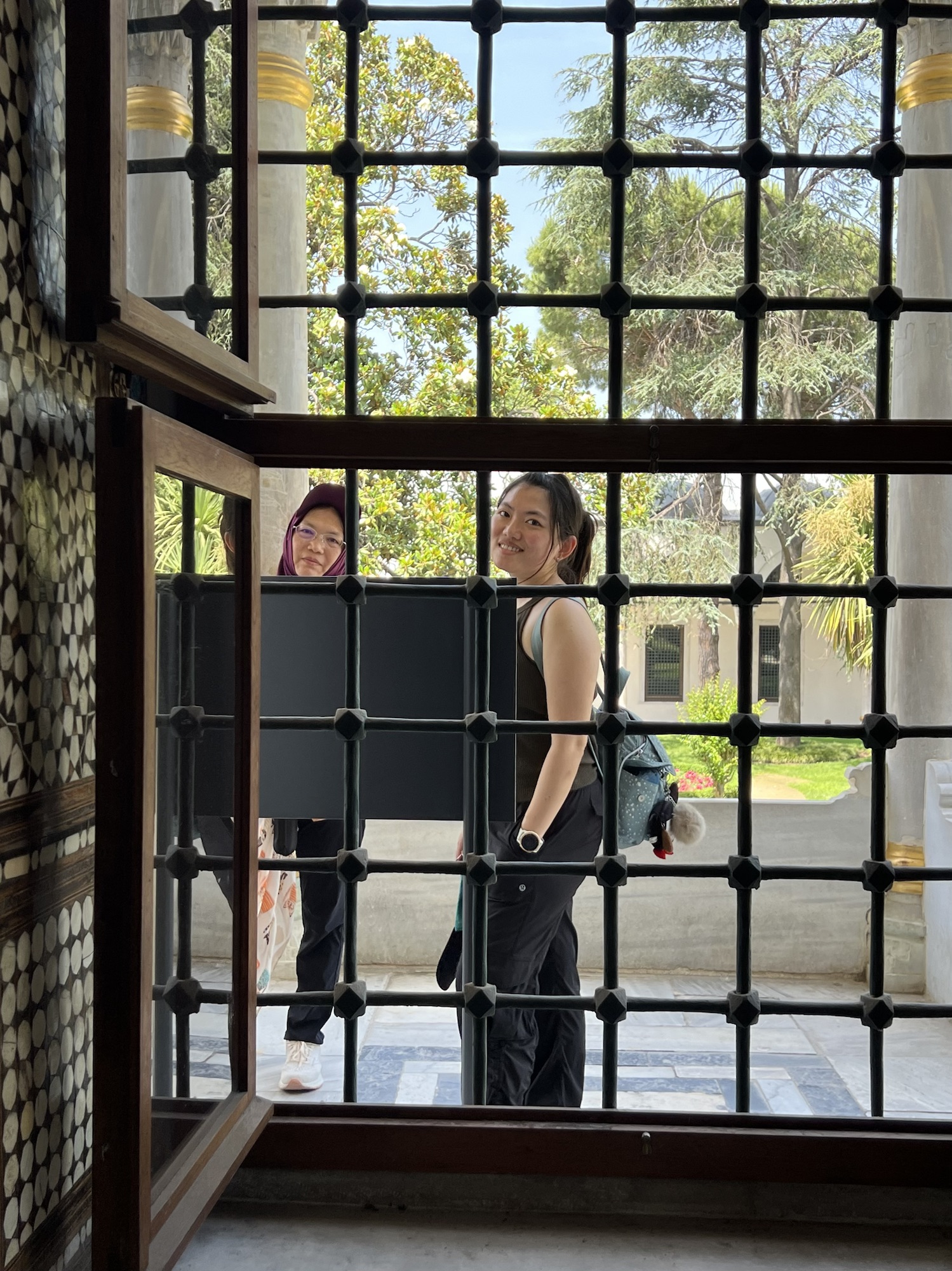 皇宮中女性生活的區塊叫作後宮,我們找了一陣才找到後宮入口。後宮的路和空間都變得擁擠不少,但功能性明確,還有很多間採光很好的浴室。大部分的功能性空間都沒什麼裝飾,多半只在門口點綴些彩色磁磚,內部就是乾淨的白牆。走到最後面蘇丹休息的臥榻,一切才突然變得華麗起來:除了五顏六色的磁磚圖騰和各種鑲金邊的門框,屋頂上還有精美的西洋風格山水畫和類似歐洲宮殿紋章的圖樣,和皇宮正殿典型伊斯蘭風格的單色圖樣相比活潑許多,也能感受到鄂圖曼帝國的文化包容性。