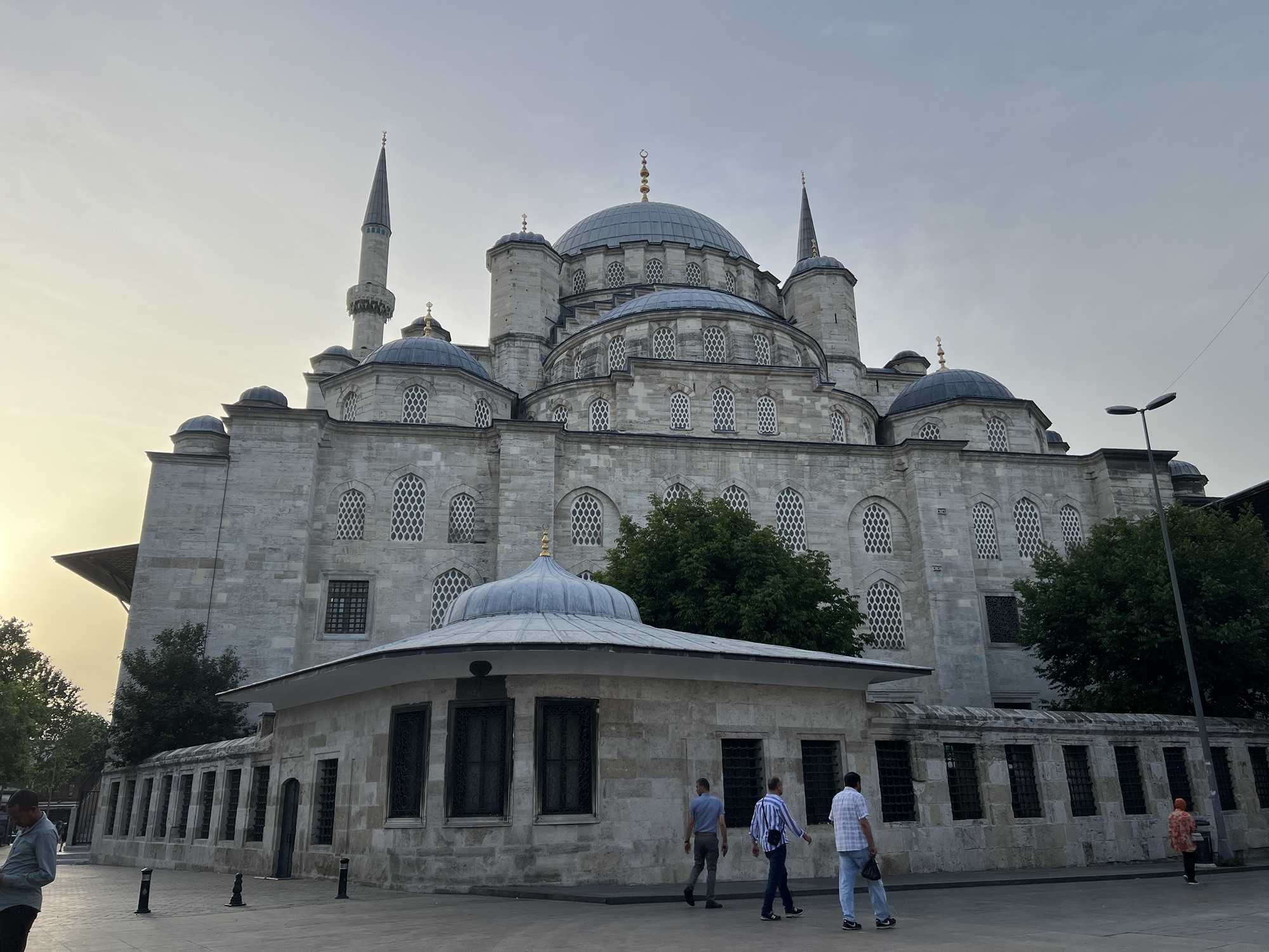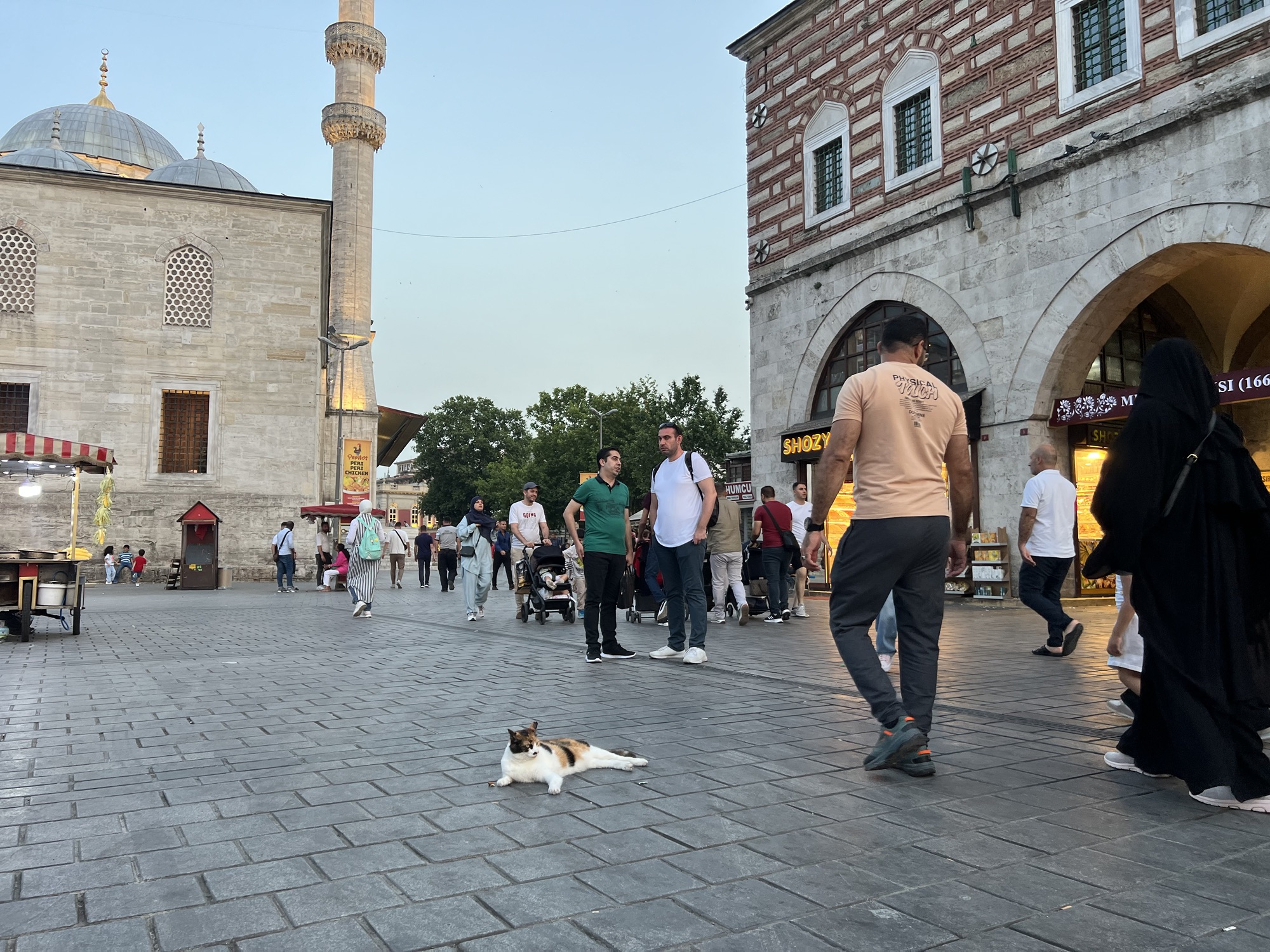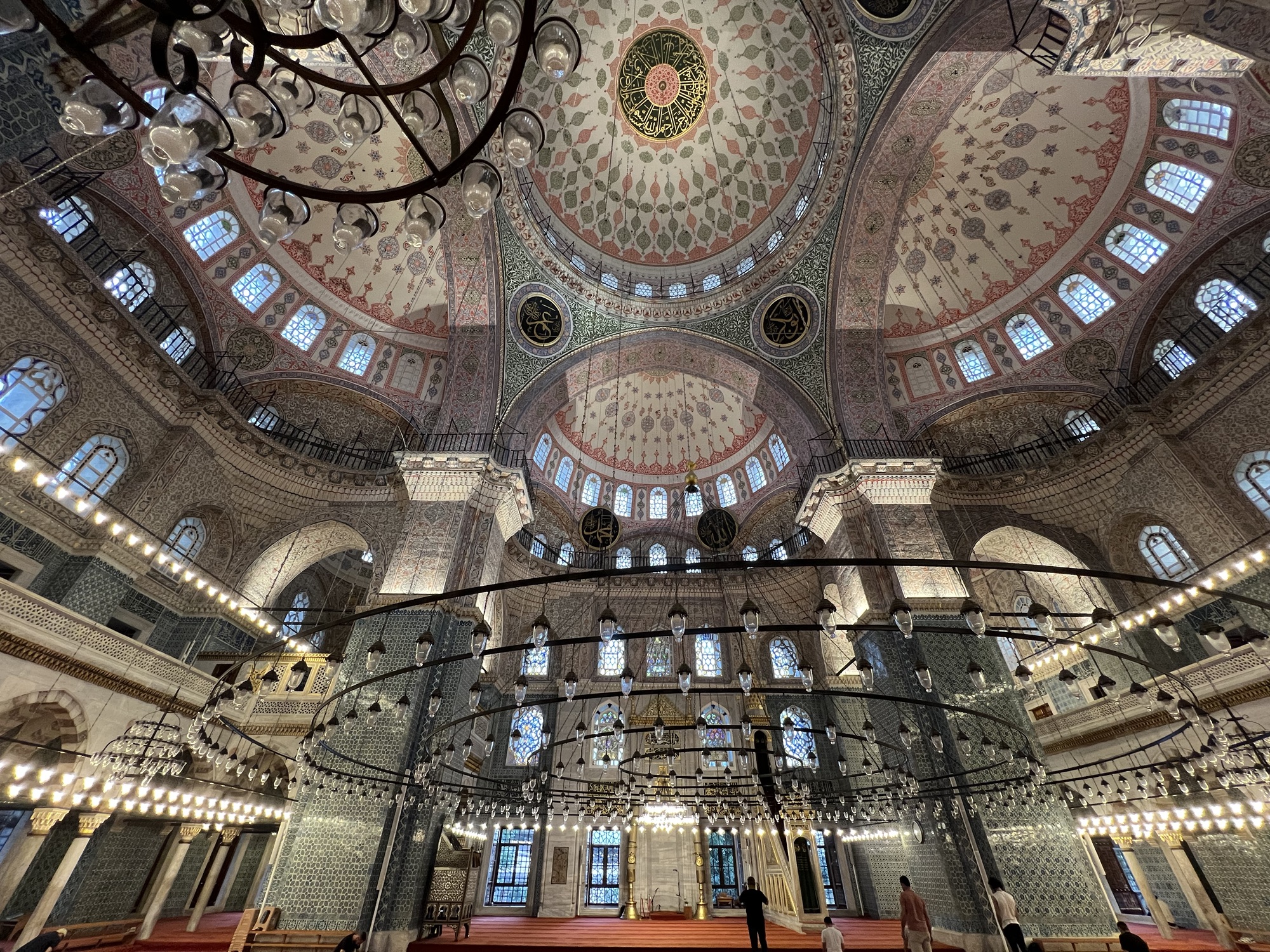 走到香料市集前的新清真寺,說是「新」其實也是十七世紀建的清真寺了,當時因為原本建到一半的清真寺被大火燒毀,重建才叫做新清真寺,同一時間也在新清真寺旁建了香料市集。新清真寺一直是我很喜歡的清真寺,比起宏大的藍色清真寺,我更喜歡新清真寺的精緻典雅,內部的磁磚彩繪除了經典的藍,還有天花板的紅和綠,多了一份活潑的氣息。我們照著規定脫了鞋入內,因為會進來參觀的遊客不多,自然也不會有什麼特別管制,就像當地民眾一般,感受寺內靜謐的氛圍。