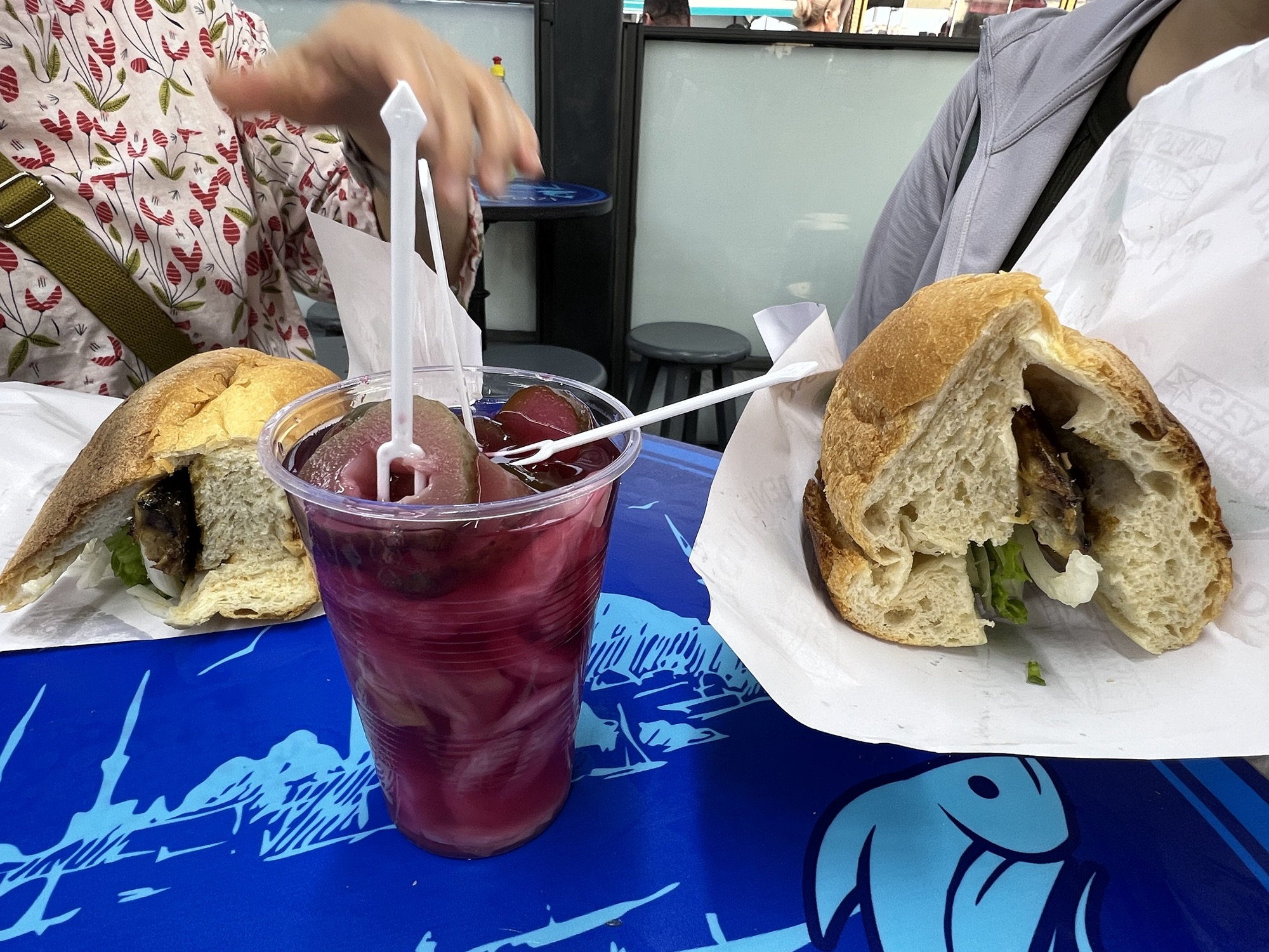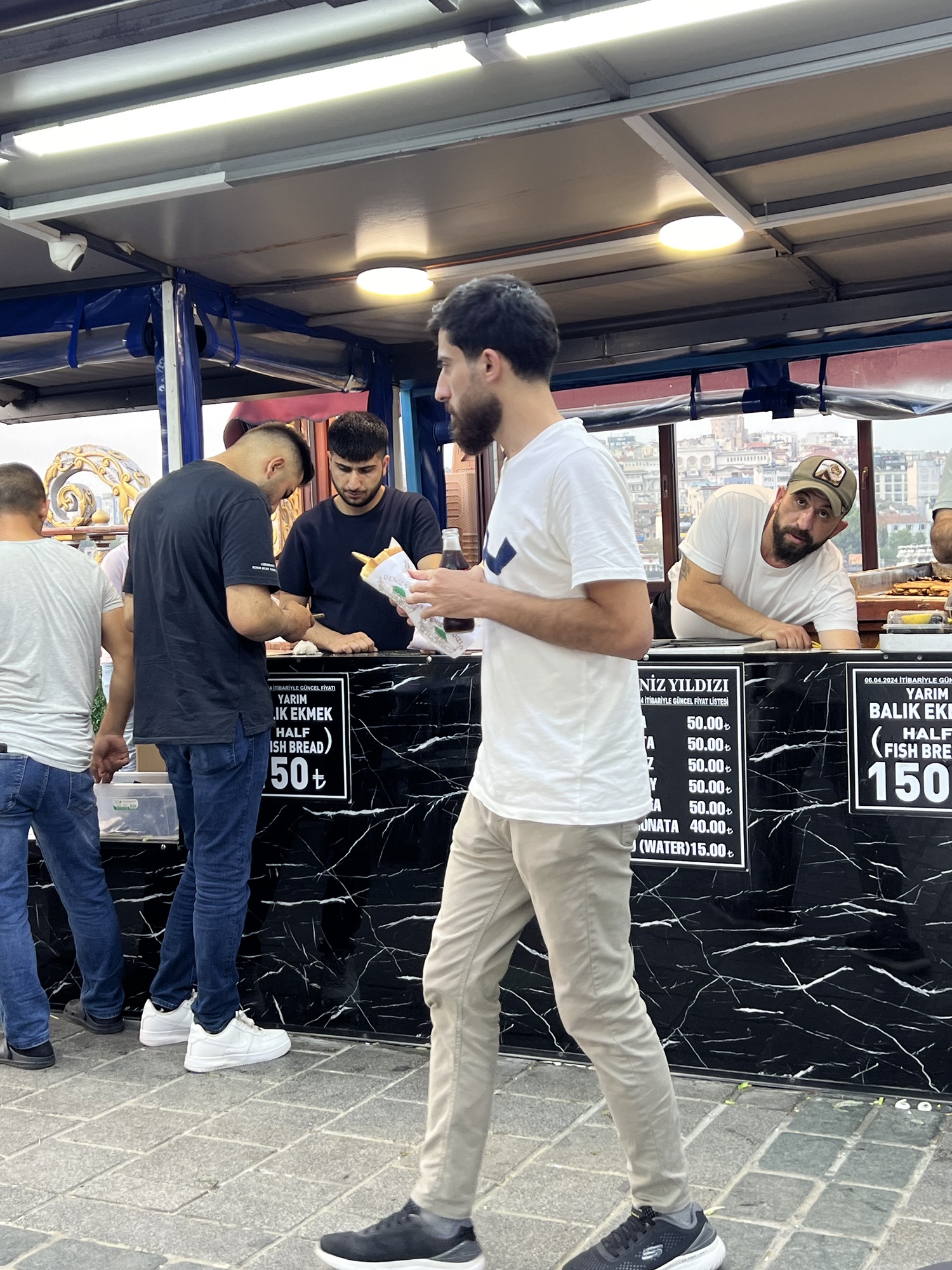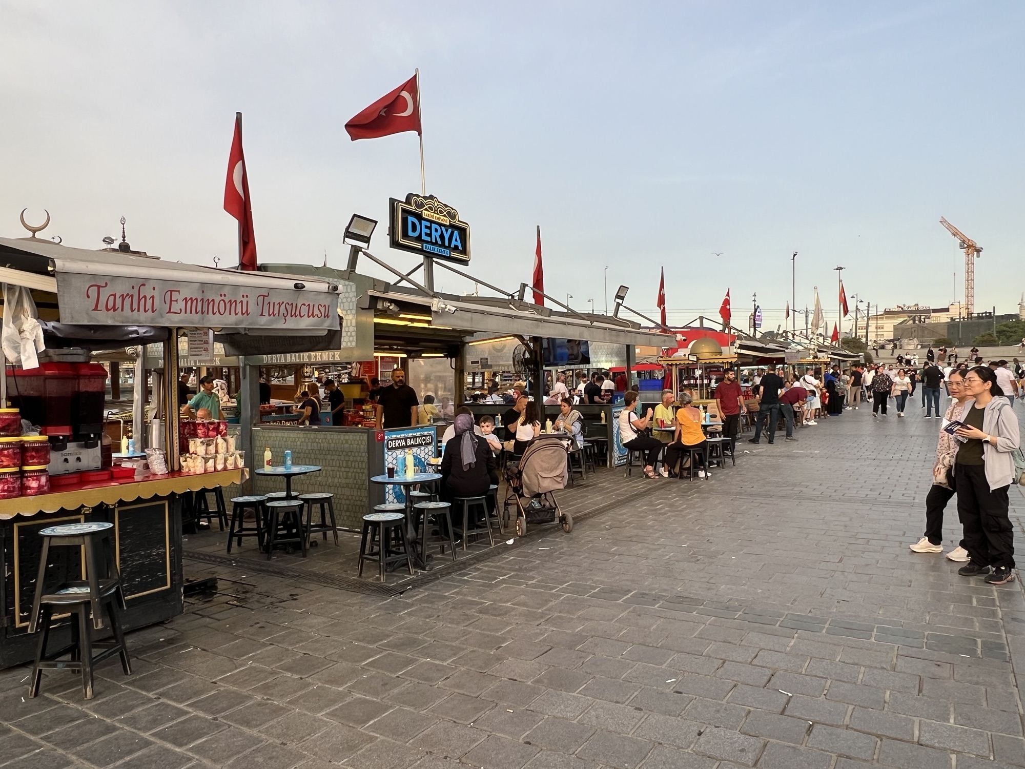 新清真寺就在艾米諾努港邊,走過充滿A貨的地下道後就是海了。海邊有幾家老字號的鯖魚三明治店,都是岸邊一個店面、連接著港口漂浮著的華麗小漁船,那艘小漁船上負責燒烤當日捕來的鯖魚,由岸上的店面加上洋蔥生菜,再用麵包夾起來就是美味的鯖魚三明治!店家多半也會賣煮淡菜,但看起來十分普通。我們買了兩份三個人吃,一份150里拉,另外跟走來走去叫賣的泡菜小哥買了一杯紫紅色的泡菜(一杯50里拉),搭配三明治真是絕配!不過吃鯖魚還是要小心魚刺,不然就是要多嚼幾下把刺給嚼碎了吞掉。旁邊一個英國腔阿伯買到一份鯖魚特別小的在跟店家吵架,但看起來吵不贏,這種東西感覺很講運氣。(不過醃菜汁小哥給阿伯的價是10塊一杯,算是一種彌補?)