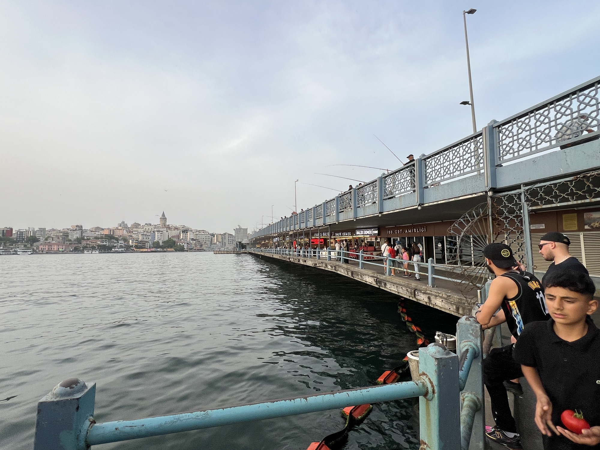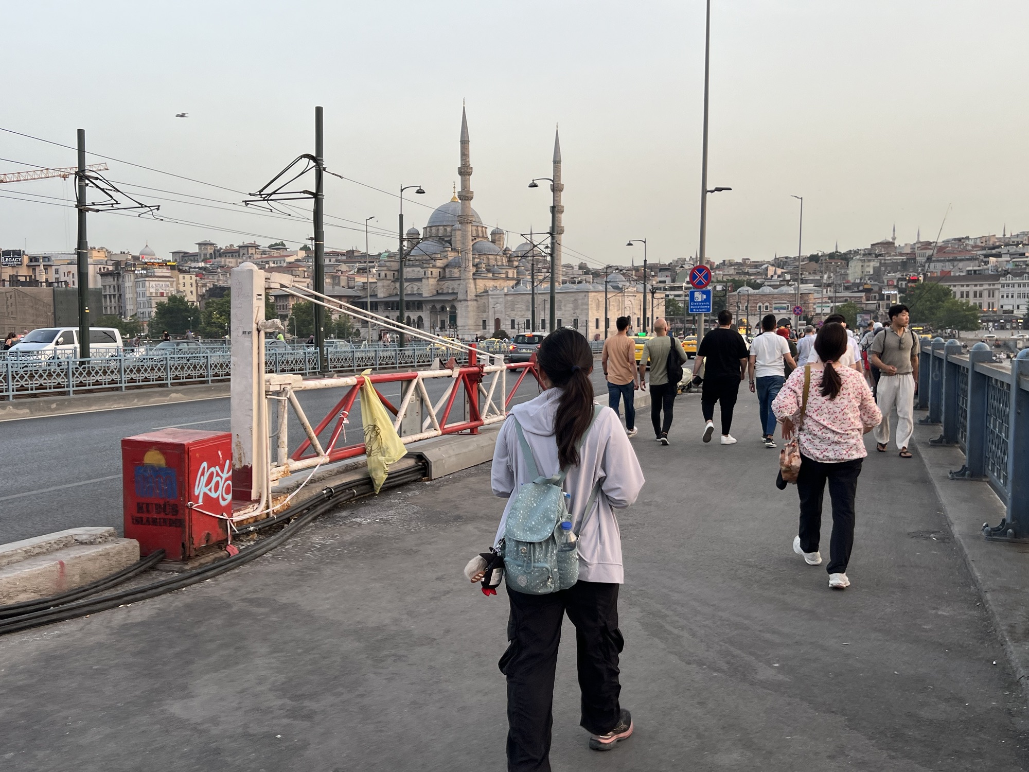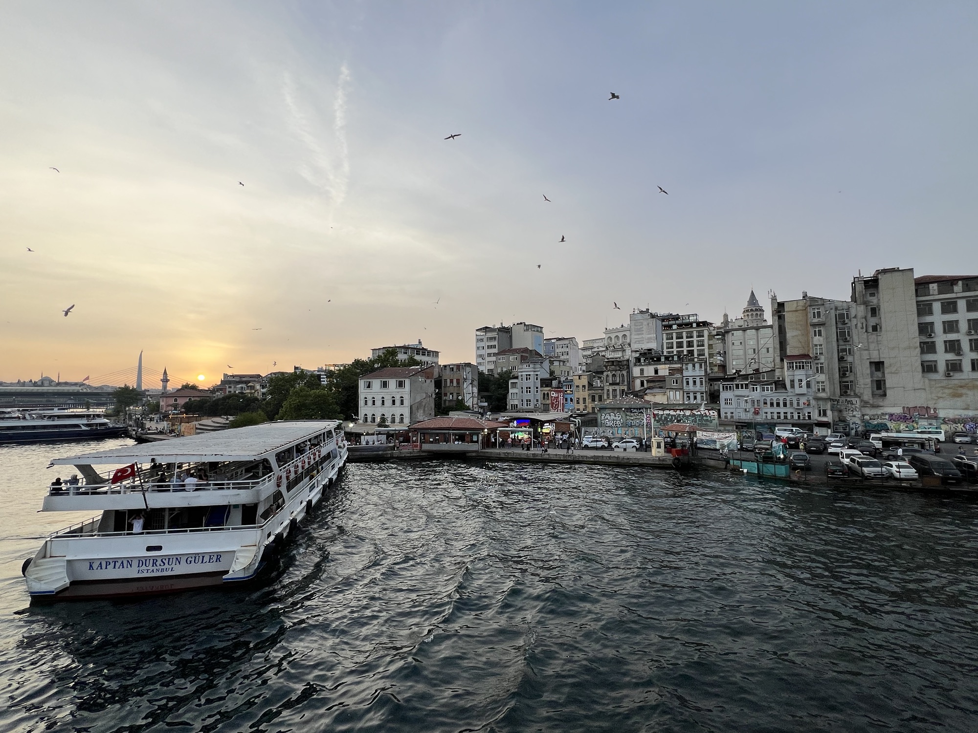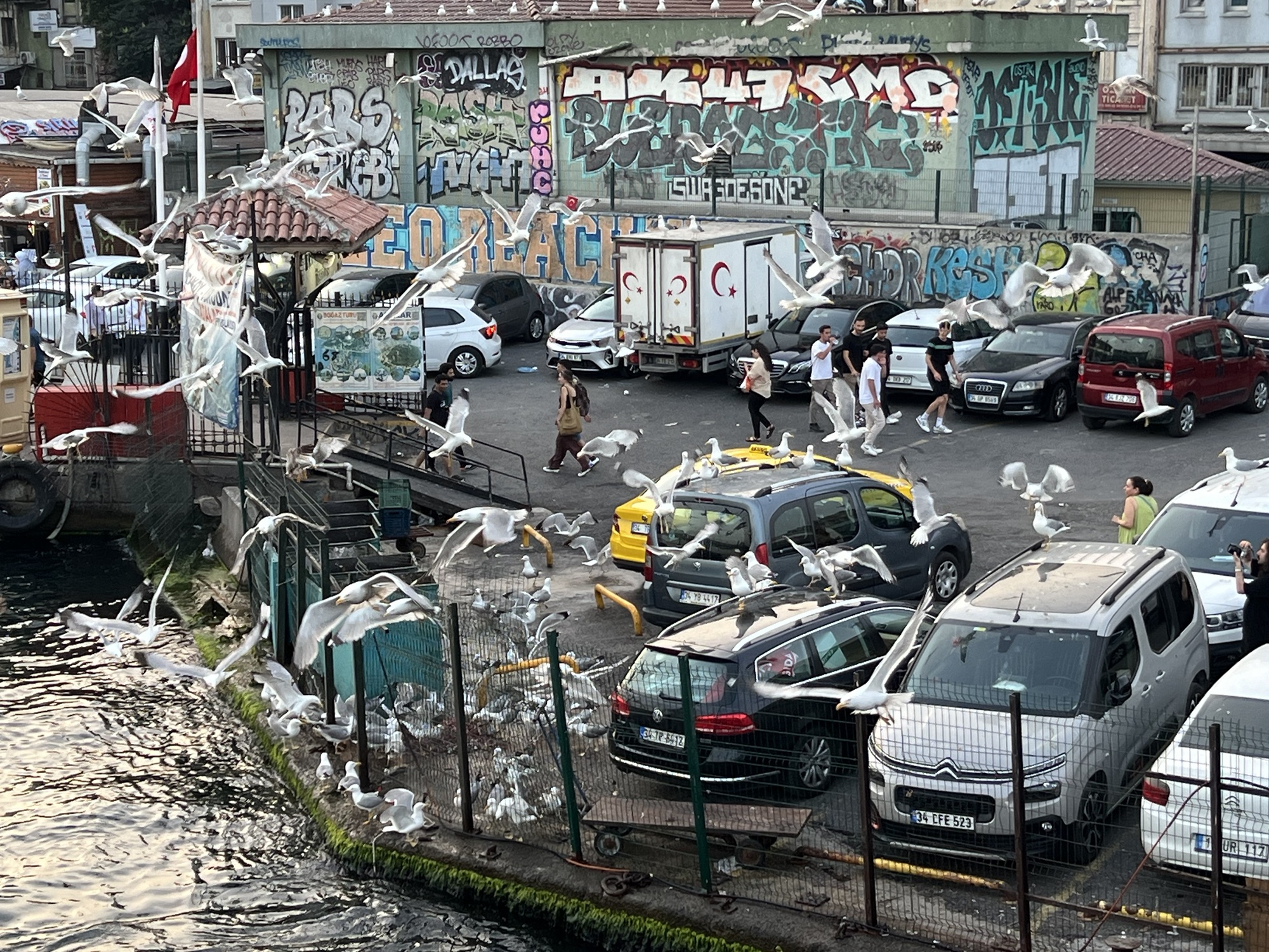 吃完三明治走上加拉塔大橋,橋下有好幾間海鮮餐廳不斷攬客。橋中央有個小平台能欣賞金角灣日落的海景,八點多正好是各家博斯普魯斯遊船的出發時間,我們一直跟船上的人揮手打招呼然後各種自拍。港邊海鷗非常多,尤其船隻經過時都會有大量海鷗跟著,不知道是不是因為船經過時魚容易跳起來。一直走到橋的另一側,發現有漁船會把魚內臟丟在港邊停車場餵海鷗,數百隻海鷗瞬間衝下來搶食,三兩下就幾乎吃了精光,就是會飛的野狗。