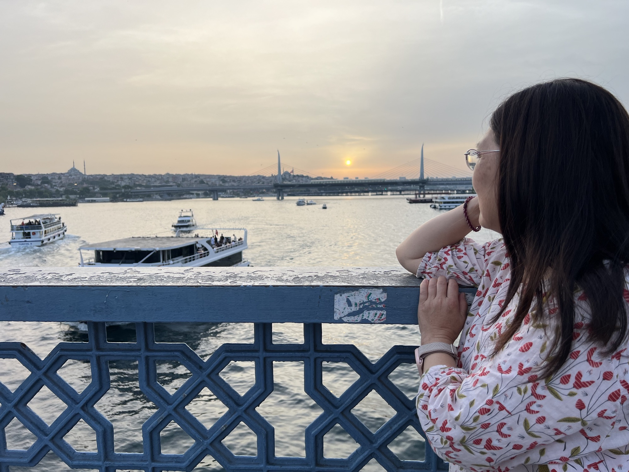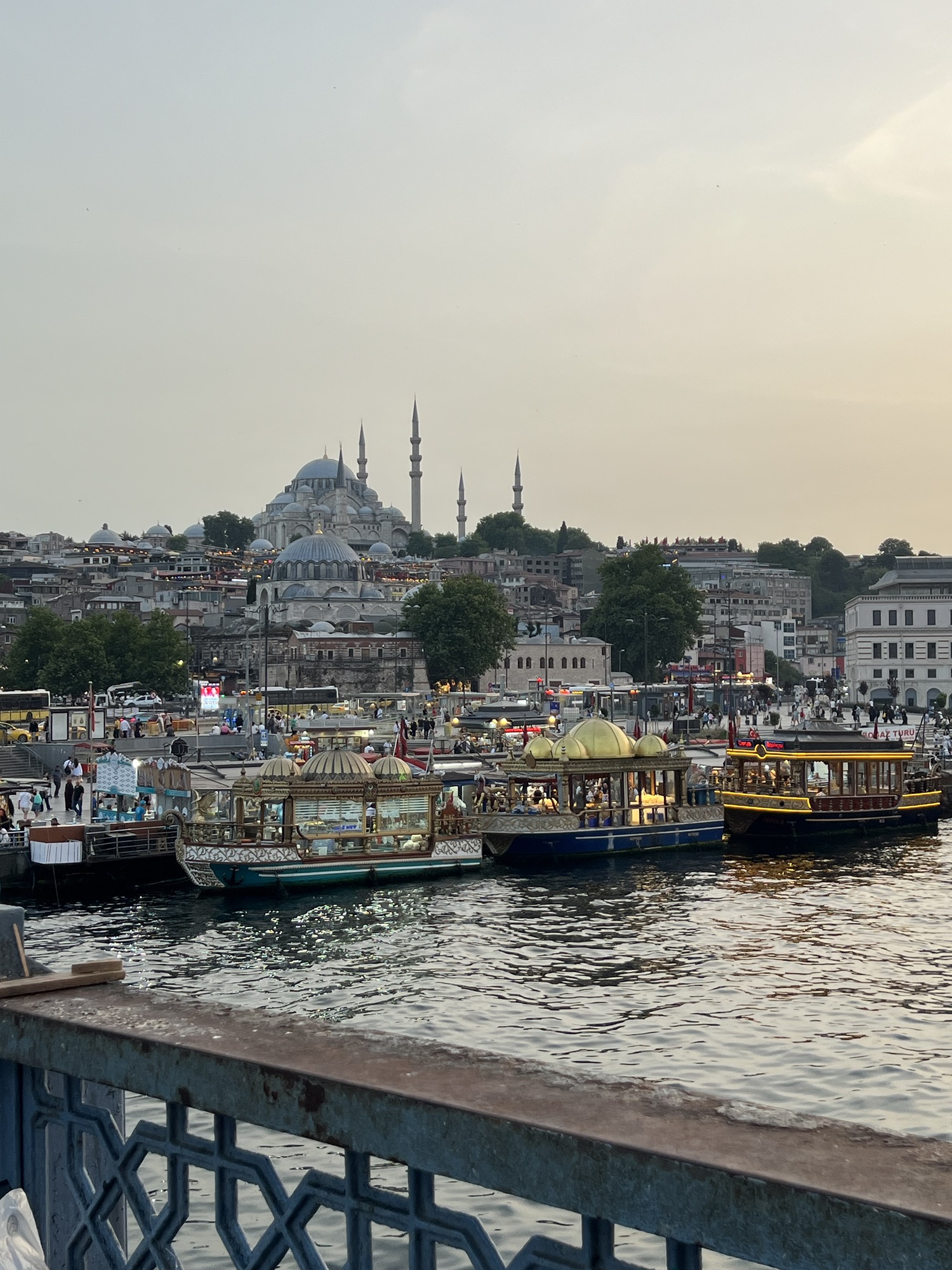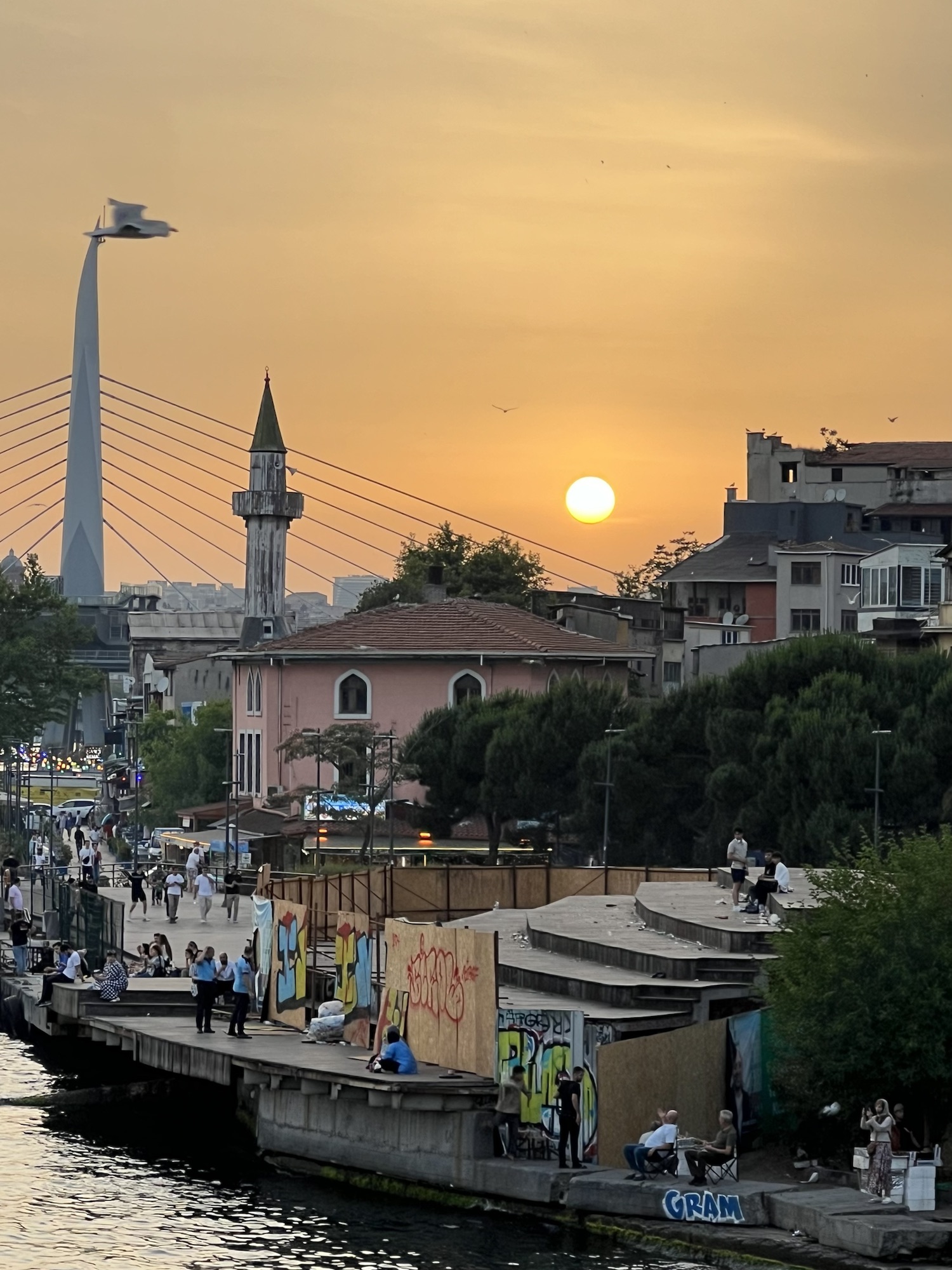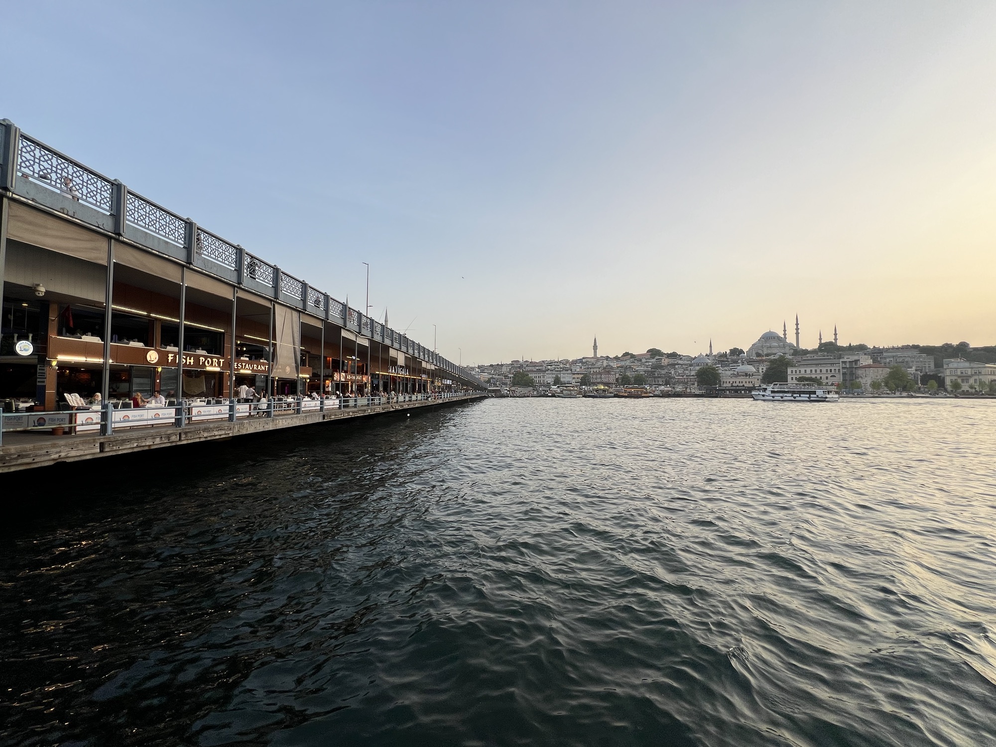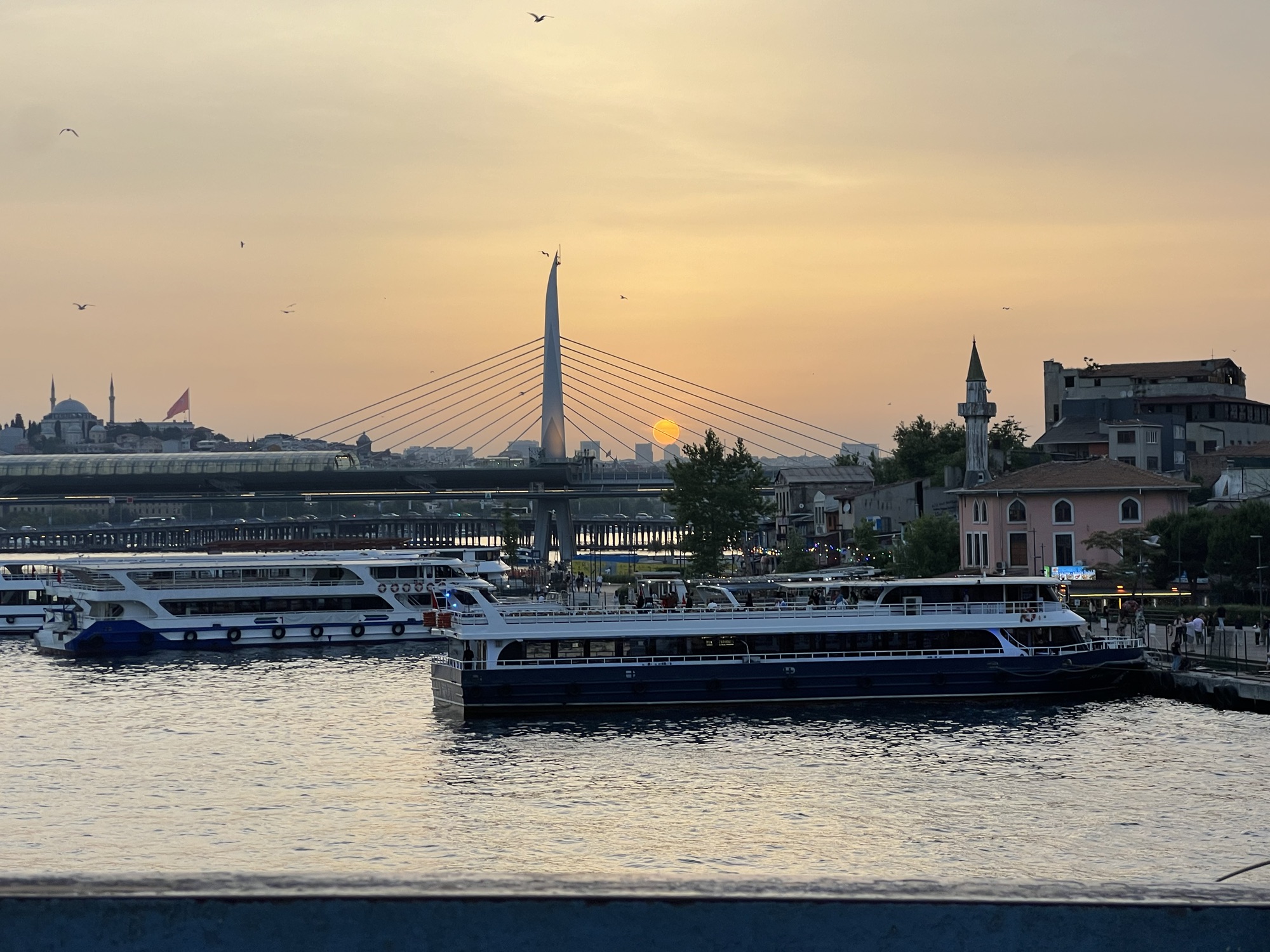 吃完三明治走上加拉塔大橋,橋下有好幾間海鮮餐廳不斷攬客。橋中央有個小平台能欣賞金角灣日落的海景,八點多正好是各家博斯普魯斯遊船的出發時間,我們一直跟船上的人揮手打招呼然後各種自拍。港邊海鷗非常多,尤其船隻經過時都會有大量海鷗跟著,不知道是不是因為船經過時魚容易跳起來。一直走到橋的另一側,發現有漁船會把魚內臟丟在港邊停車場餵海鷗,數百隻海鷗瞬間衝下來搶食,三兩下就幾乎吃了精光,就是會飛的野狗。
