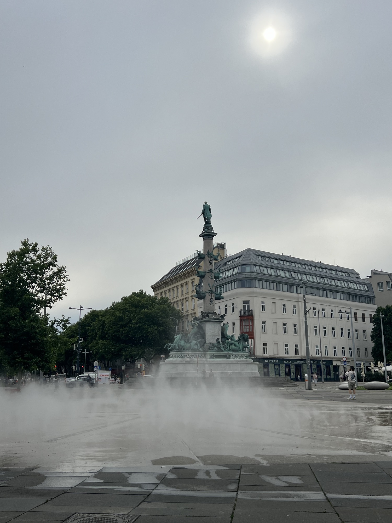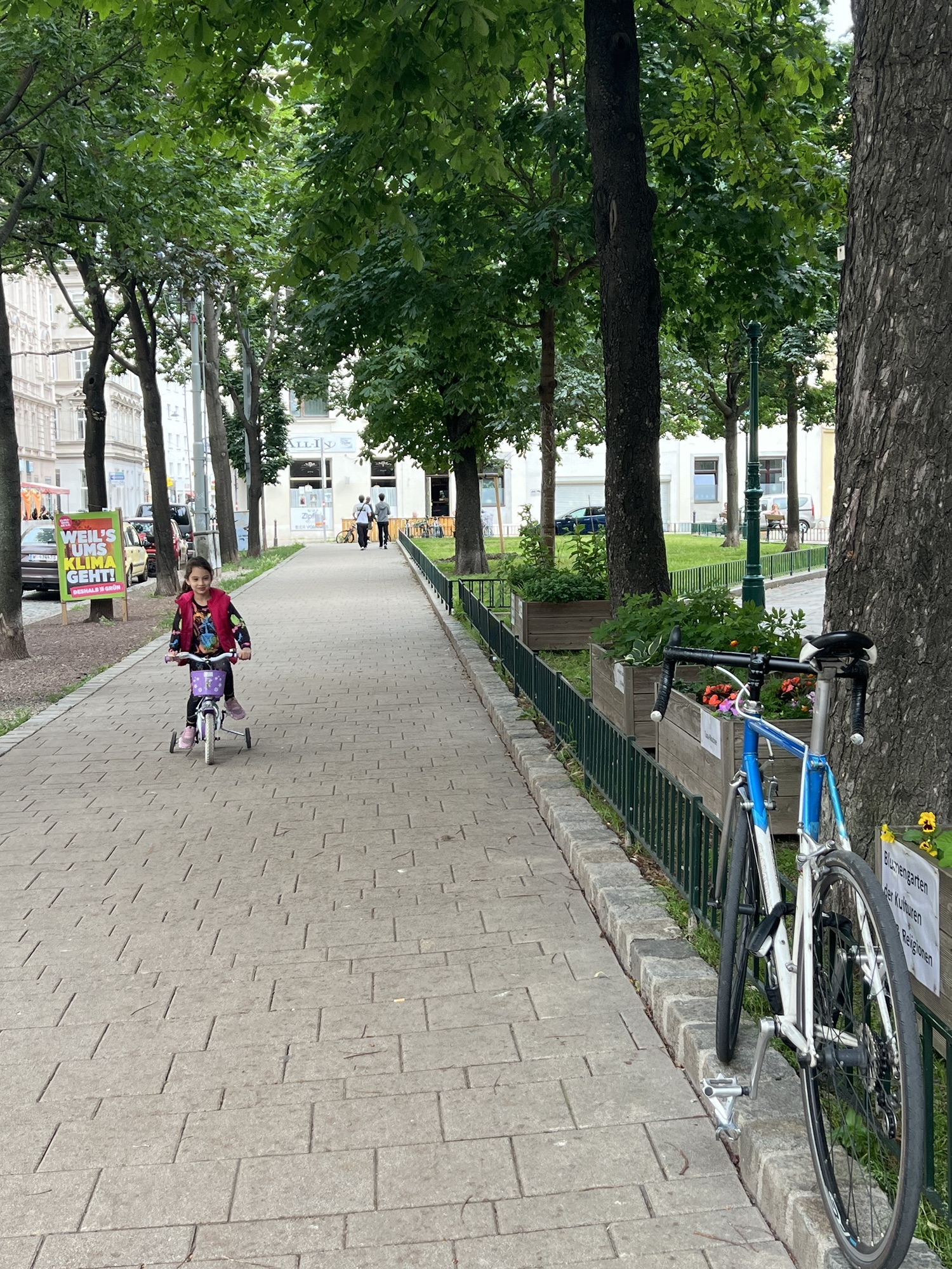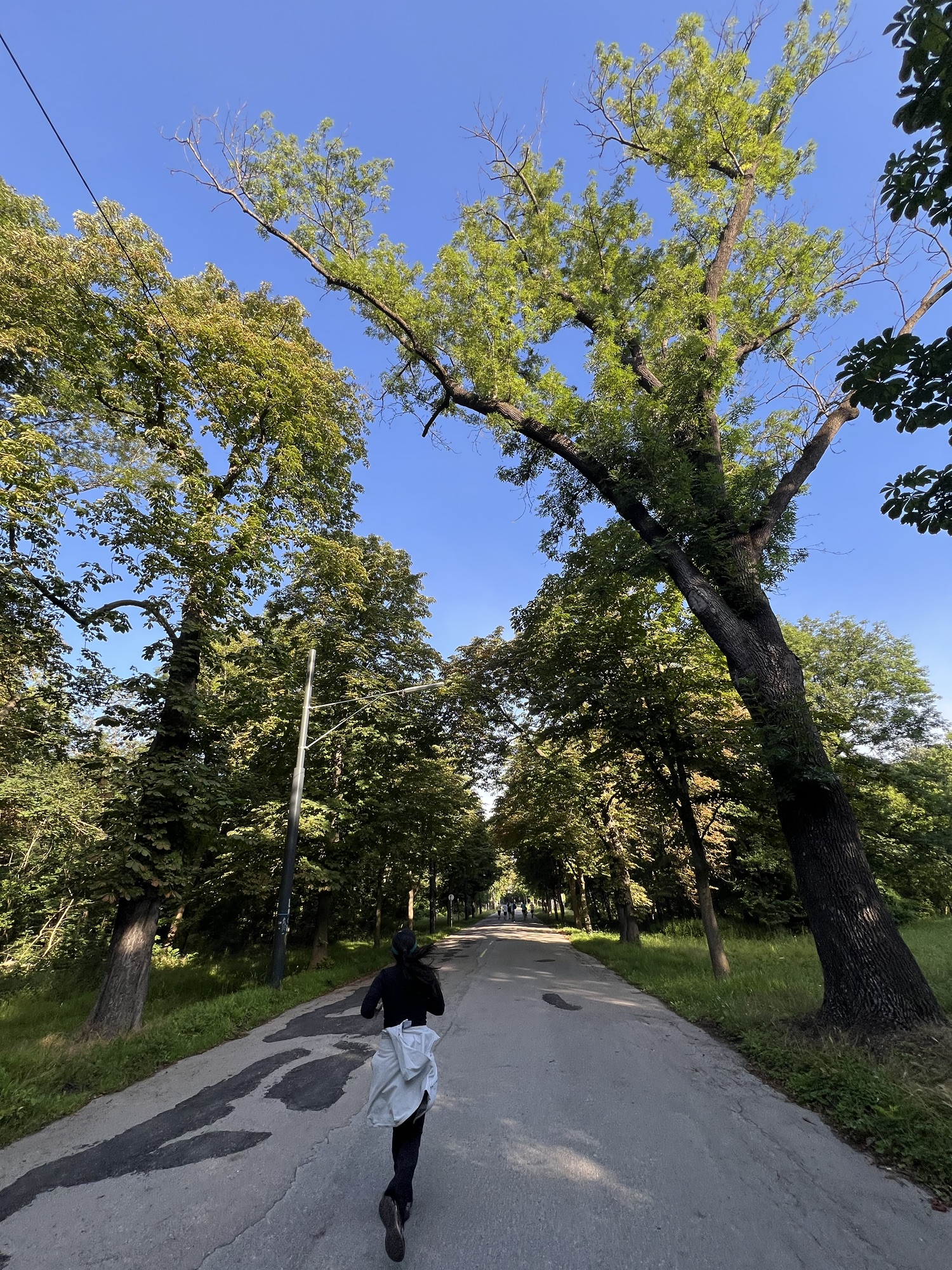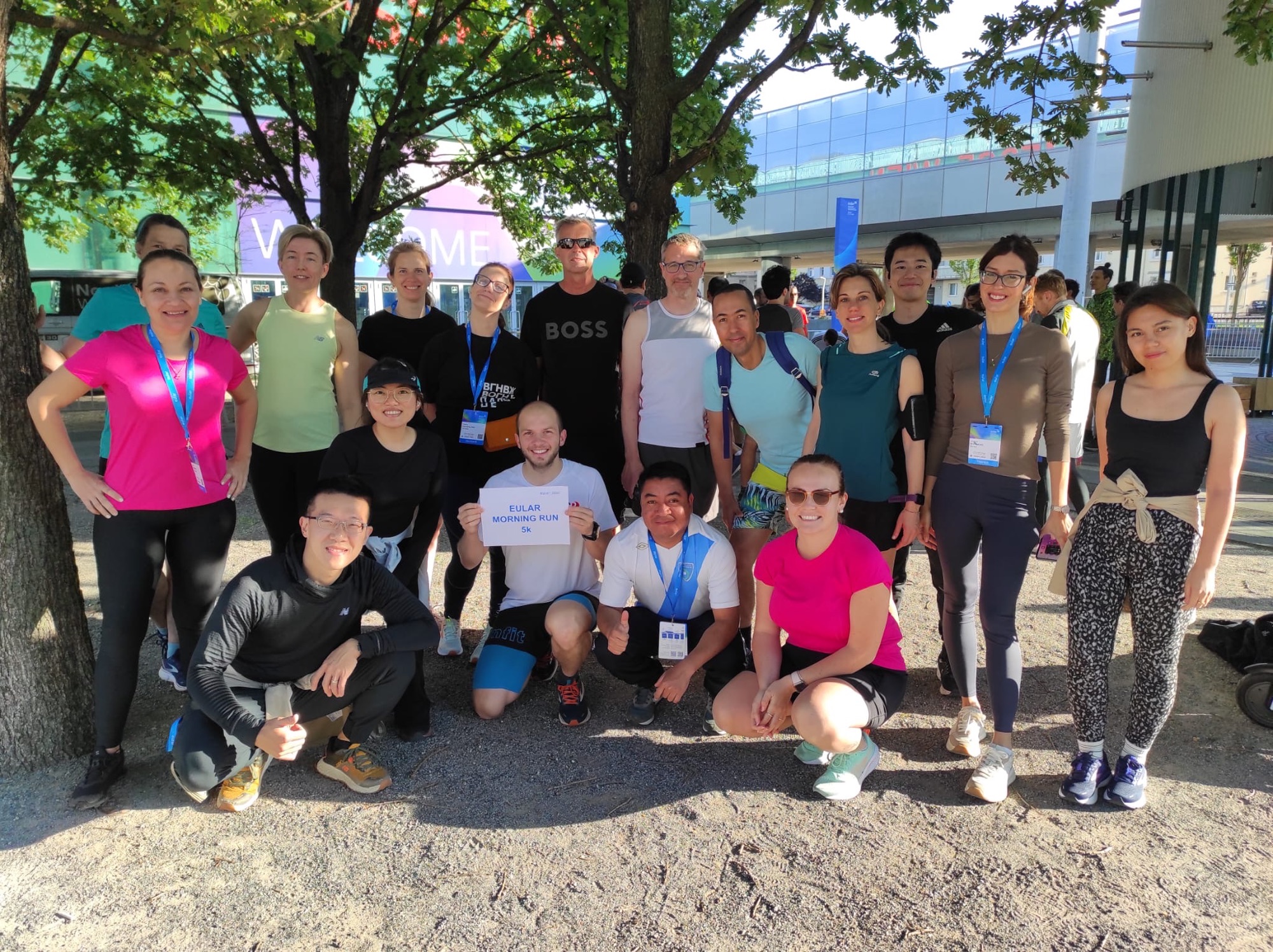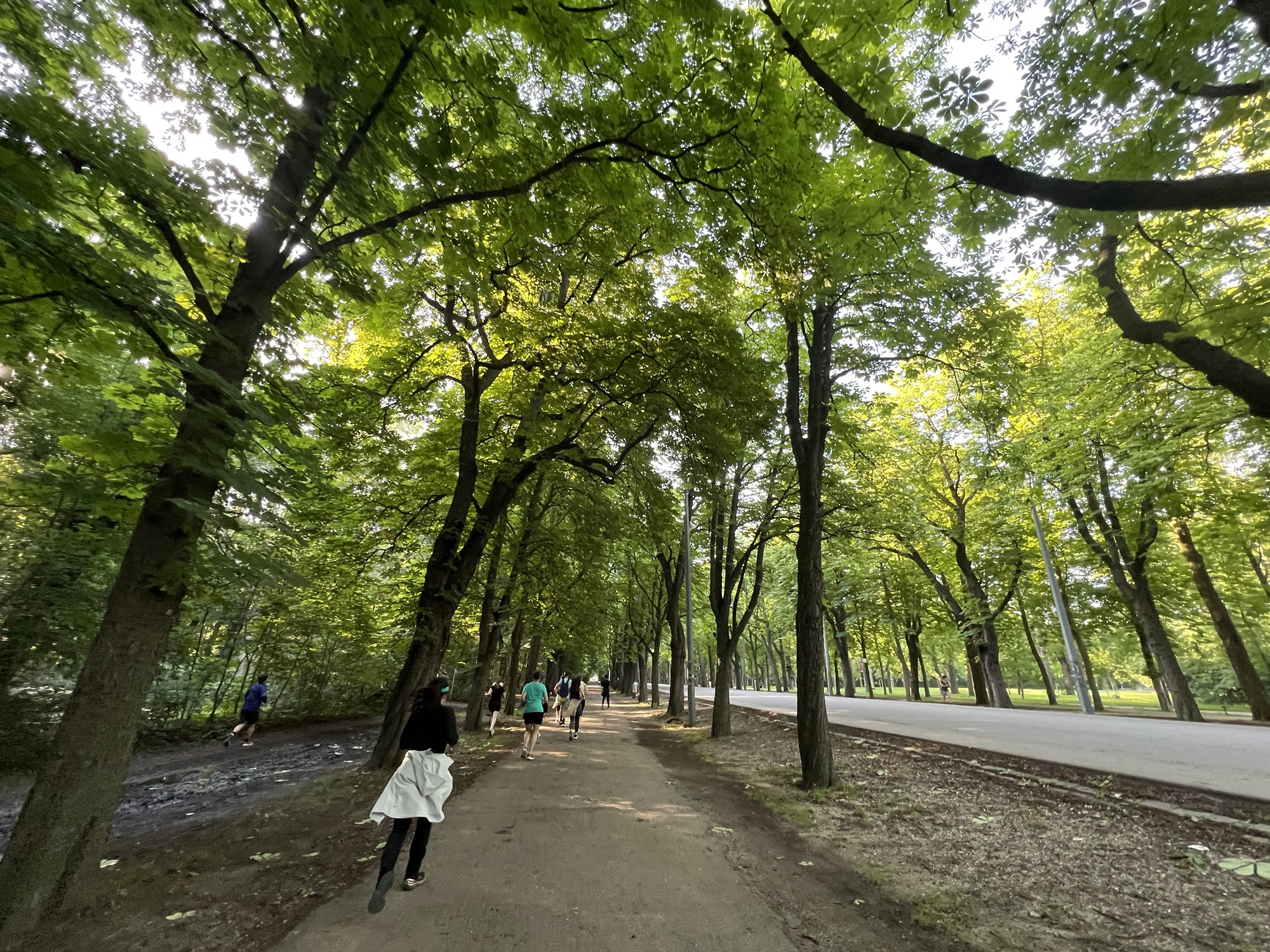 我們沿著普拉特公園內的柏油路跑,同時也有不少人在騎腳踏車和遛狗,幸好今天天氣很好,跑沒多久就不冷了;途中經過幾座網球場,直直跑了三公里左右才轉彎。小繞了一個林間小徑後又回到原本的路上返回,領頭的David還跑來後面關心我們,跟我們尬聊了一下台灣的天氣和我學德文的小心得,最後終於用七分速跑完,太久沒跑簡直累死。大家拿了水合照一下就地解散,我跟茹茹回公寓吃點早餐,茹茹去睡回籠覺,我則是難得的去聽一大早的廠商演講。