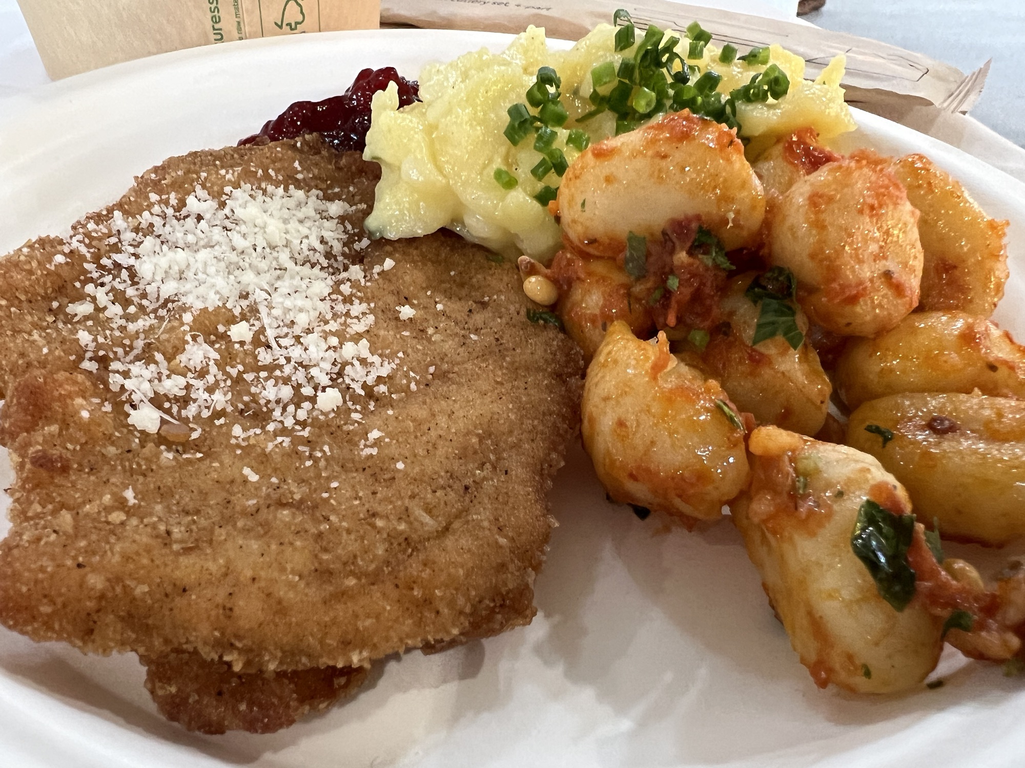 今天中午吃的是奧地利國菜:炸豬排!對我們這種從小吃豬排雞排長大的國度實在沒什麼特別,不過至少是比昨天很有想法的的亞洲料理好吃一百倍。酥嫩的豬排配上酸酸的馬鈴薯泥,再加上一點莓果醬,果然人就是要選自己擅長的戰場,奧地利人就是該做自己擅長的菜餚。吃完一份實在驚豔,還外帶了一份回去公寓給小美和茹茹吃,畢竟這道菜外面餐館可能要賣20歐啊!