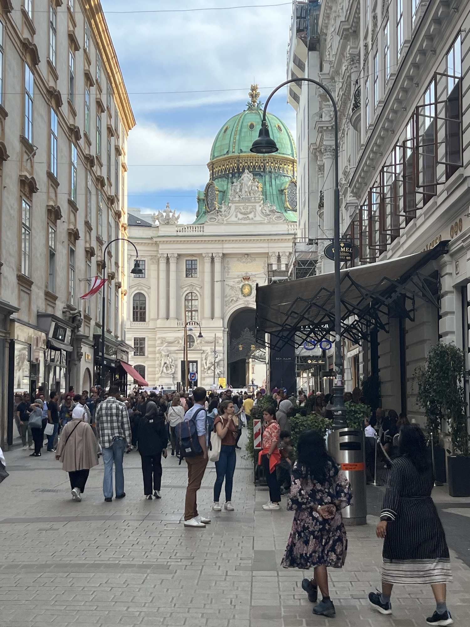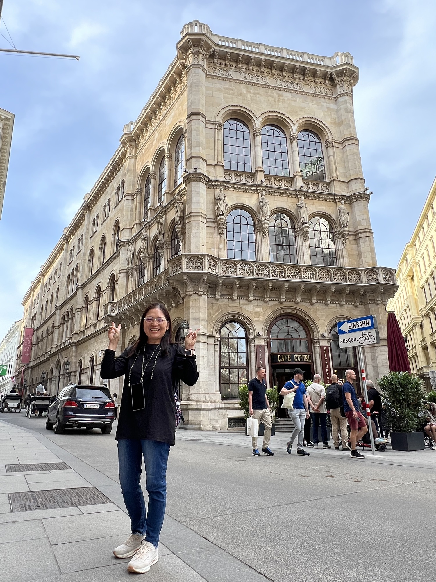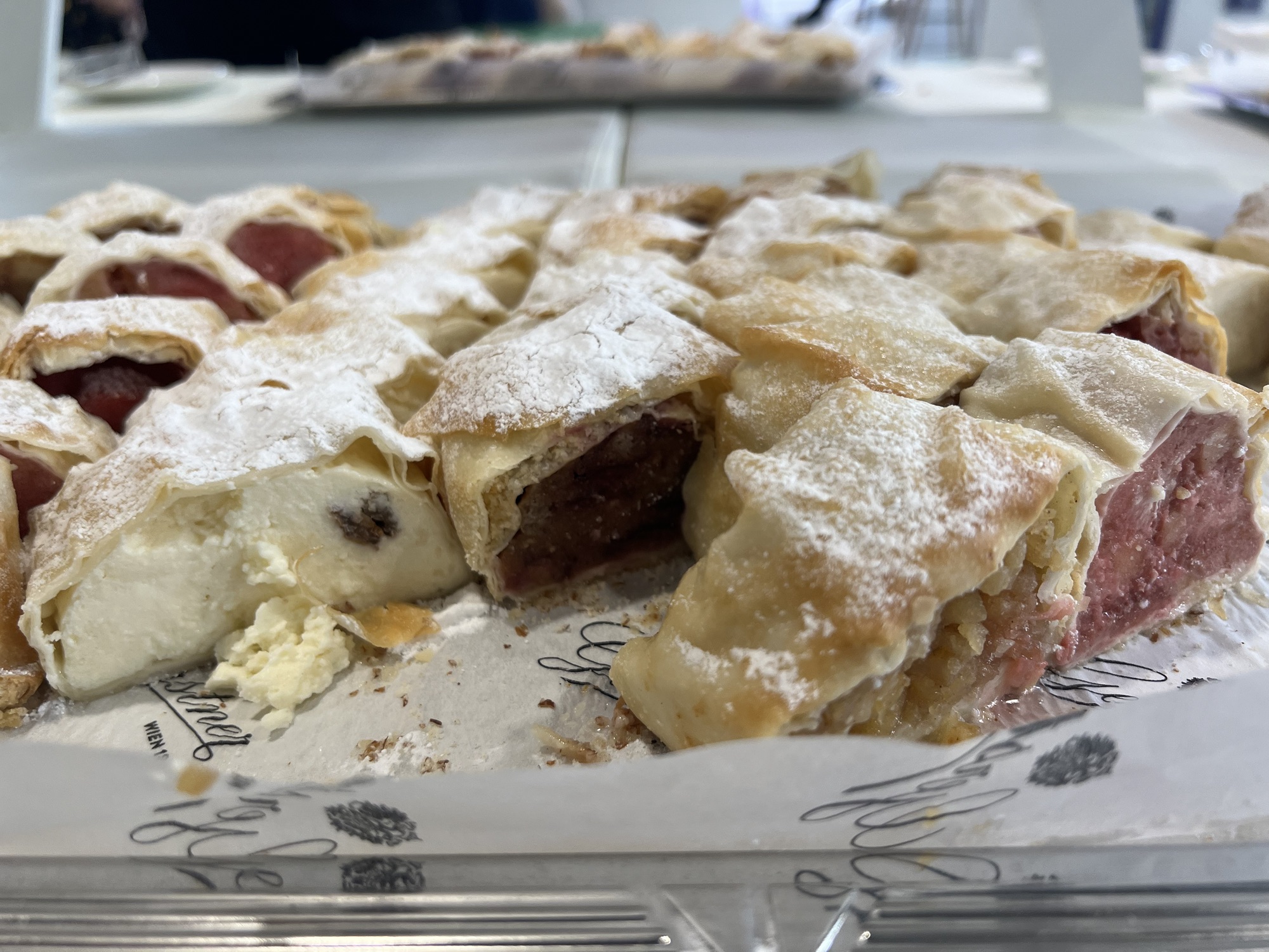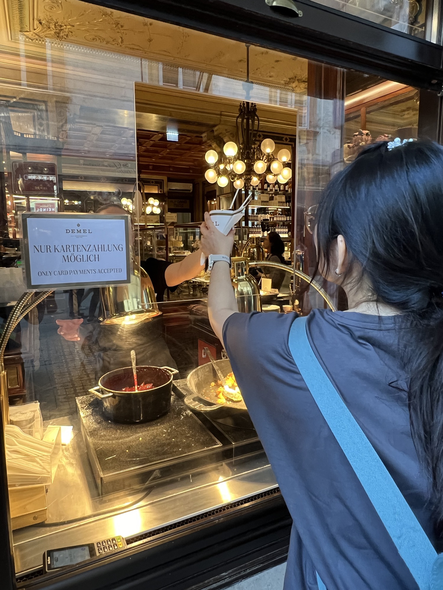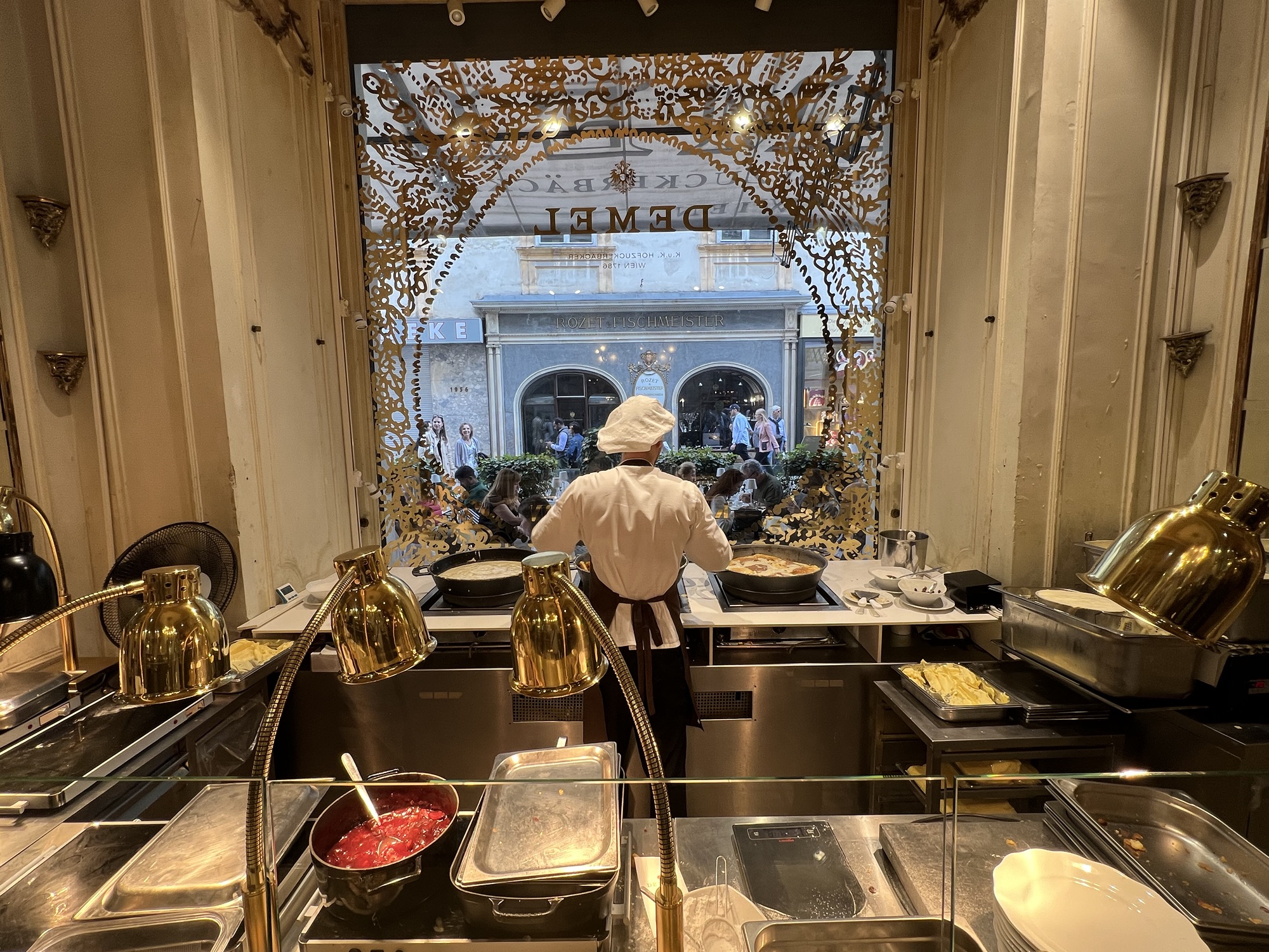 會合後就搭地鐵去中央咖啡館,外面人潮洶湧,大概都是來朝聖的。我們不想人擠人,決定去不遠處的德梅爾咖啡館,結果到了也是一樣要排隊,前面雖然只有三組客人,但這個隊伍是排「一樓戶外」位子的,如果要排二樓位子請直接入內。我們走進去參觀了一下典雅的木質內裝,才剛上樓梯就被塞在樓梯間的大量人類嚇到,果斷放棄,直接外帶了招牌的皇帝煎餅(外帶倒是完全不用排隊),類似半熟炒蛋的口感我很喜歡,但一份8歐是有點貴。