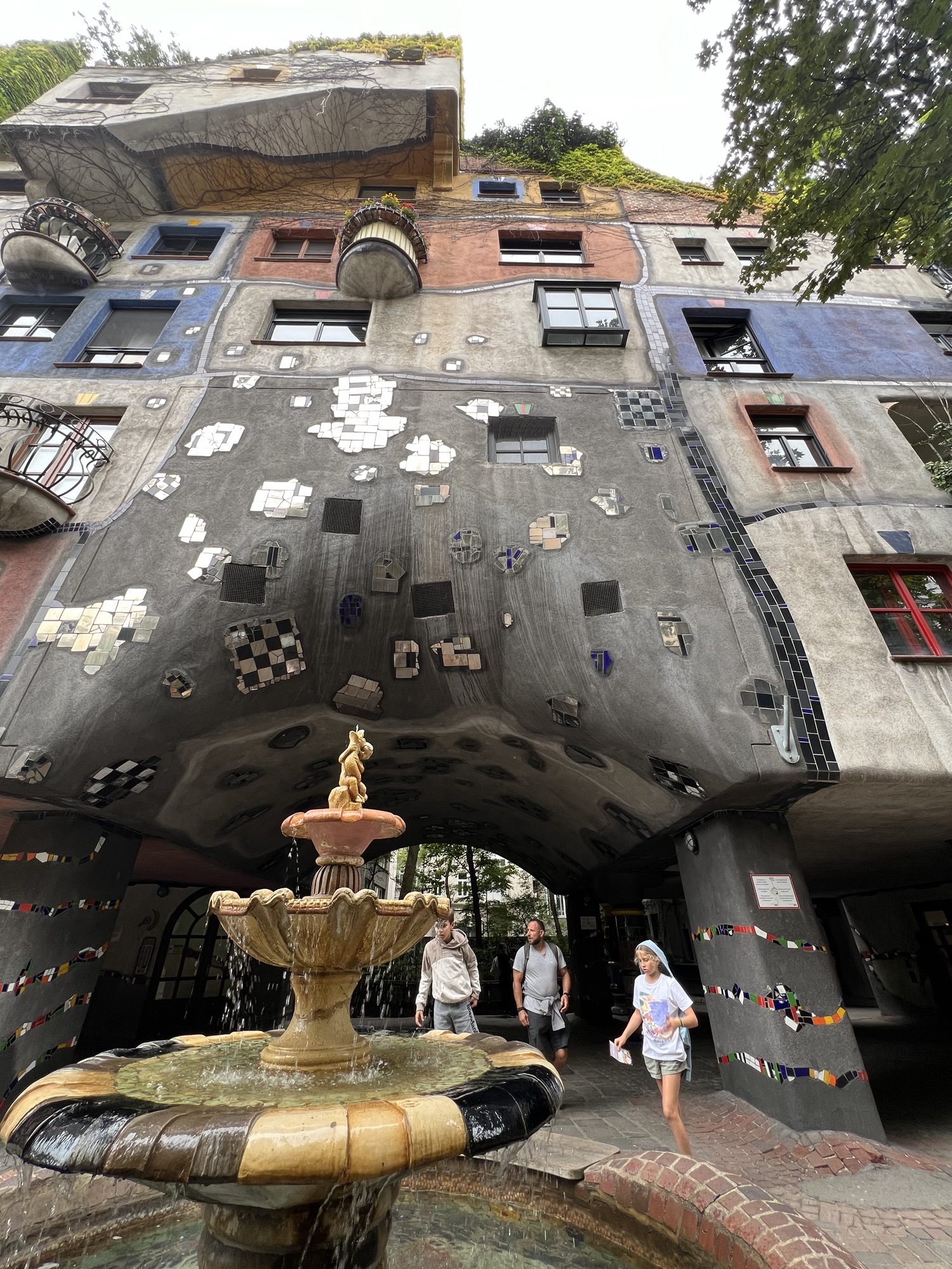 之後聽了乾燥症的大師班,結果比上午的還糟,內容沒什麼特別之處,法國人的腔調還重到很難聽懂,悲劇一場。四點半離開會場,慢慢搭車去找在百水藝術村玩耍的茹茹和小美,抵達時看到兩位坐在噴泉旁滑手機的女子,茹茹還買到一個很美麗的特價骨瓷杯子。