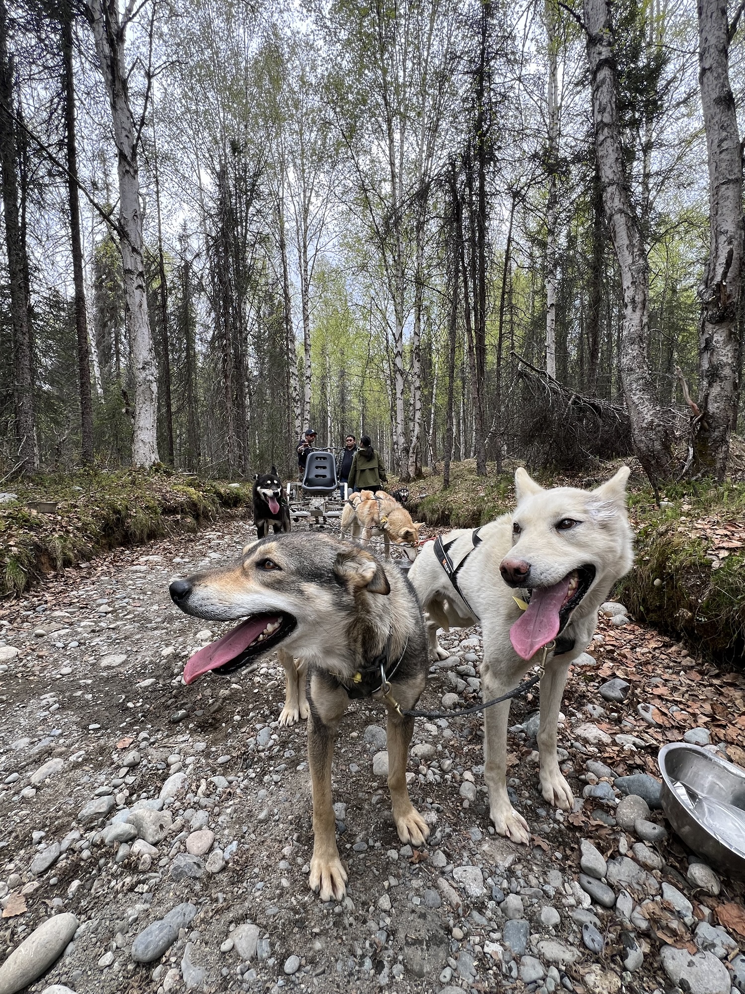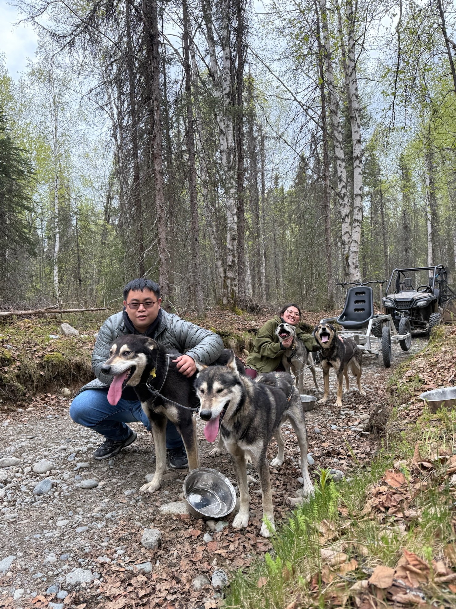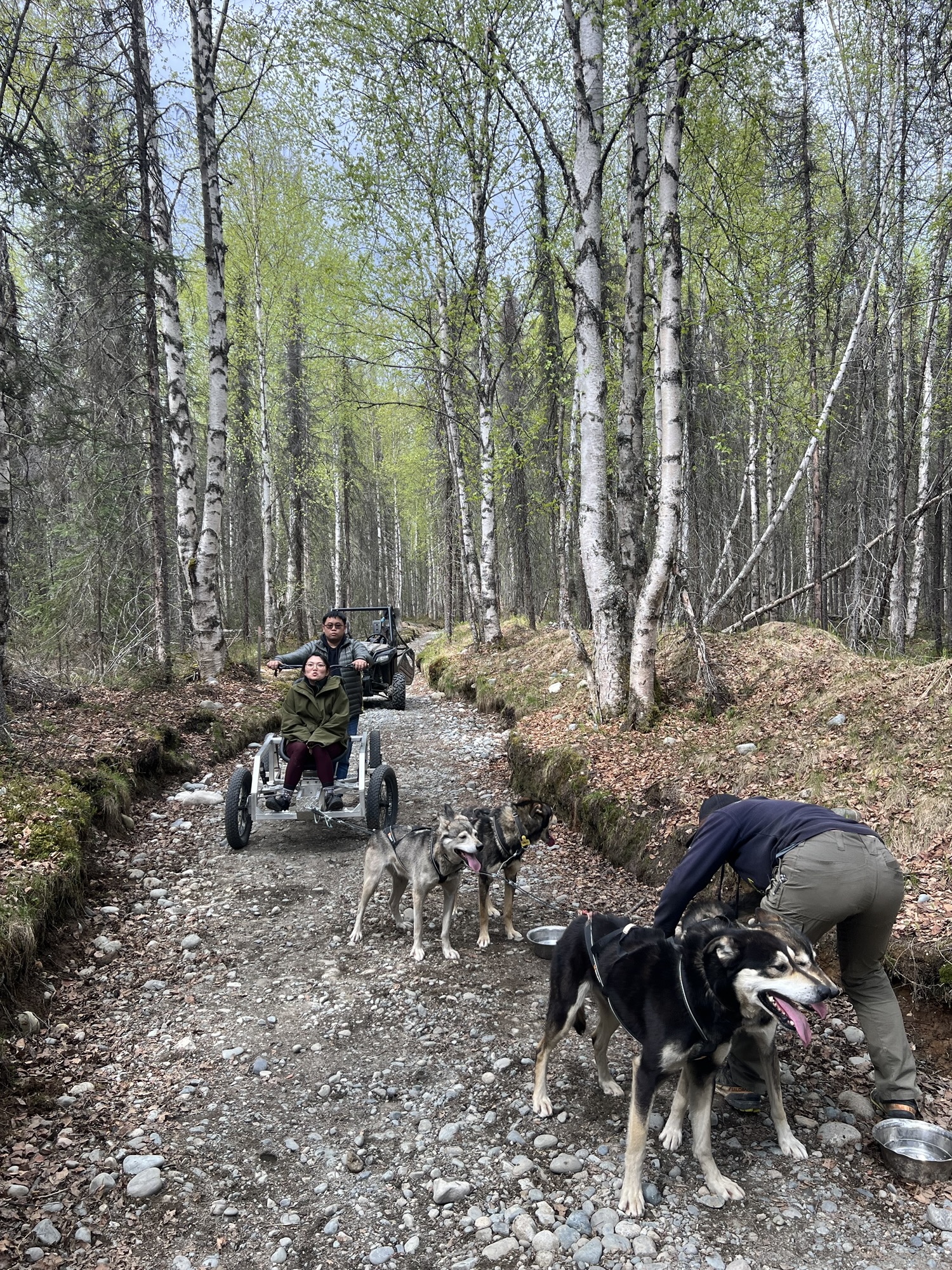 一出發馬上就差點出事,因為龍頭轉向其實是要用點力的,而且站著非常顛簸,得要重心下壓保持穩定,其實有點累人,而且路真的就是剛好容納一台車的寬度,稍微轉向不夠就差點嚕到邊坡!還好經過三四個轉彎後逐漸上手,沒有害乘客被甩出去。跑大概五分鐘會暫停讓狗狗休息喝水,因為這裡的狗其實都習慣零下的氣溫,今天接近攝氏20度的氣溫實在太熱了!我那車的狗都喘得跟鬼一樣!摸摸他們說聲辛苦了他們也懶得理我!太累!!