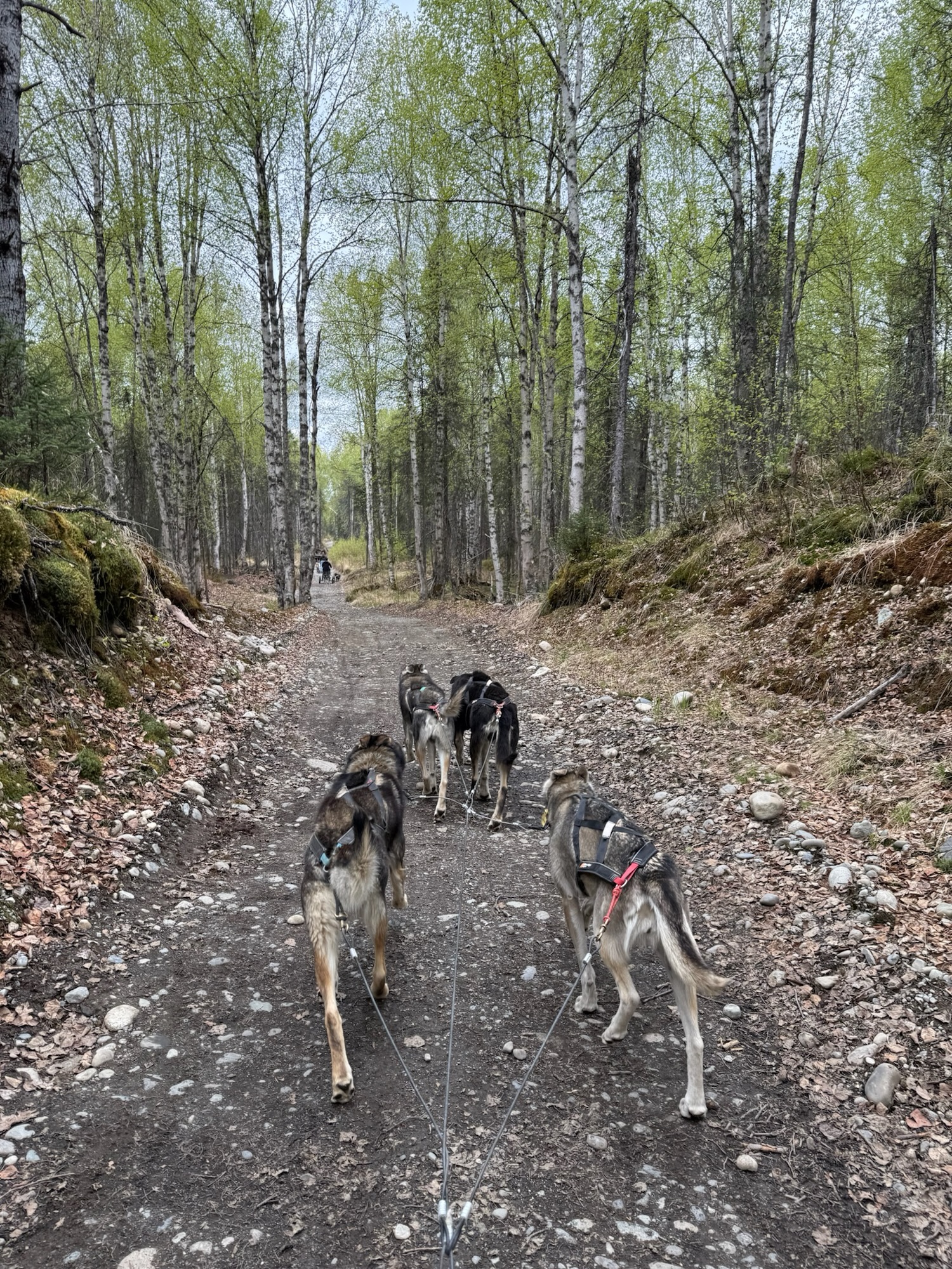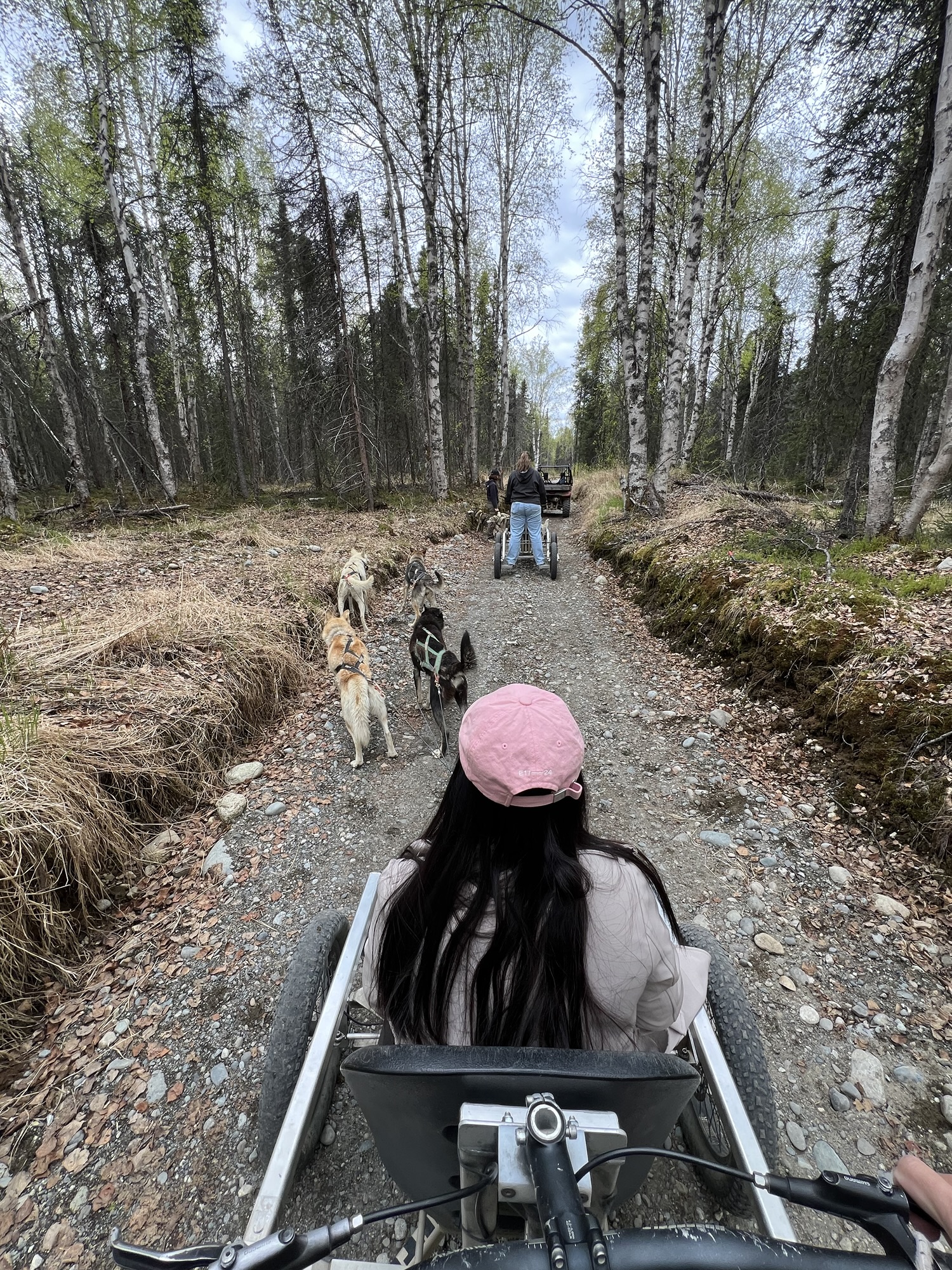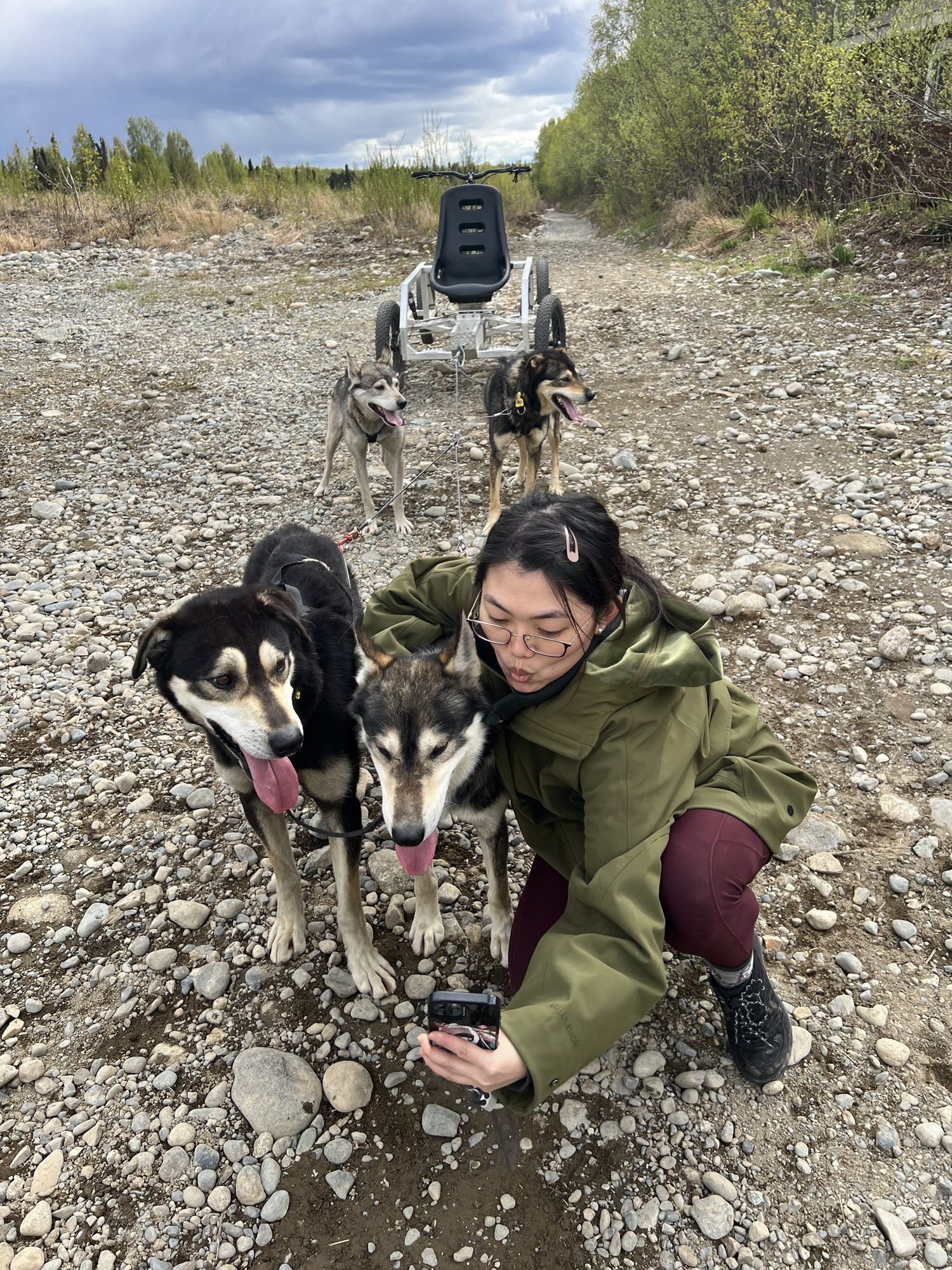 一出發馬上就差點出事,因為龍頭轉向其實是要用點力的,而且站著非常顛簸,得要重心下壓保持穩定,其實有點累人,而且路真的就是剛好容納一台車的寬度,稍微轉向不夠就差點嚕到邊坡!還好經過三四個轉彎後逐漸上手,沒有害乘客被甩出去。跑大概五分鐘會暫停讓狗狗休息喝水,因為這裡的狗其實都習慣零下的氣溫,今天接近攝氏20度的氣溫實在太熱了!我那車的狗都喘得跟鬼一樣!摸摸他們說聲辛苦了他們也懶得理我!太累!!