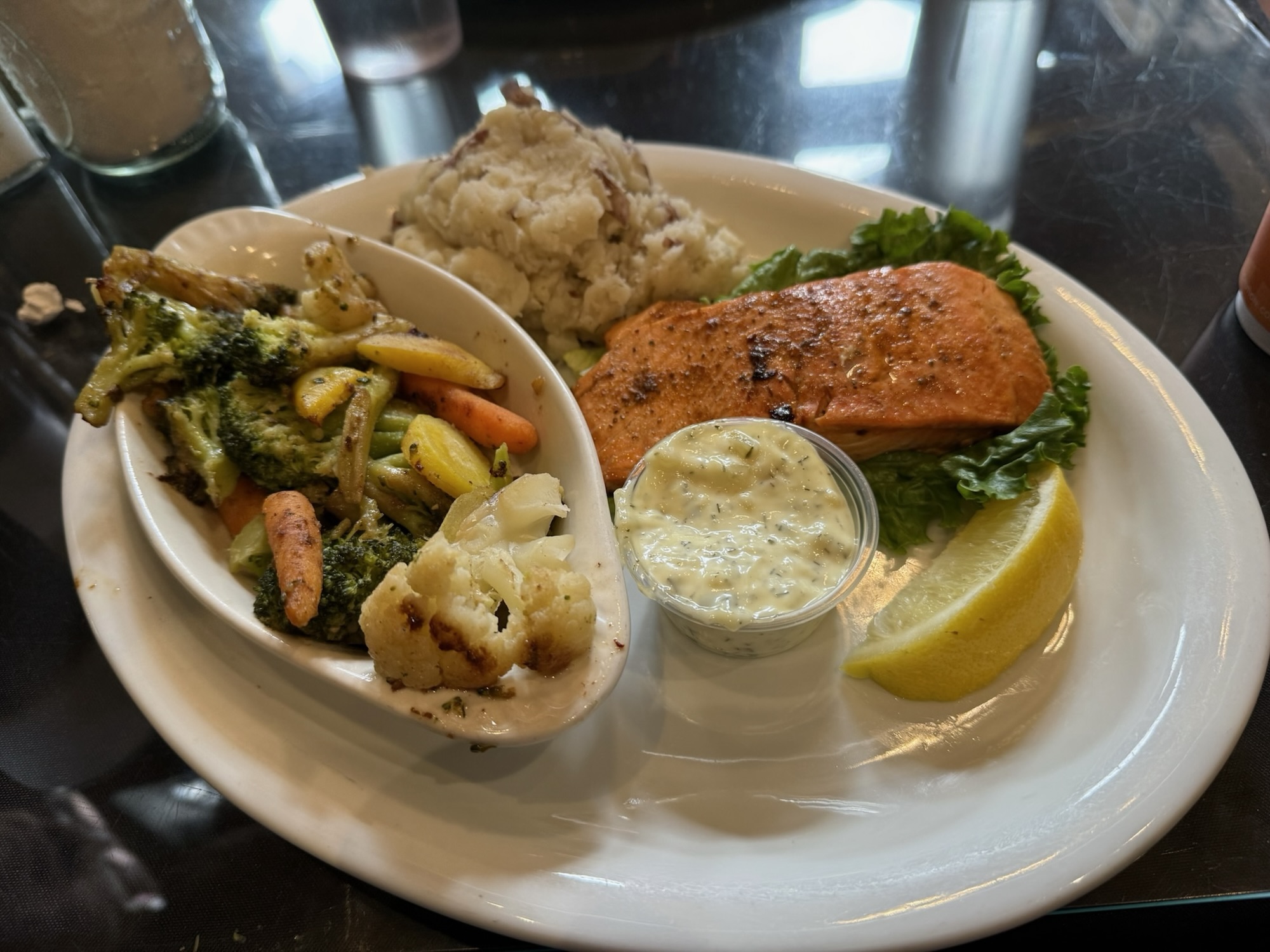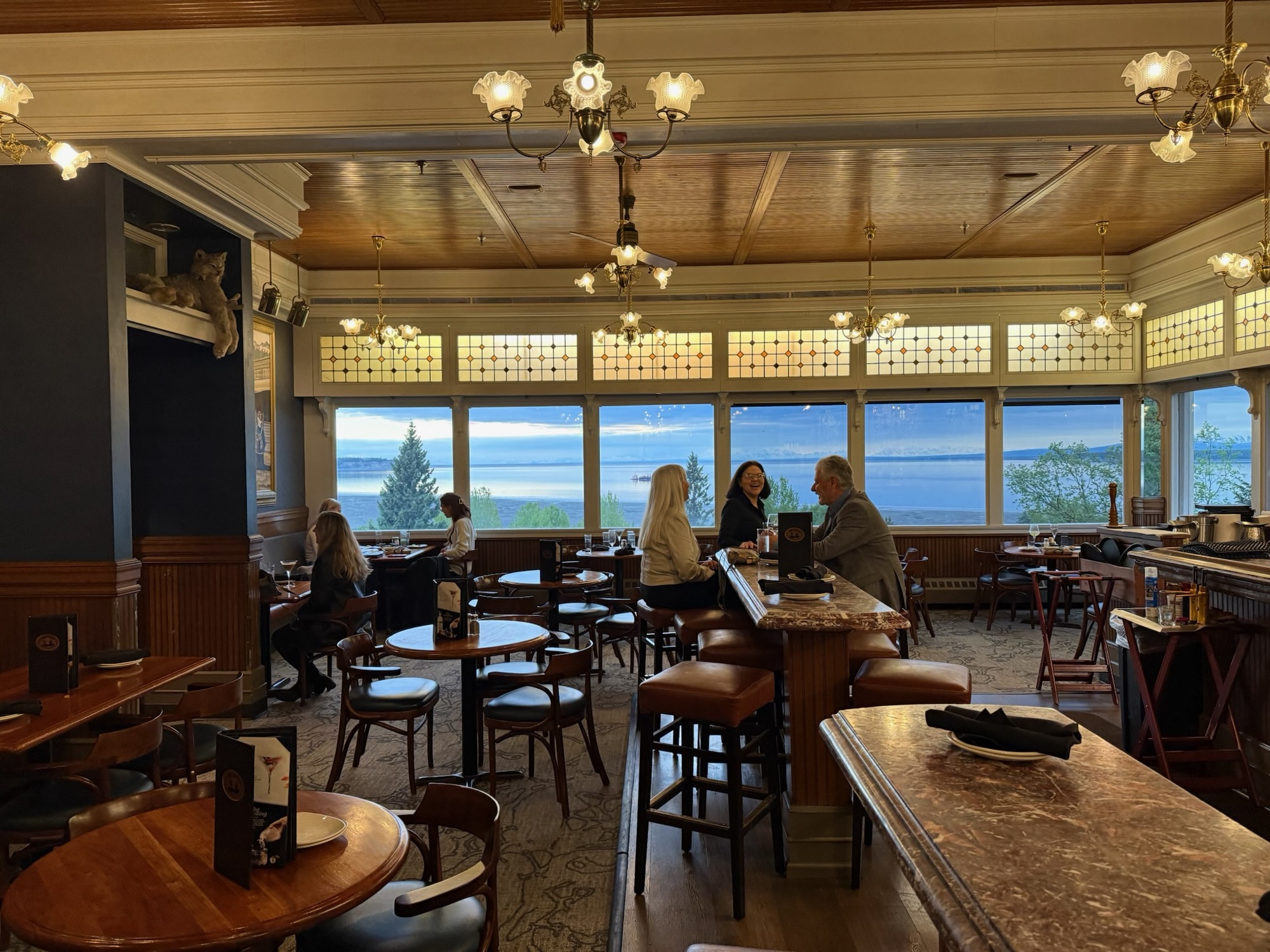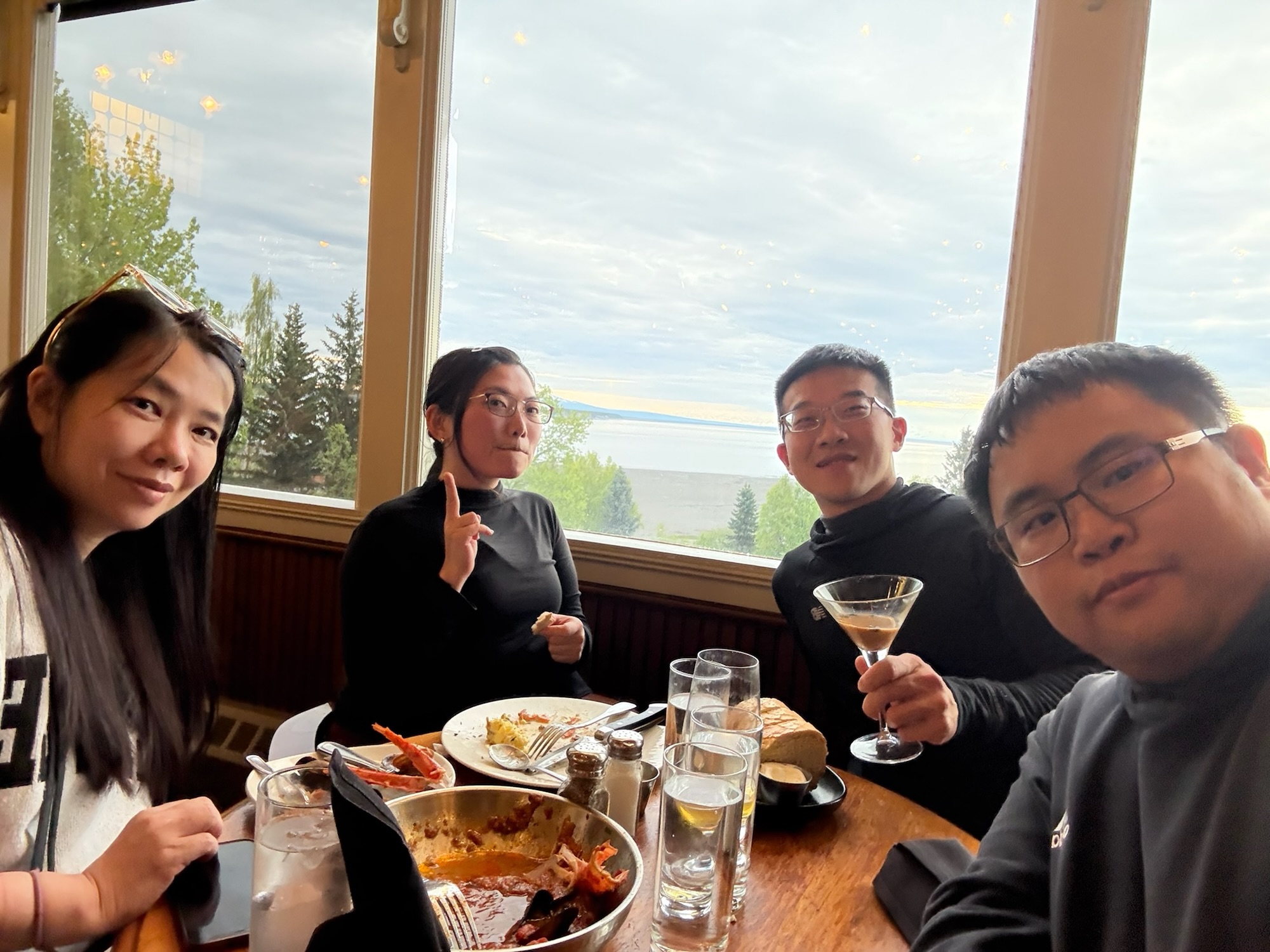 晚餐原本想去啤酒廠餐廳吃,結果大爆滿,一時不知道吃什麼,索性就撩落去吃了安克拉治有名的海鮮餐廳Simon & Seafort’s,窗外就是無敵海景,肯定不會太便宜。我先讓大家進去再繞了一圈找到免錢的路邊停車位,省下來的錢大概可以喝一杯啤酒。