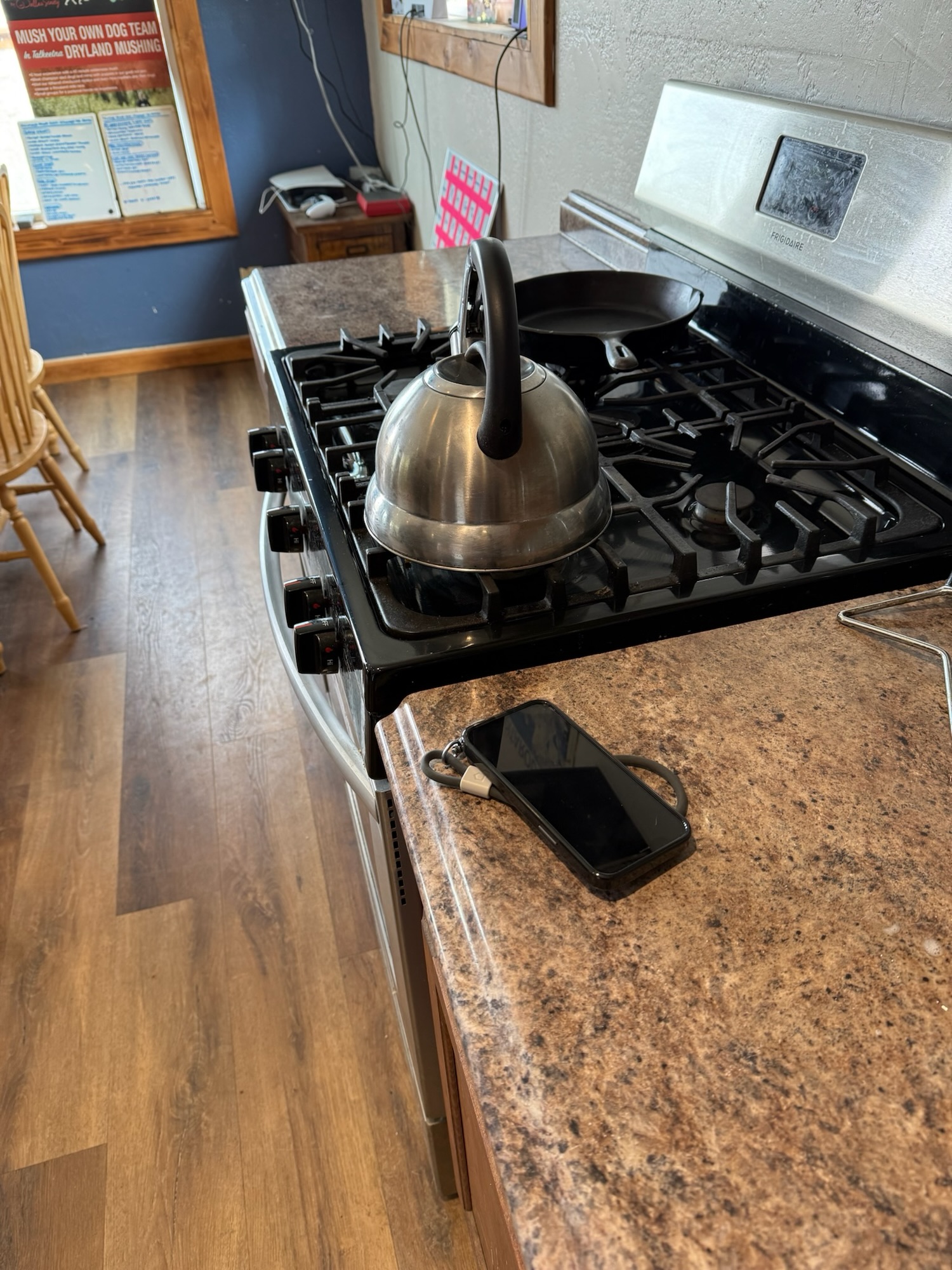 最後大概玩了四十分鐘回到狗園,狗園的其他狗也是嗷嗷嗷地歡迎我們回來,再摸摸我們辛苦的狗狗們,狗拉雪橇就到此結束了。在旁邊的小屋上廁所時,茹茹的手機居然放在前廳的流理台上,像是在自己家一樣,我想這就是對人心的信任吧!