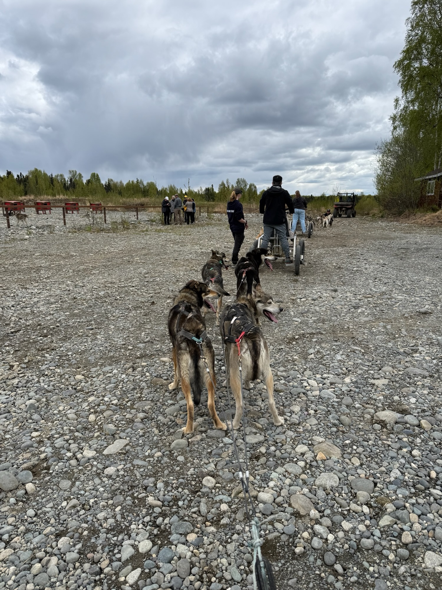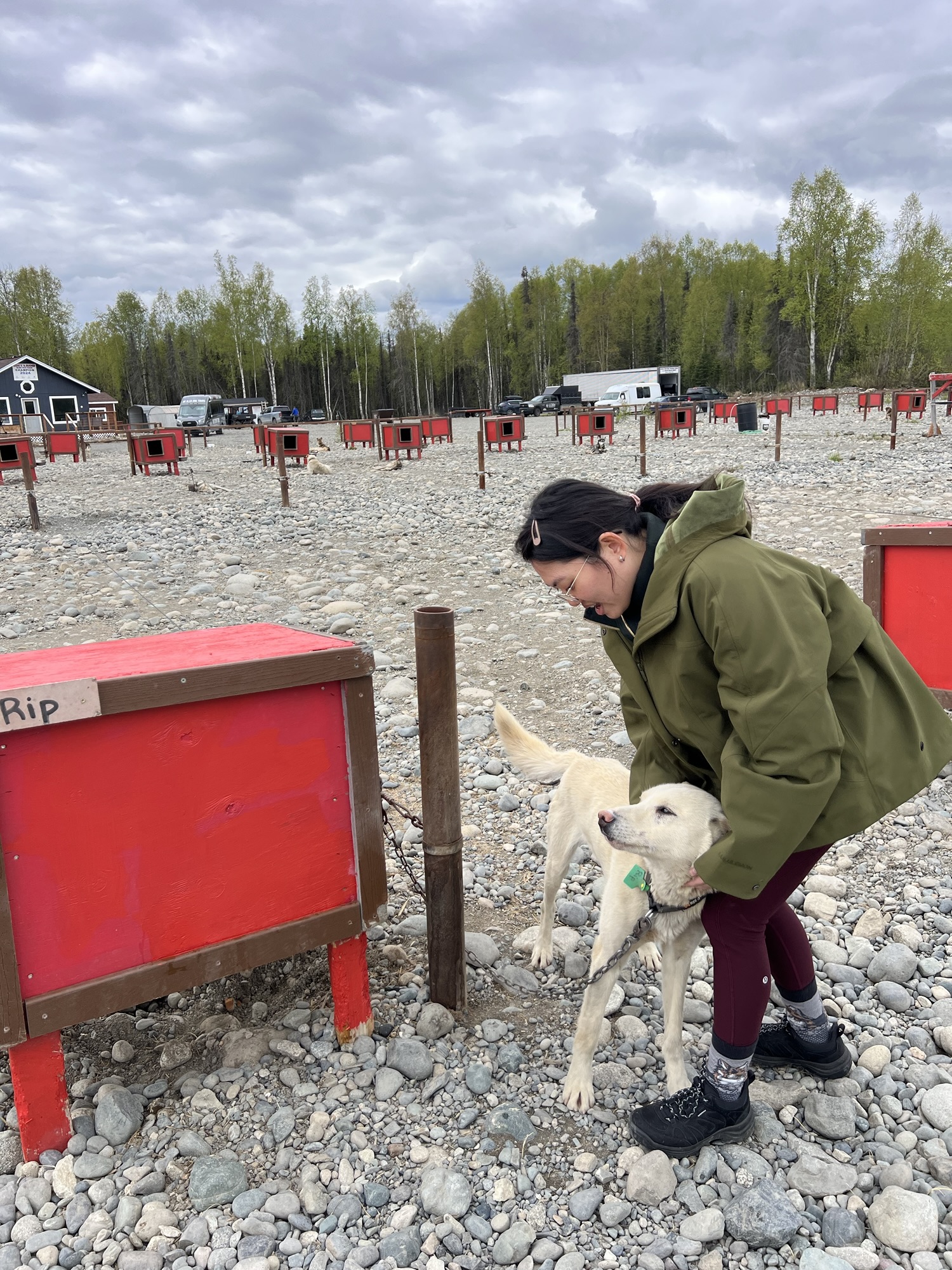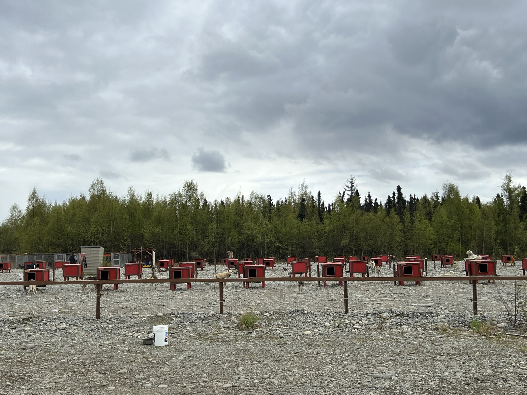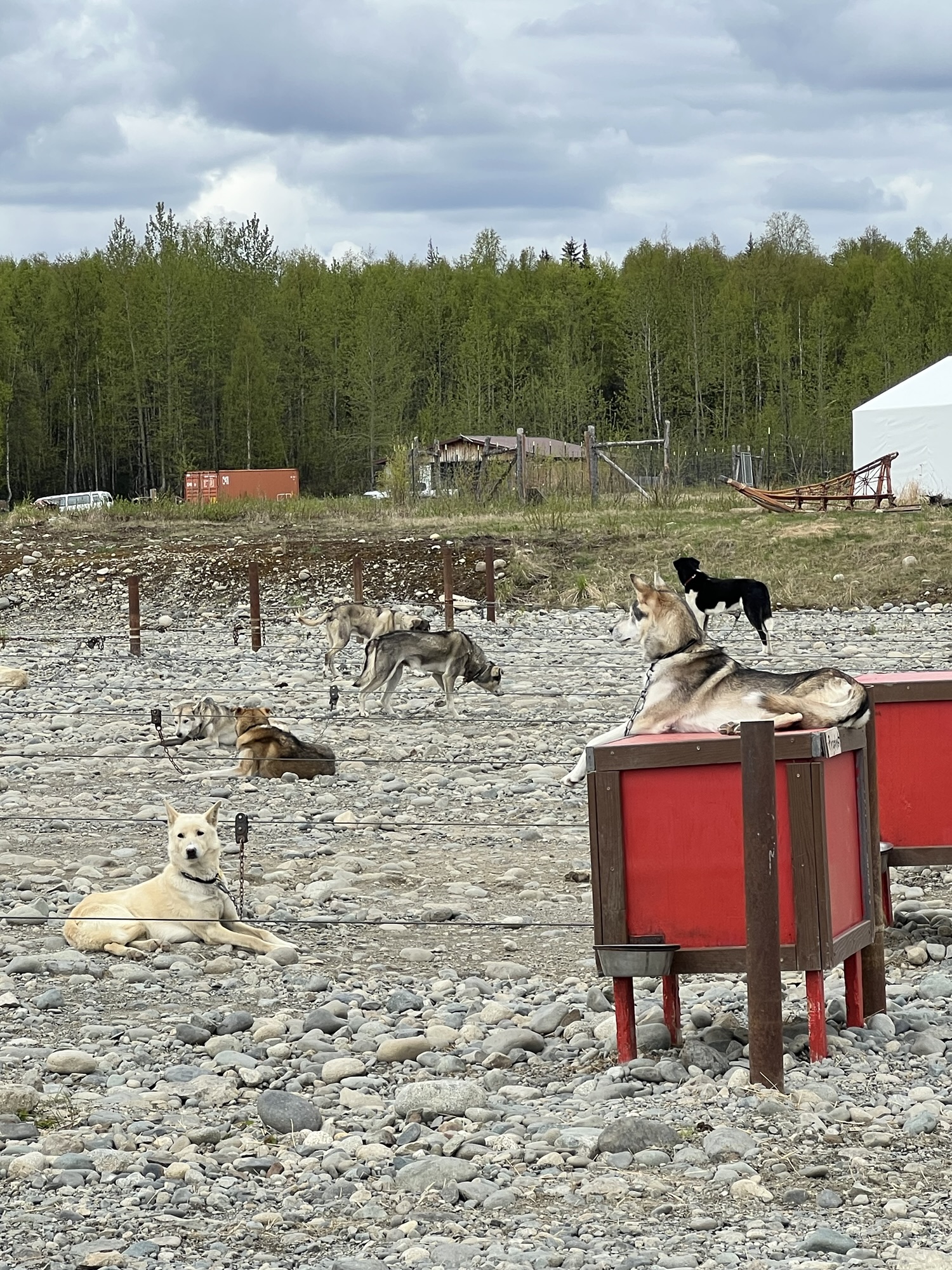 趕緊吃完飯結了帳,幸運的是狗園其實比Talkeetna還近一些,開了二十多分鐘,轉進幾條顛簸的沙石路後,正好和送其他人來的小巴士擦身而過。狗園就是一排排像是Snoopy睡覺的紅屋頂木屋,每隻狗都有一座專屬狗屋,狗屋拉出一條條平行的纜繩,讓每隻狗都能不打結的在自己的那條範圍內跑來跑去。我們抵達時他們正好挑出今天要負責拉我們走的12隻狗,每車兩人配四隻狗,其他的狗就一直起鬨大叫衝來衝去,場面有點混亂好笑。