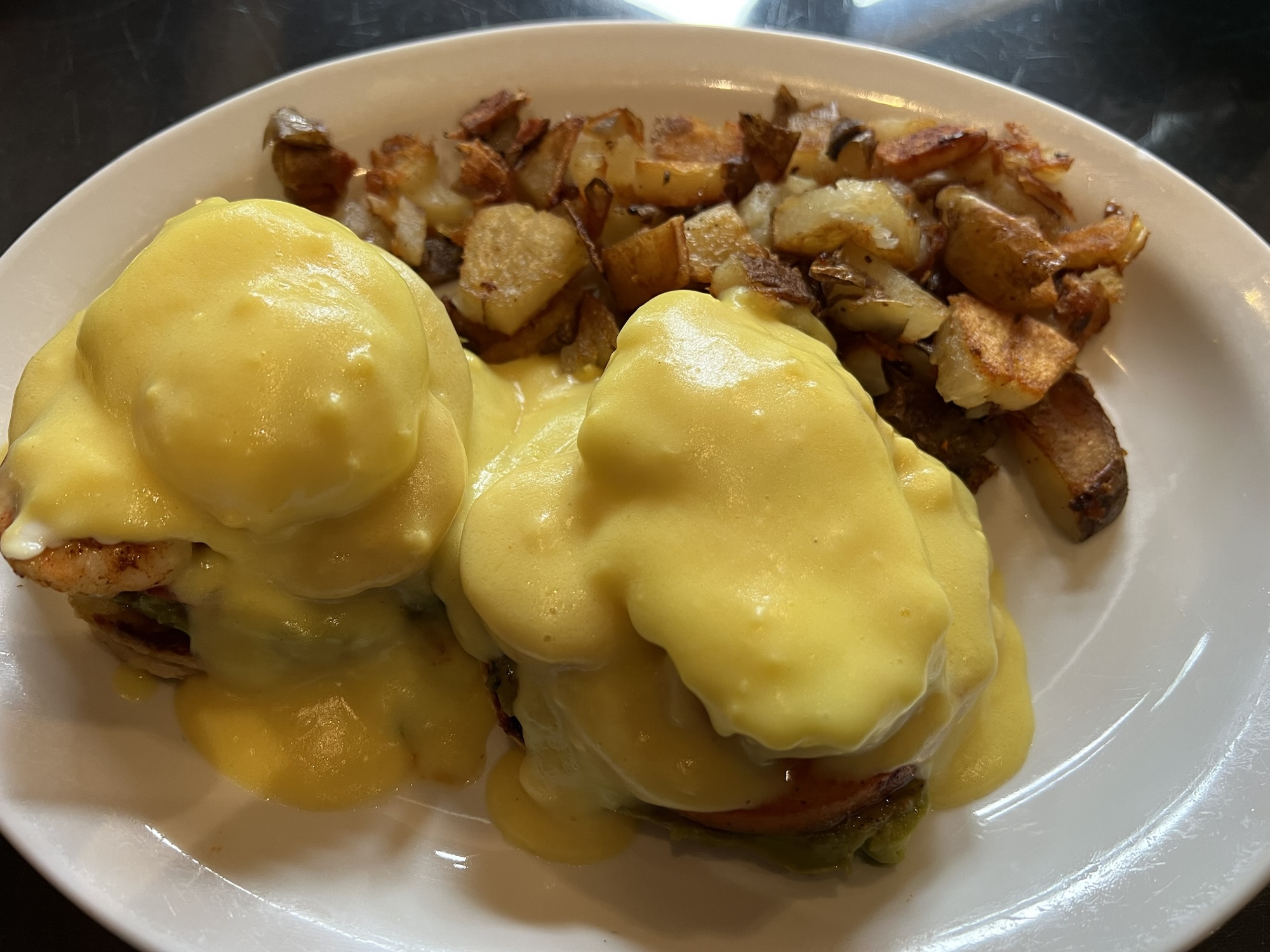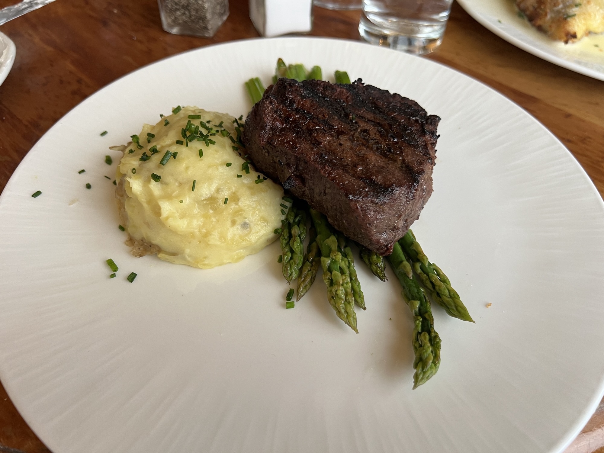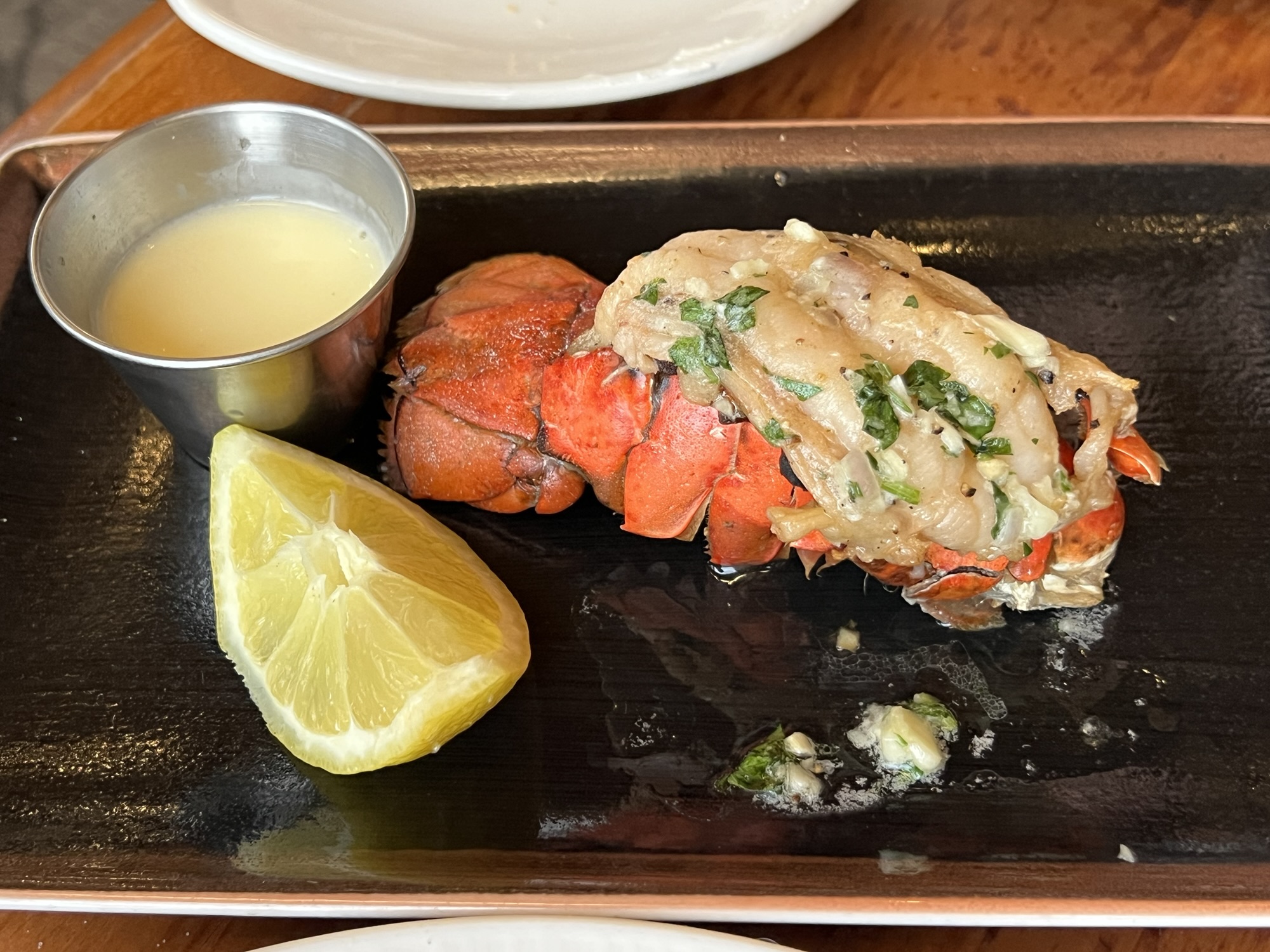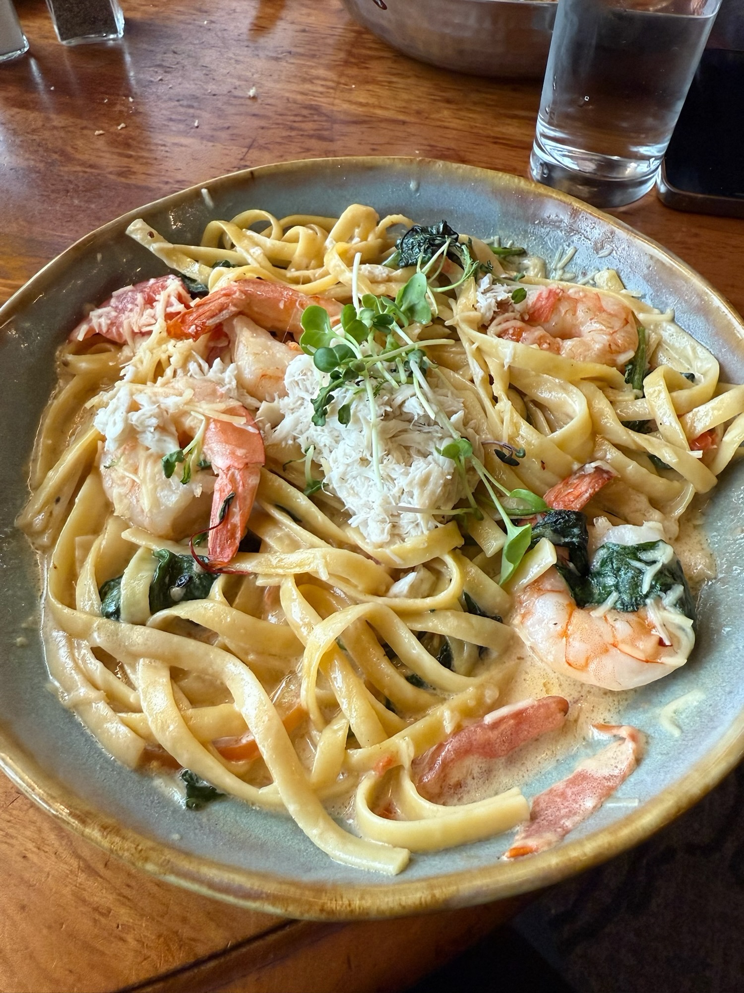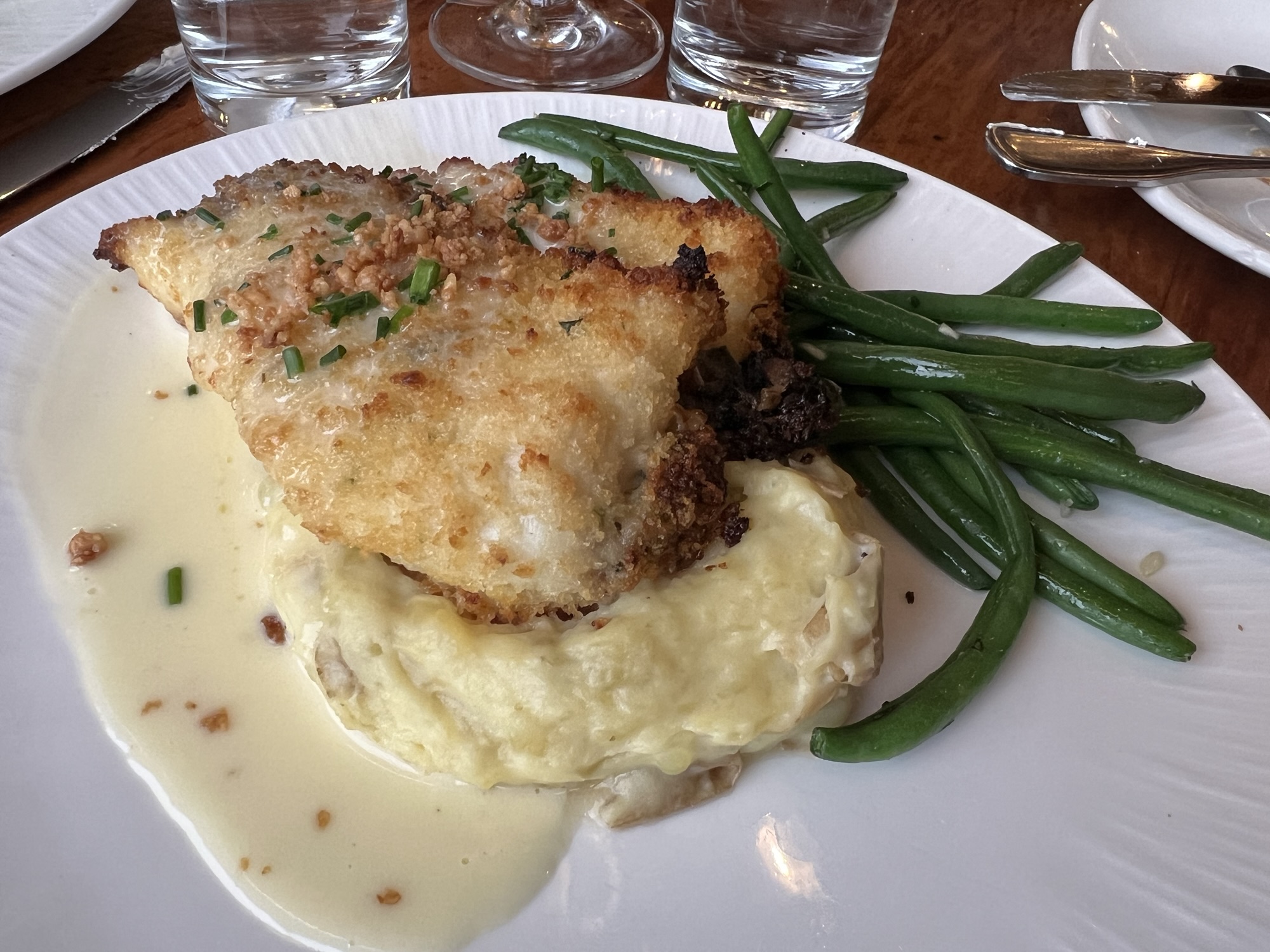 進去後發現我們被安排在離窗戶很遠的位子,還好運氣不錯,點完餐就有窗邊位可坐,不然這間餐廳的價值就要折半了。我點了炸比目魚裡面塞螃蟹,茹茹點了和牛排和龍蝦尾,Ian點了海鮮寬義大利麵和洋蔥湯,結果洋蔥湯上面有層厚厚的起司,喝完他就半飽了,大部分的義大利麵都給我們吃了,但裡面我覺得最好吃的就是義大利麵,其他的餐點都有點普通。老師點了一份綜合海鮮湯,上面大大的兩根帝王蟹腳,看得Ian說道自己在加州每個禮拜去買螃蟹回來吃,表現出螃蟹達人的強大氣場,處理蟹腳果然是又快又精準,不負螃蟹達人的名聲。