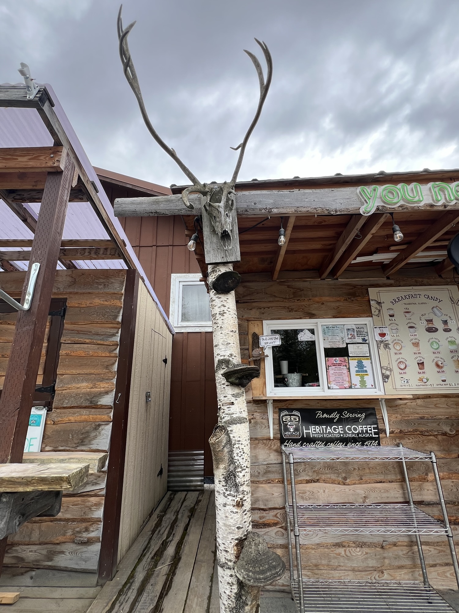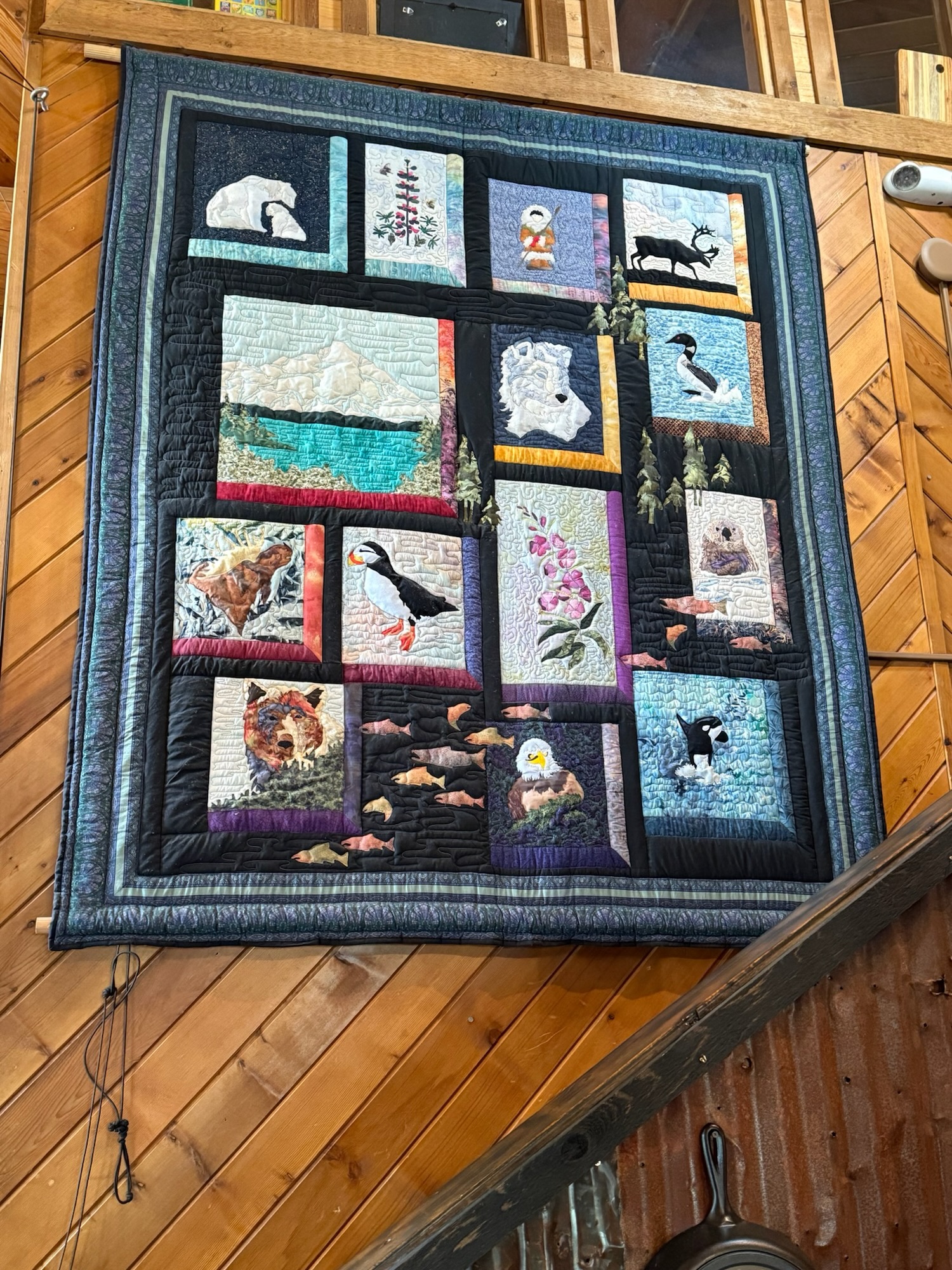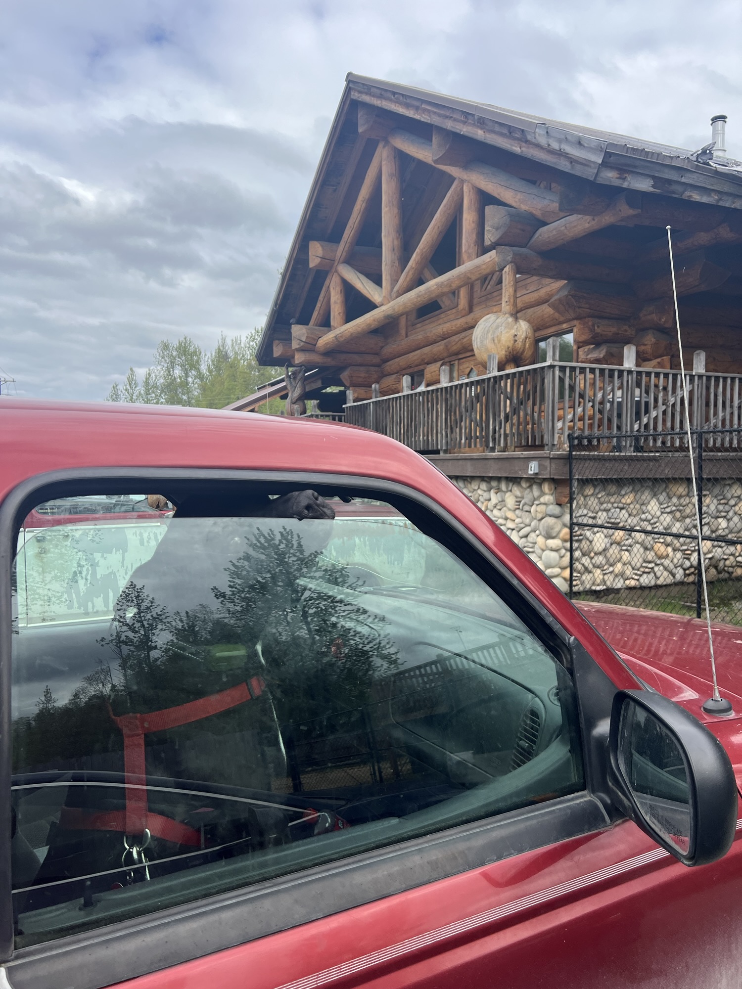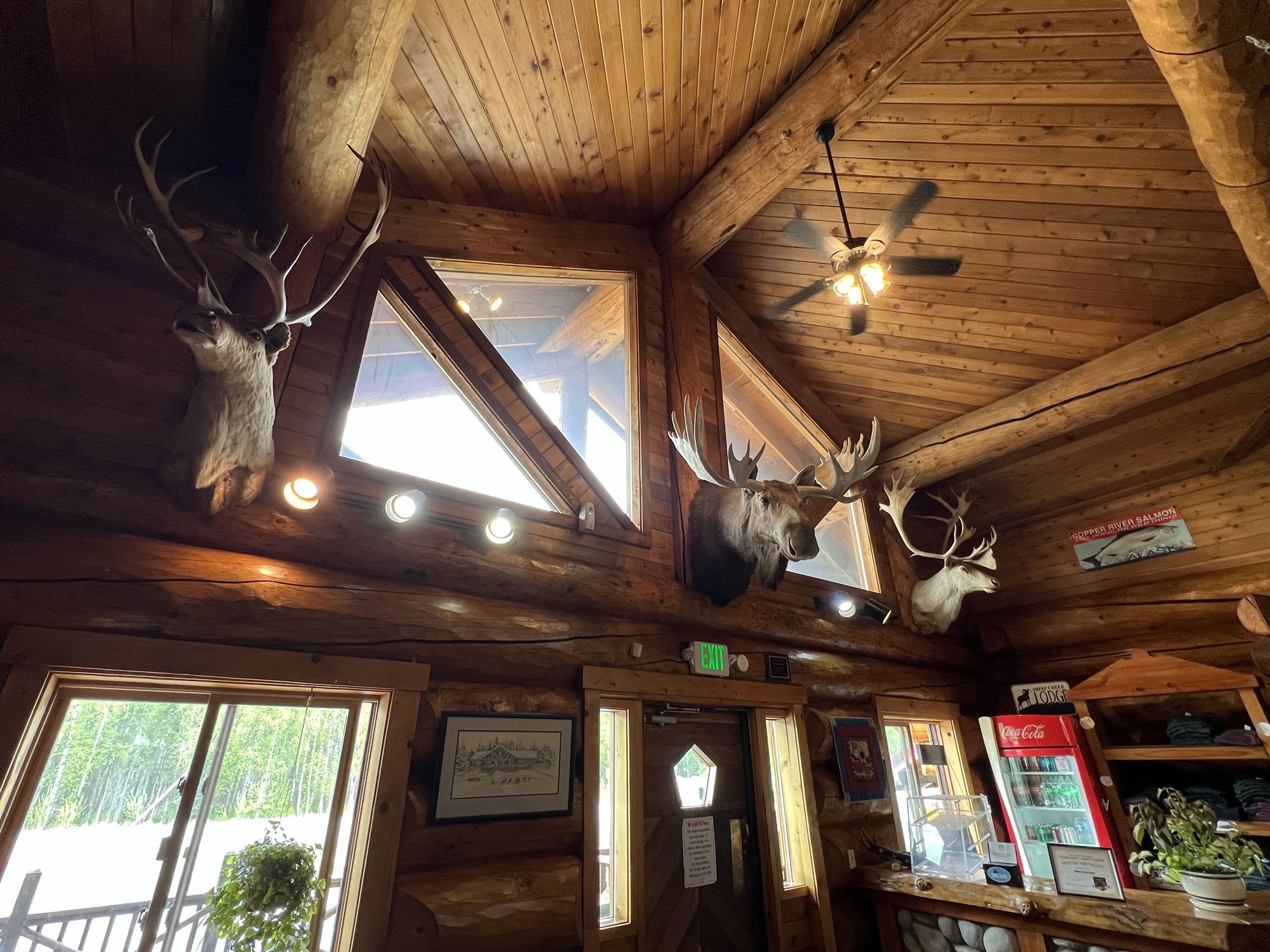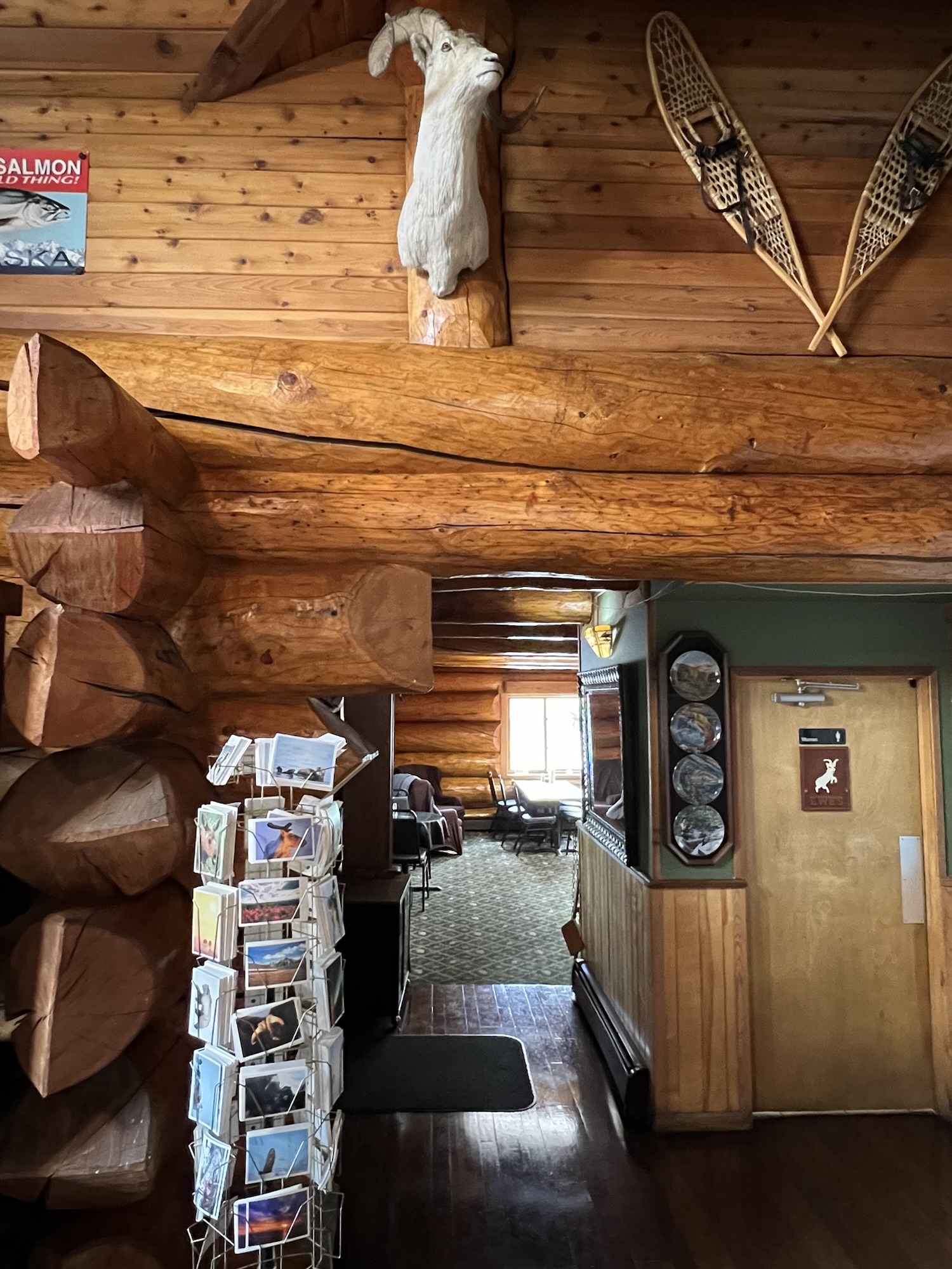 回車上繼續向北前進,下一站就在距離目的地半小時遠的餐廳吃午餐;隔壁的車子裡有隻被留下來看車的黑狗,把鼻子塞在窗縫裡跟我打招呼。餐廳名叫Sheep Creek Lodge,也是用圓木一根根嵌合起來的木屋,店裡正在播放小聯盟的棒球賽,牆上掛著好幾顆水牛和鹿頭標本,還有一大幅阿拉斯加招牌生物們的拼布畫。我吃放了蝦子的班尼迪克蛋,茹茹吃了鮭魚,食物很有水準,不太餓的我們還是全吃光了。