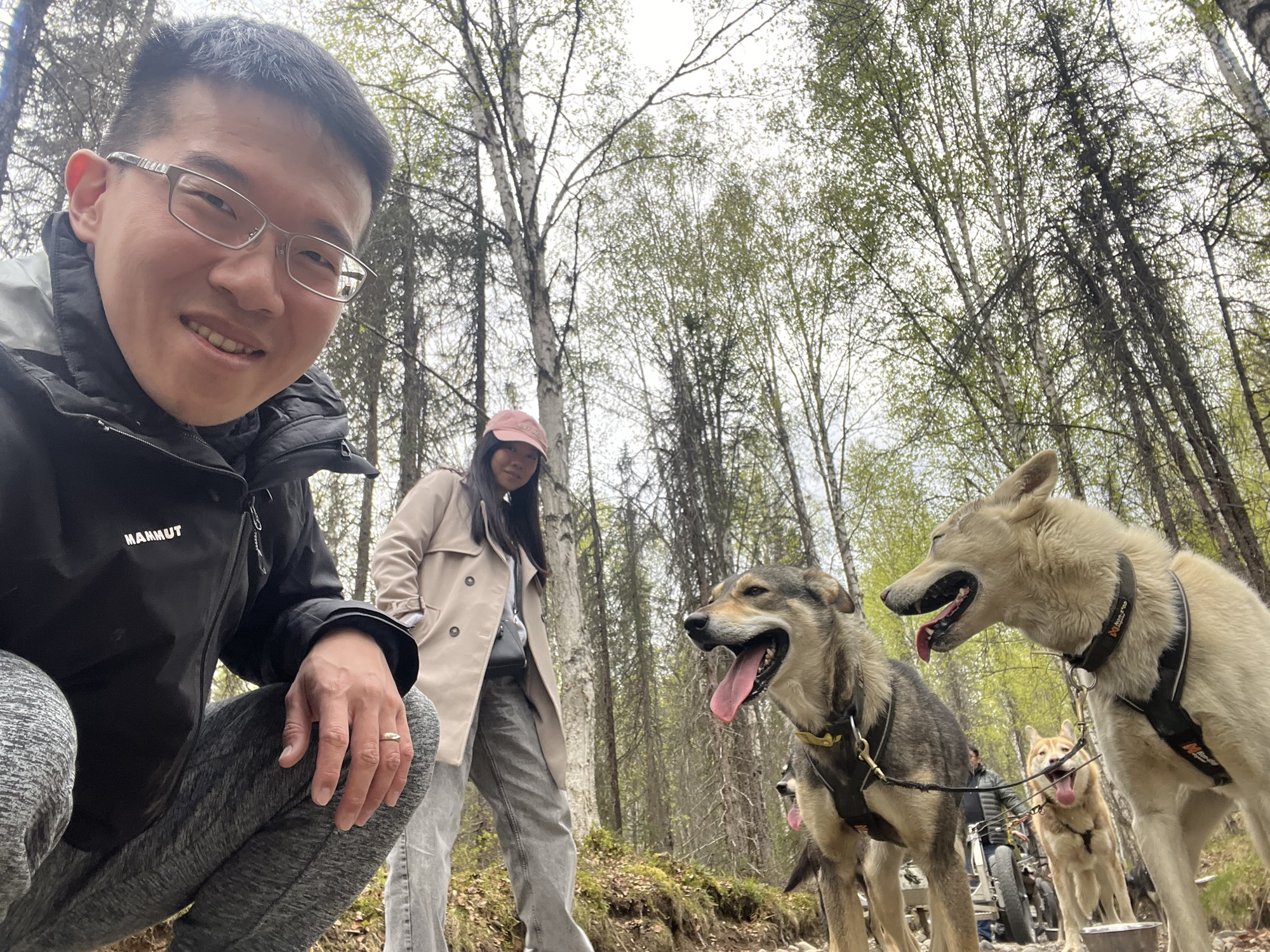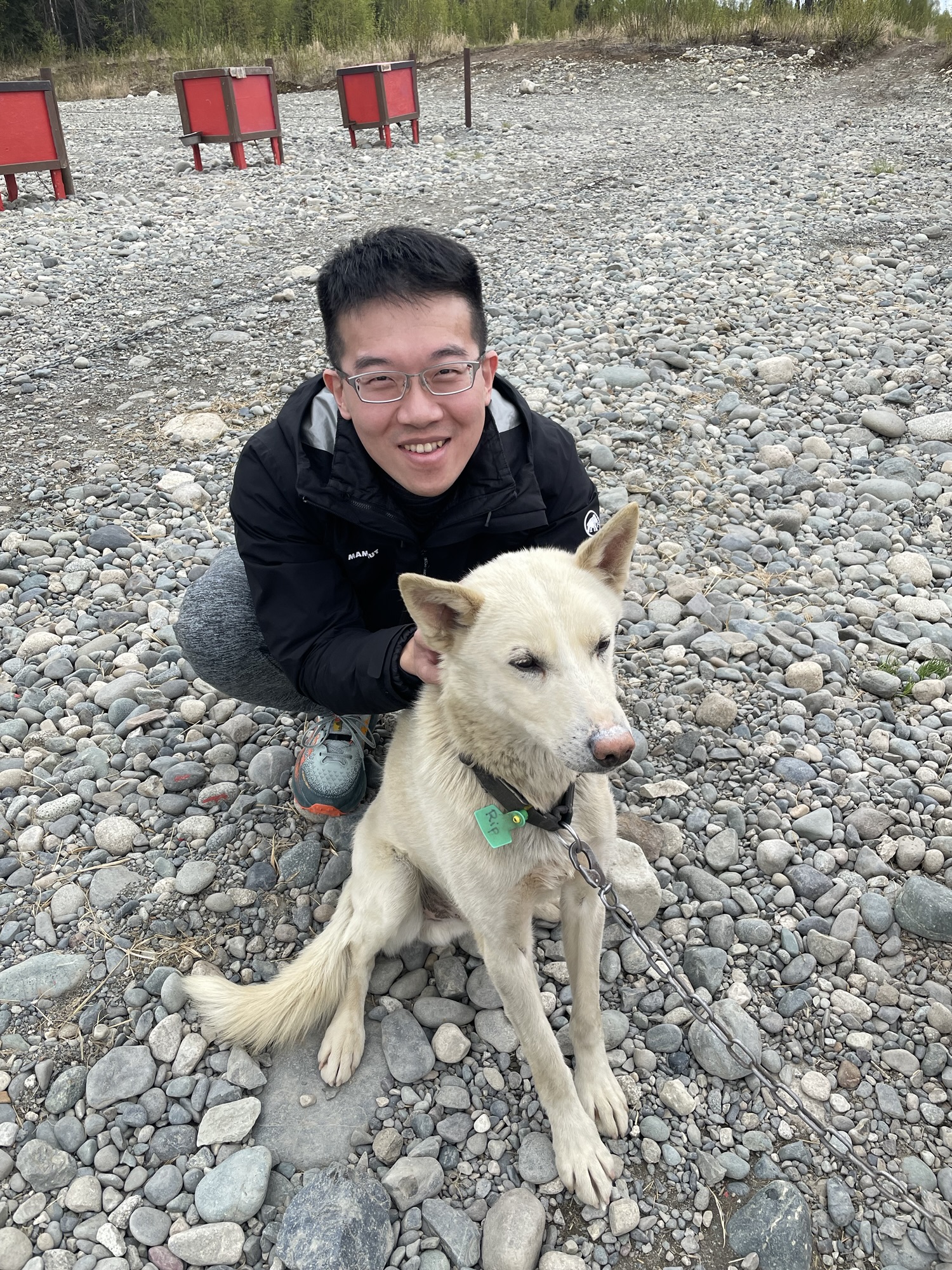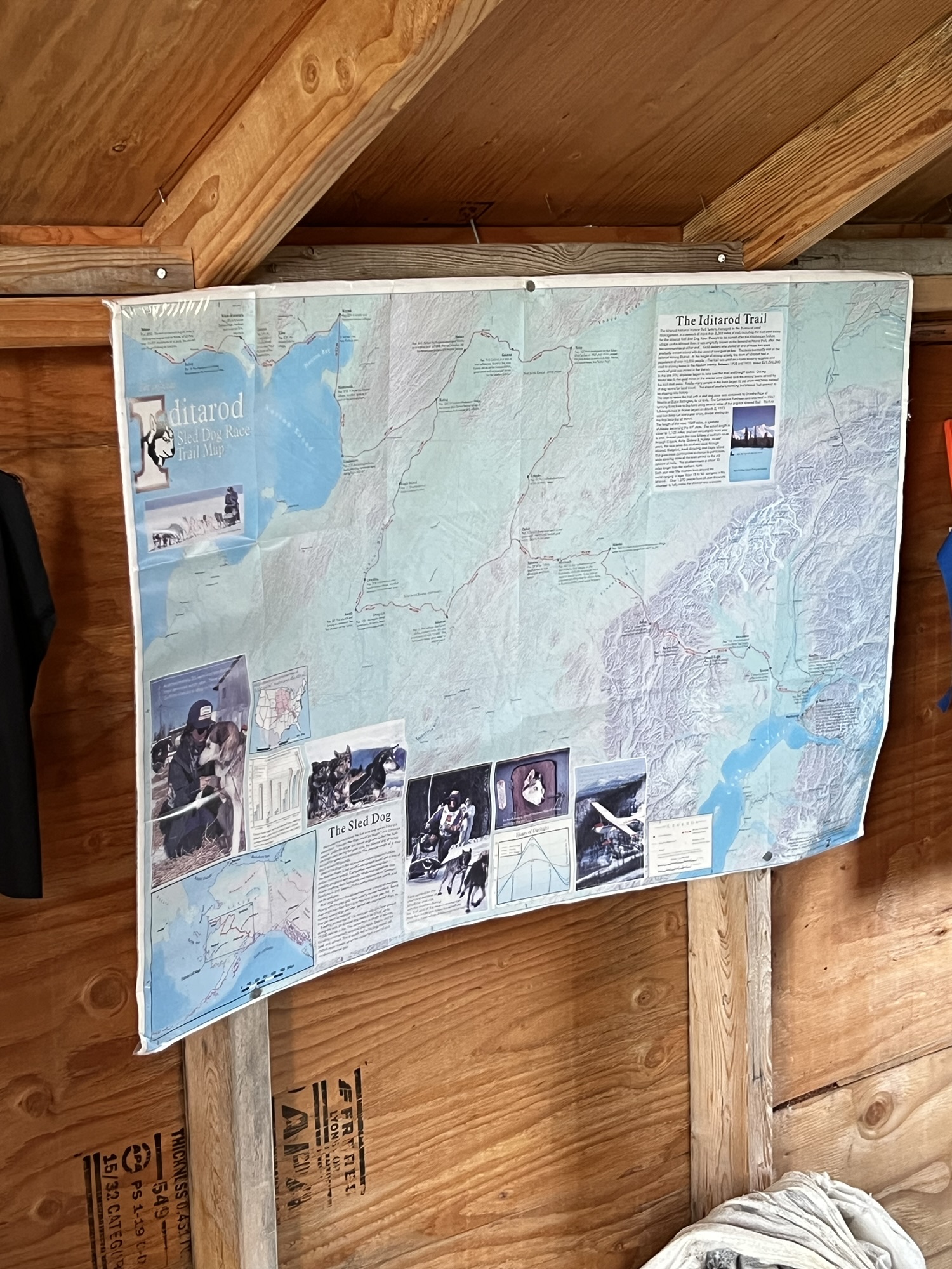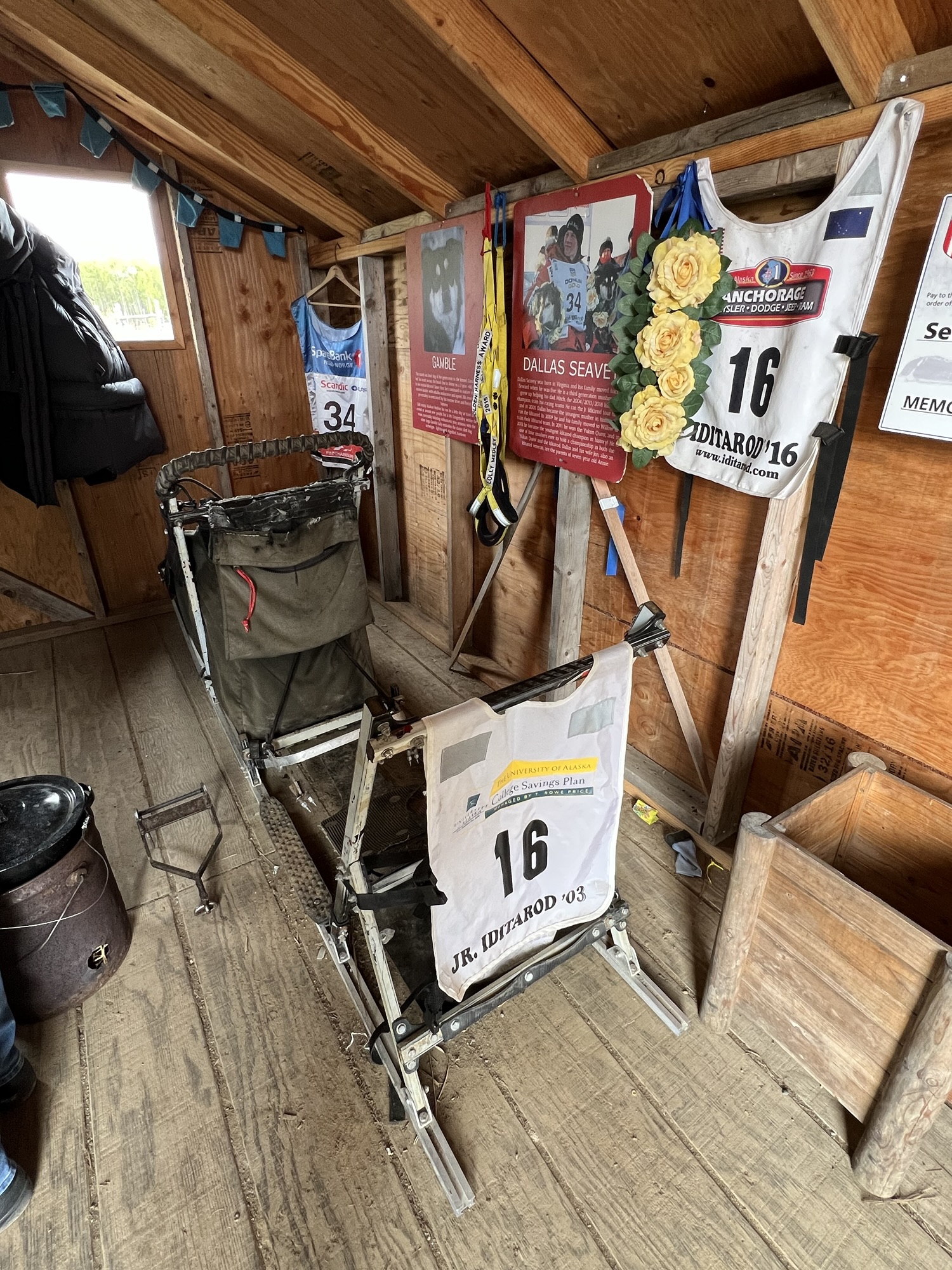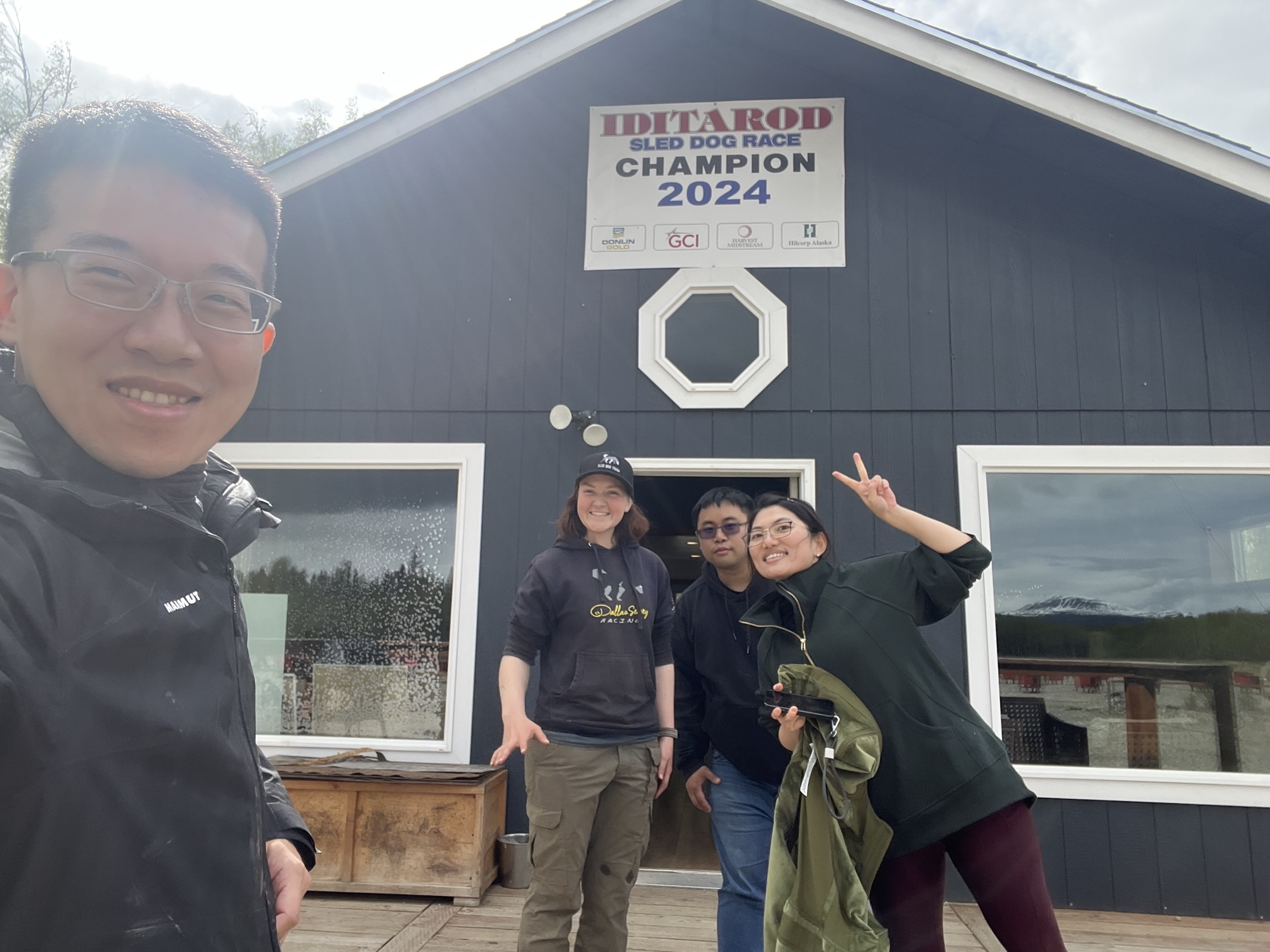 待第一批人先出發後,飼育員帶我們去狗園和狗狗認識一下,這邊的狗都很社會化,看到人會先稍微靠近跟你打招呼,稍微摸摸下巴蹭蹭後才會變得比較興奮,但還是有幾隻過度興奮直接站起來的,推人的力道也是很紮實啊!之後我們還看了剛生出來沒幾週的一窩小狗和正在餵奶的狗媽媽,然後進到一個木屋裡介紹狗園主人的豐功偉績,原來老闆Dallas Seavey是史上最年輕的狗拉雪橇超馬賽Iditarod冠軍!每年春天阿拉斯加都會舉辦橫越阿拉斯加的狗拉雪橇賽,一個人帶16隻狗,從安克拉治出發到最北端的Nome,花將近兩週走完,中間休息時還要打理各種狗事不太能睡,受傷的狗就留在檢查點讓工作人員帶去治療。老闆25歲拿到第一個冠軍至今居然還贏了六次!神一般的存在!