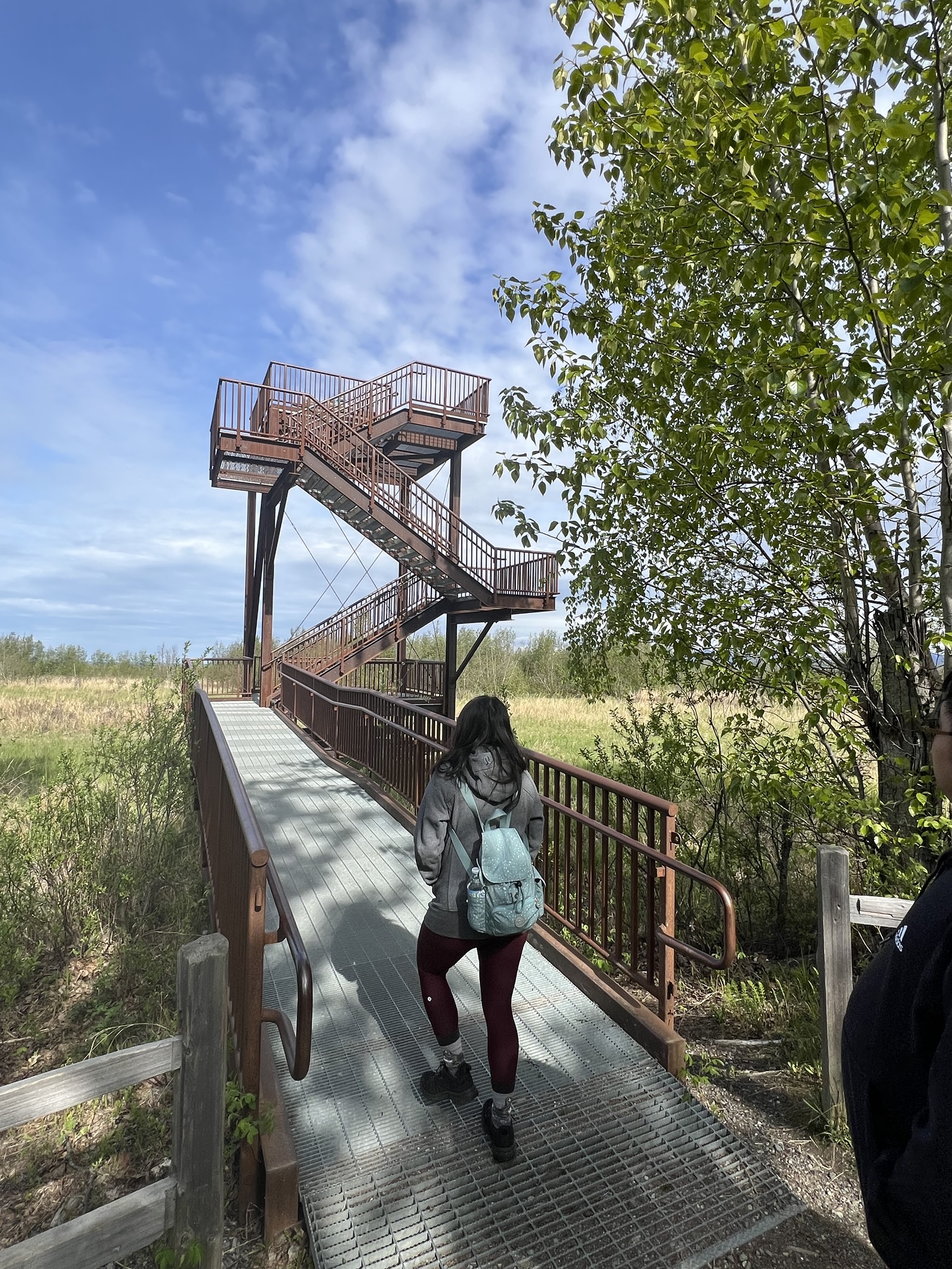 開了一個小時,先在海岸邊的一塊濕地步道走走,步道環繞著一座小湖,湖上零零星星的幾隻水鳥。走到湖的對岸有座三層樓高的眺望台,原以為會看到海,沒想到海還在蠻遠的地方,四周只是一大片的草原。回到湖岸邊,泥灘上長著一根根很像珠蔥的植物,湖面映著積雪的山脈及山頂上一坨坨棉絮狀的雲朵,很令人放鬆。