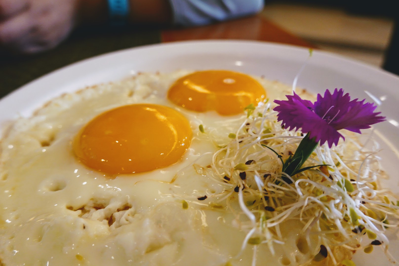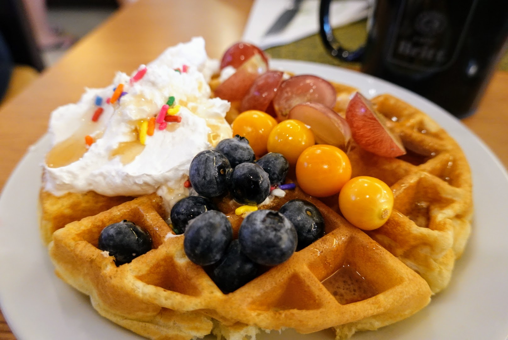 早餐在飯店的一樓酒吧用餐,服務生告訴我們能使用的自助吧區域,不包含熱食的餐檯,只能用麵包、牛奶、蛋、水果的部分。畢竟是免費送的,而且有蛋可吃(而且還是現做的蛋料理),還有自製鬆餅機和水果,光這樣吃就很爽了(還吃超飽),沒什麼可挑剔的。