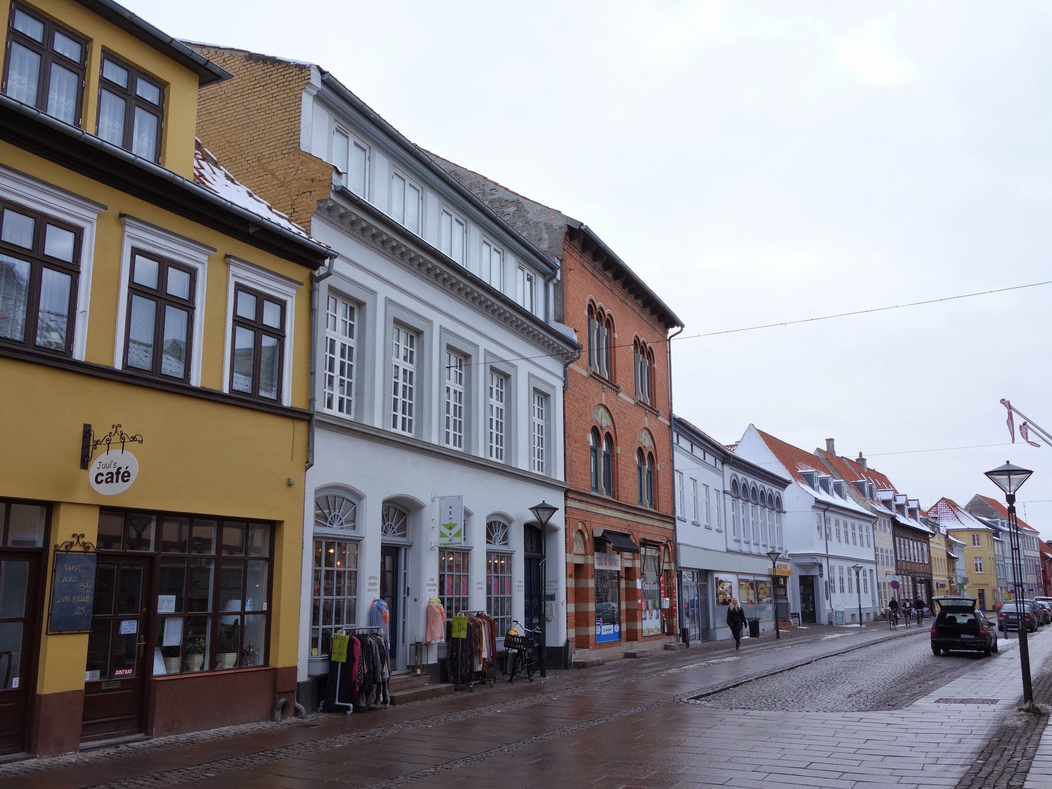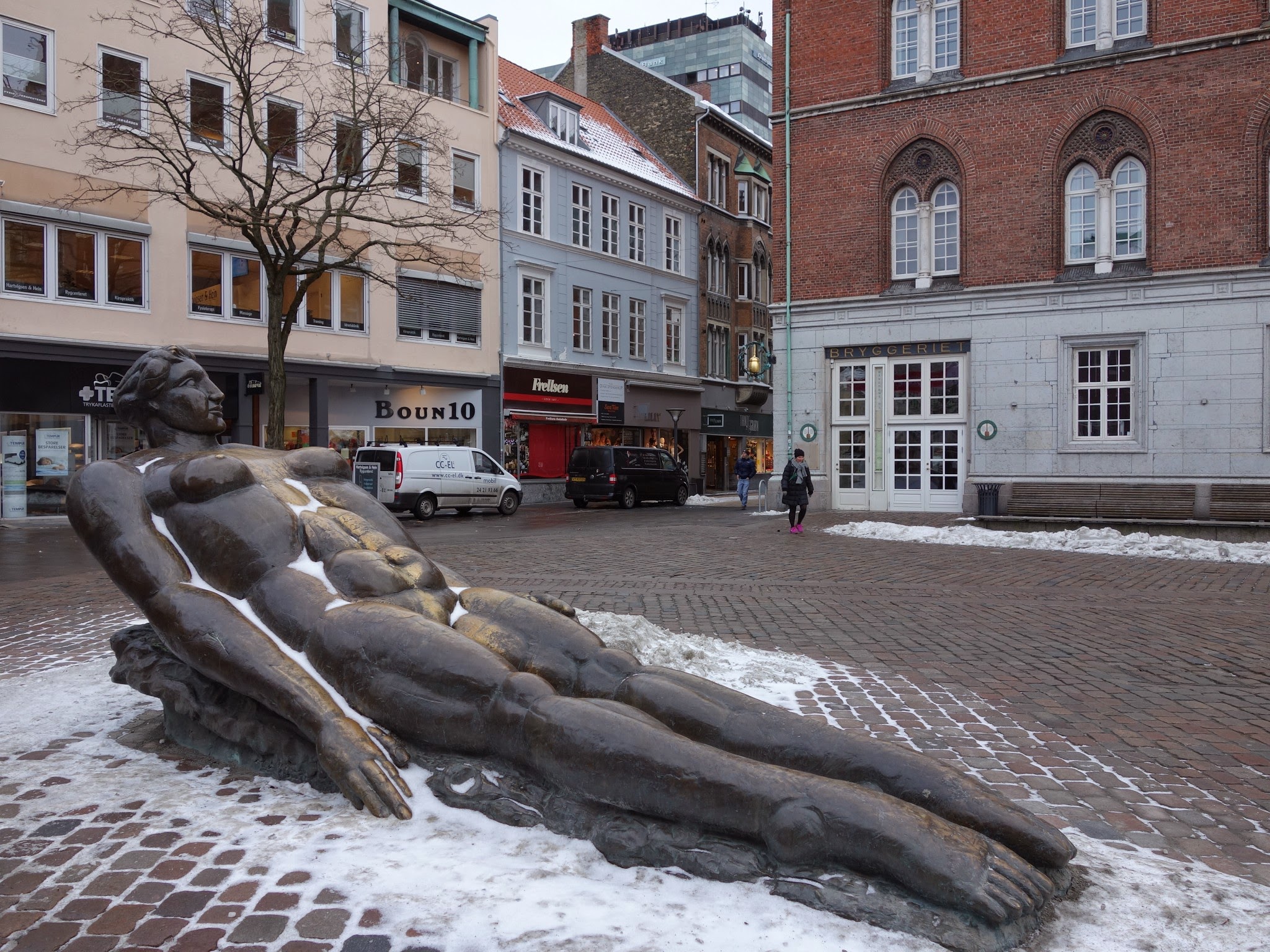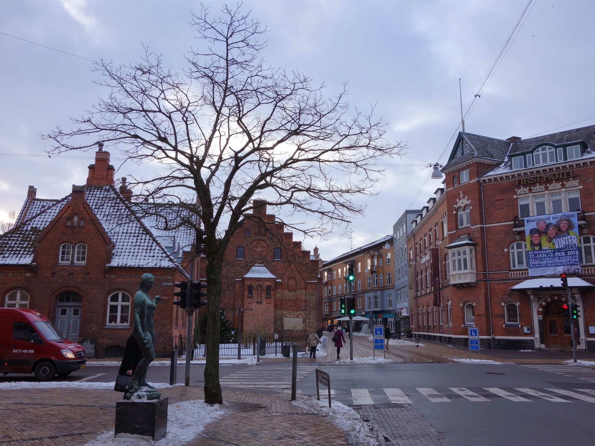約莫一個小時的車程,九點多抵達Odense。走向安徒生紀念館的路上,不時可以看見各種青銅塑像,多半都不是很明白他們代表的意義。街道上沒什麼人,禿了的枝椏和兩旁紅磚色的平房,樓房多半不超過四層,屋頂上積著薄薄的雪;四處晃蕩也是愜意。