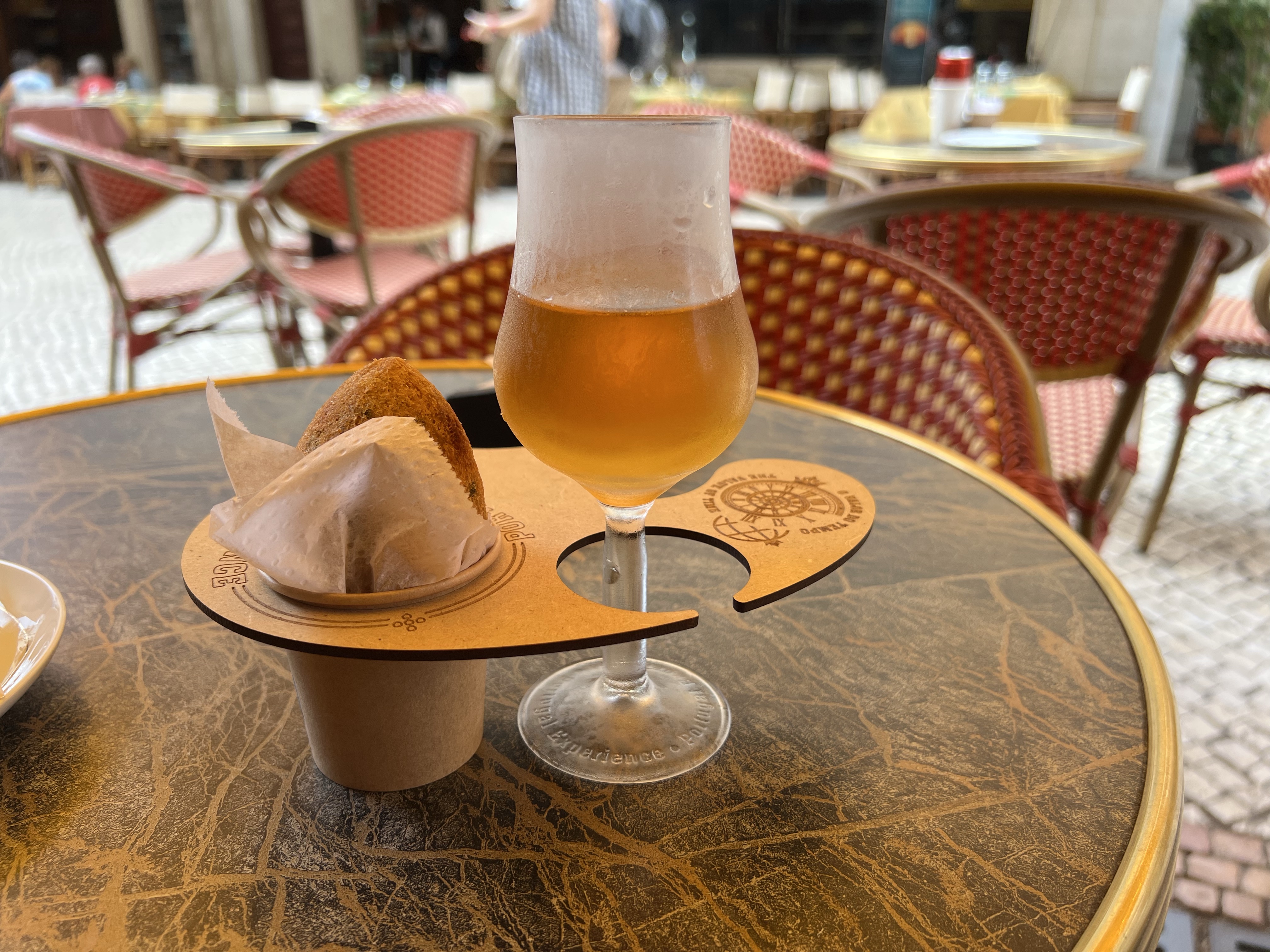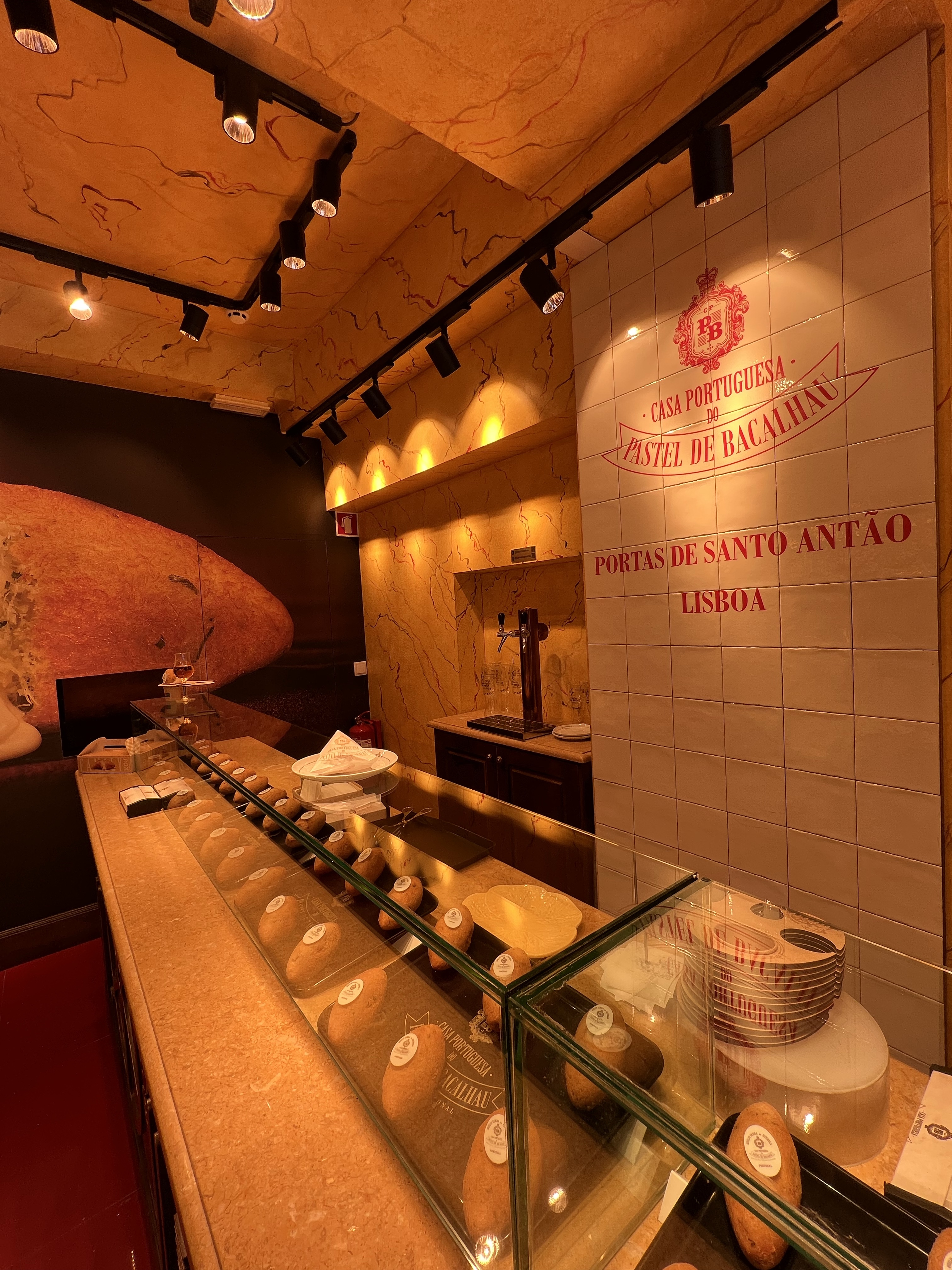 今天要去貝倫塔!但不管怎樣還是睡到快中午才出門,走路去地鐵站的路上看到一間散發著金黃光芒的店,賣一顆炸的碎鱈魚肉丸,裡面可選要不要加起司,覺得特別就買一顆來吃吃,還點了店員推銷的某種白酒來配,但吃起來異常普通,配酒也沒什麼特別。吃完店員跟我們說那個玻璃杯是給我們帶回去的,其實我沒有很想拿(因為放行李很麻煩),但茹茹覺得蠻特別的就還是收下了。離開前轉頭一看,隔壁就是我第一天買沙丁魚罐頭的店,兩家根本就是同一間嘛!真的很懂賺觀光客錢啊!
